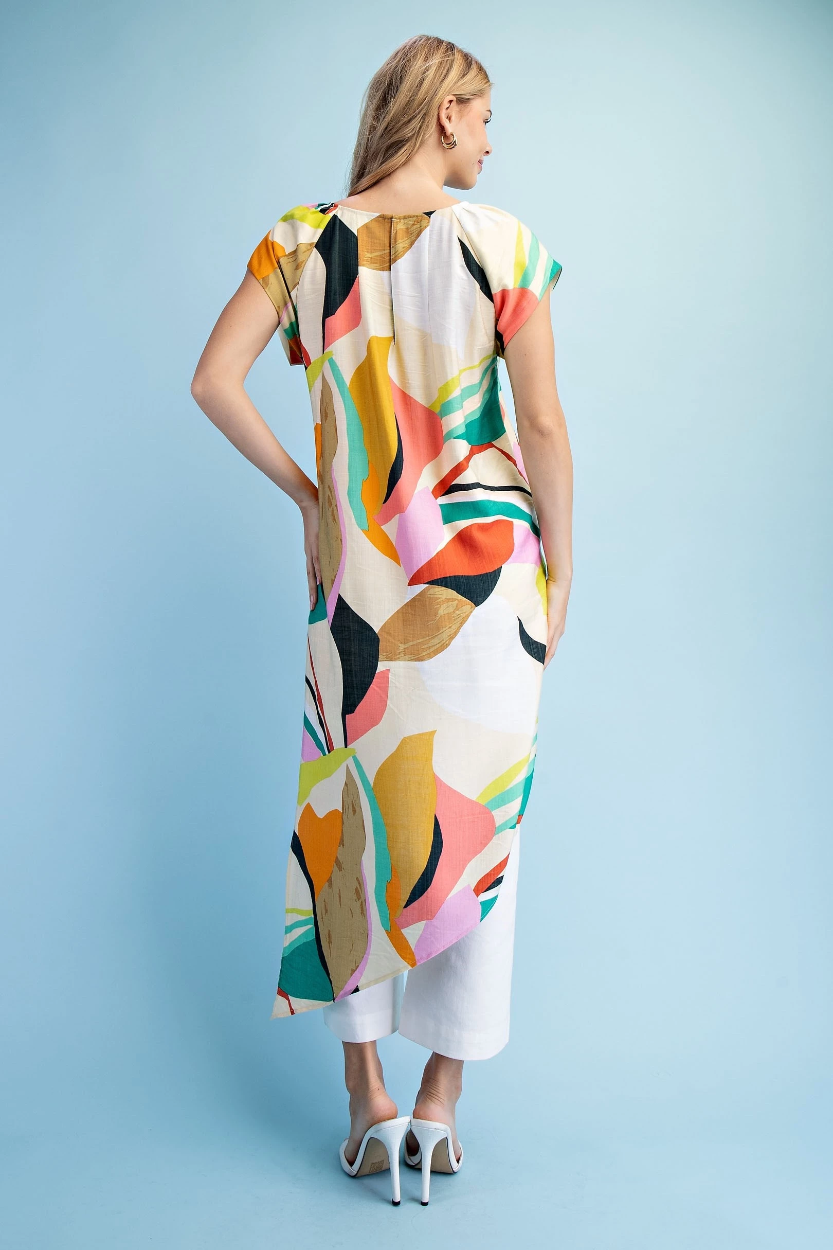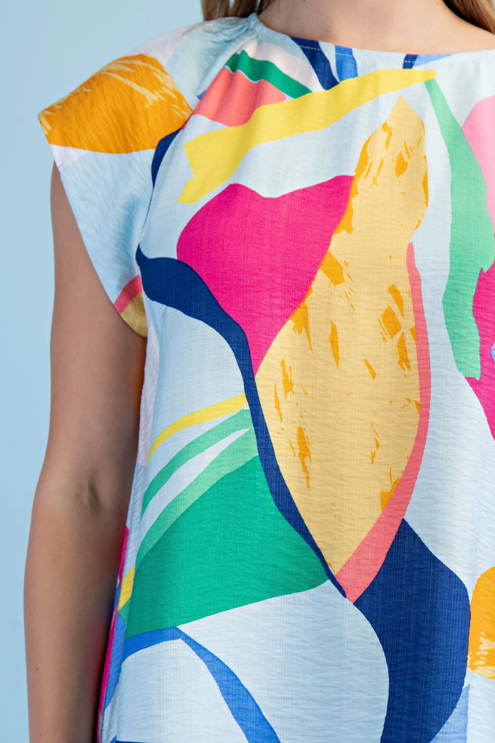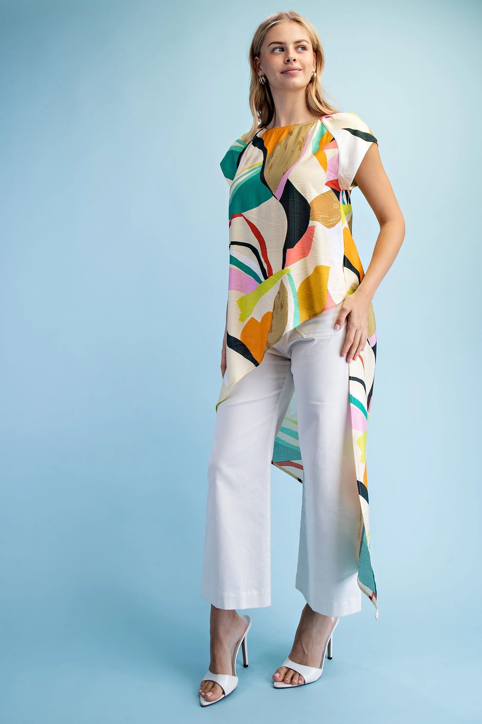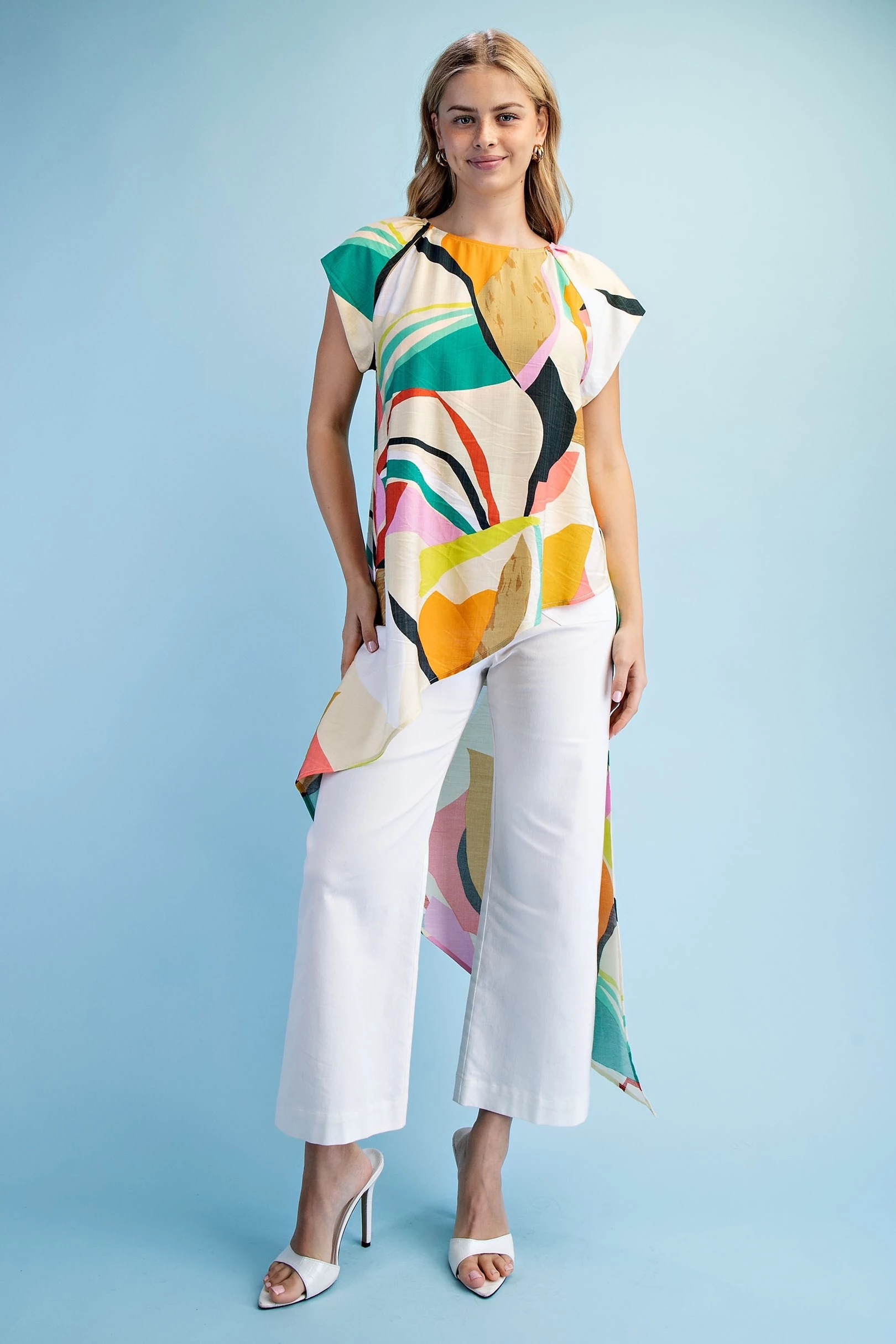Bright Abstract Asymmetrical Pull On Top with Short Sleeves and Crewneck