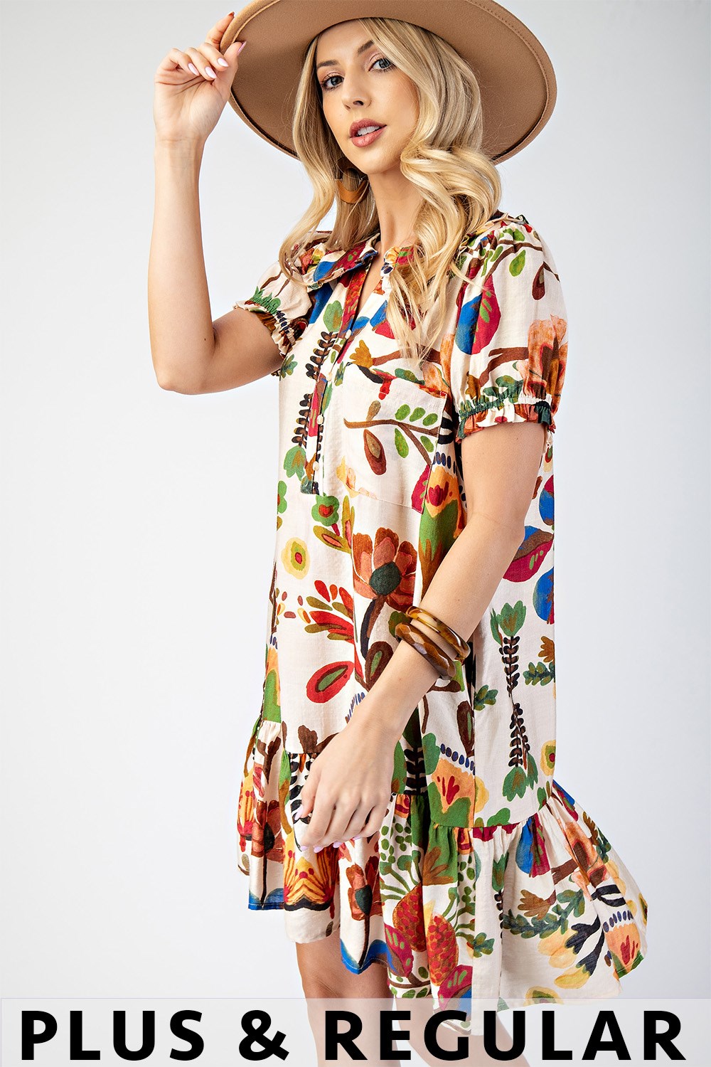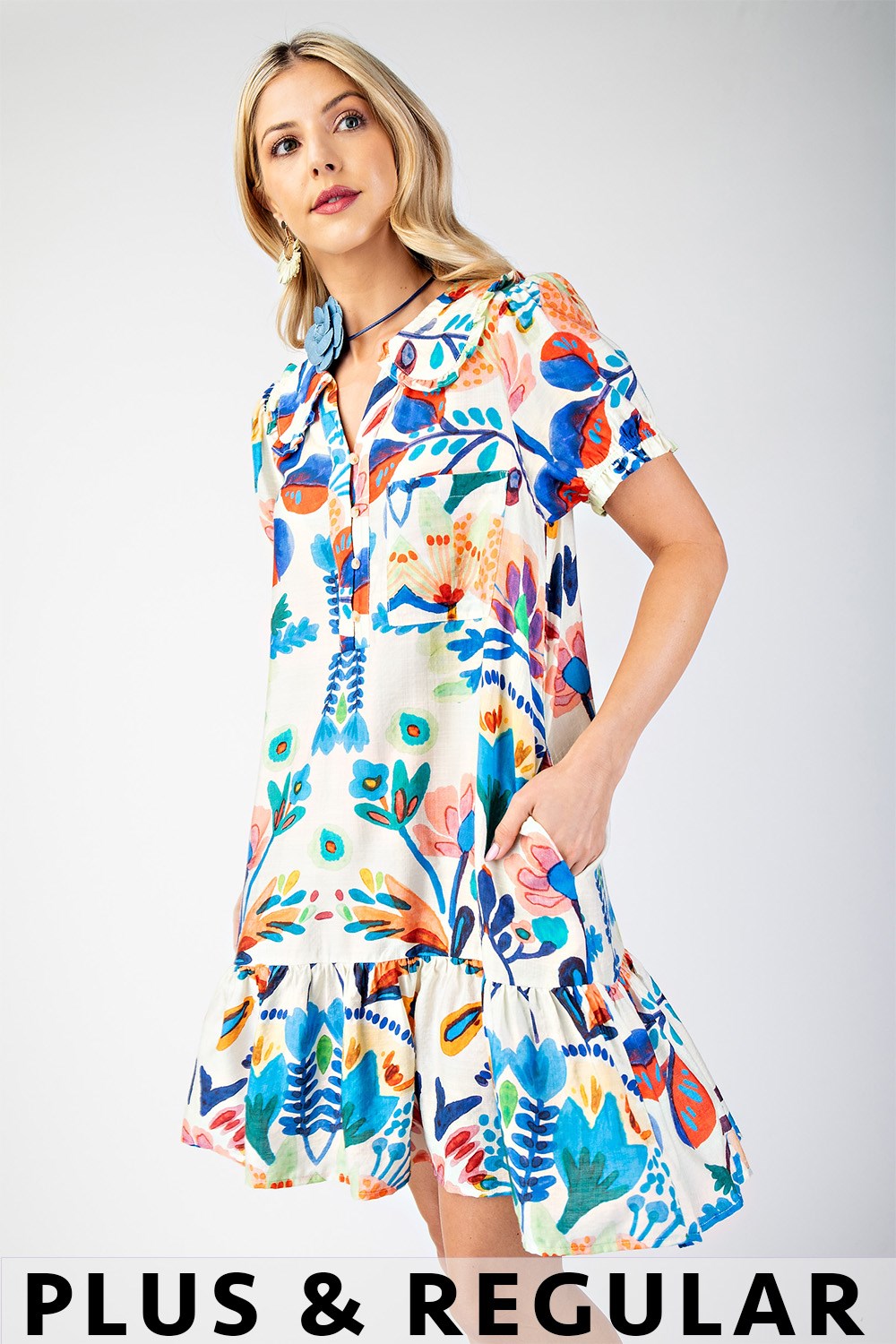 Floral Split Neck Dress with Pleated Detail and Cape Sleeves
