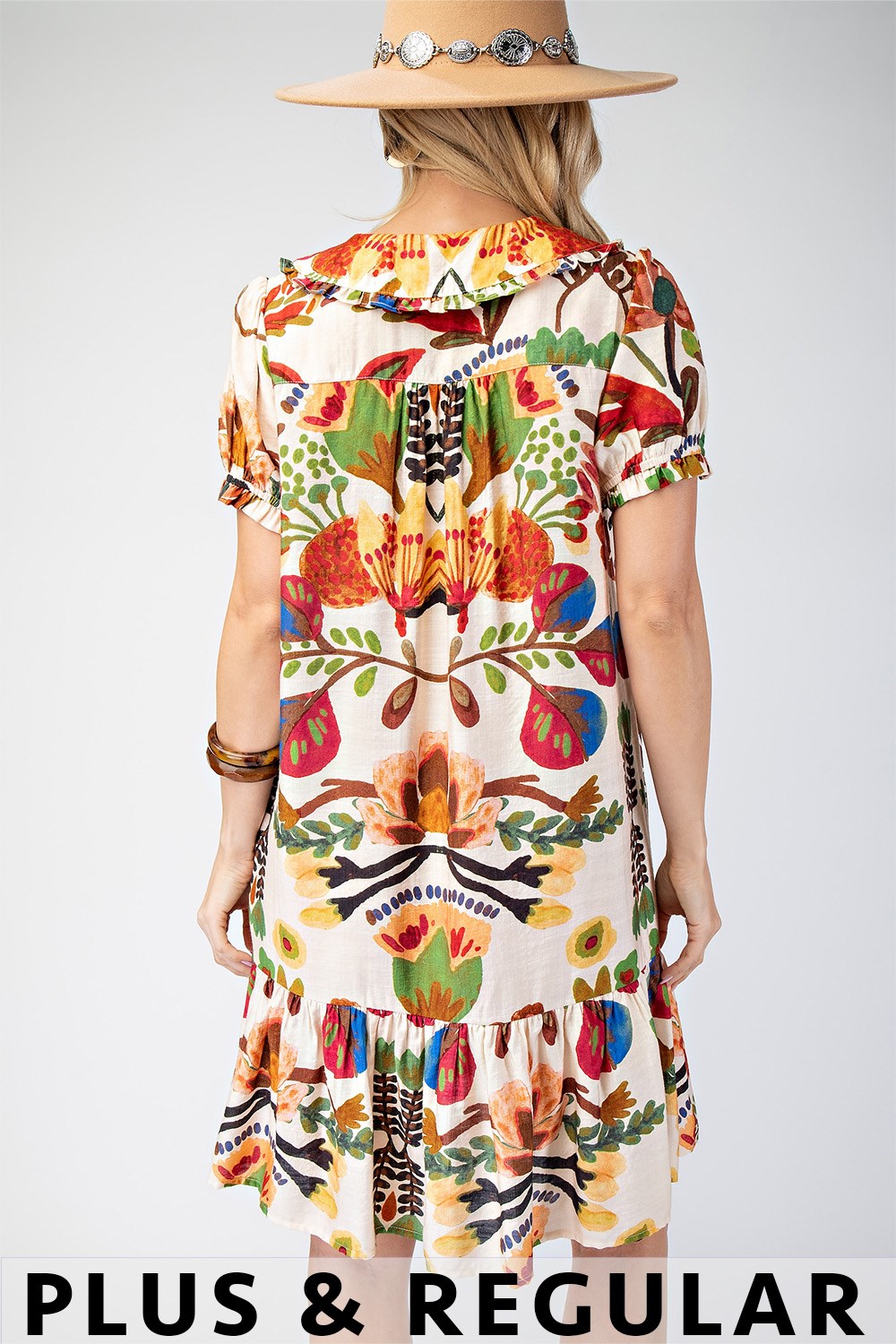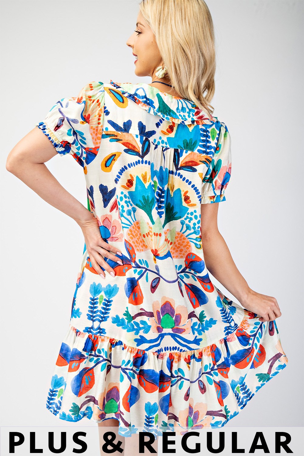 Floral Print Ruffled Neck Mini Dress with Contrasting Stripe Accents and Layered Ruffle Sleeves. The Skirt is Lined