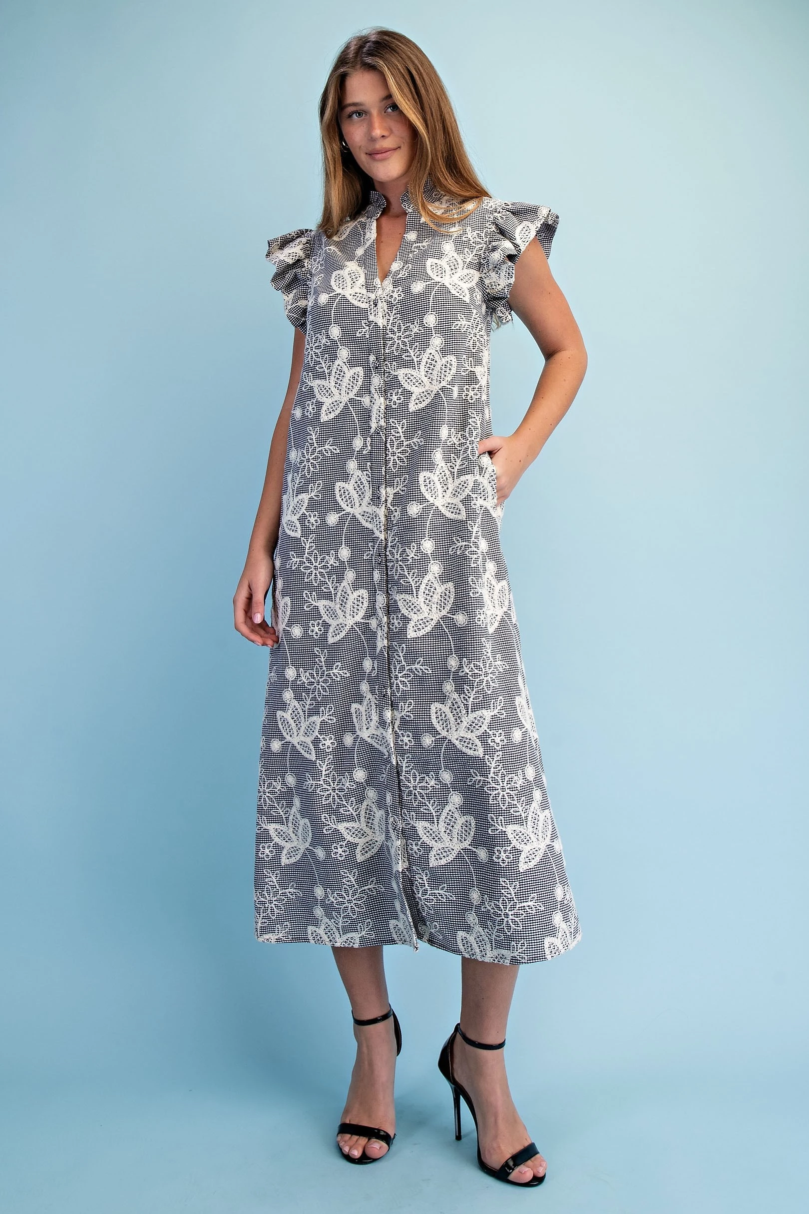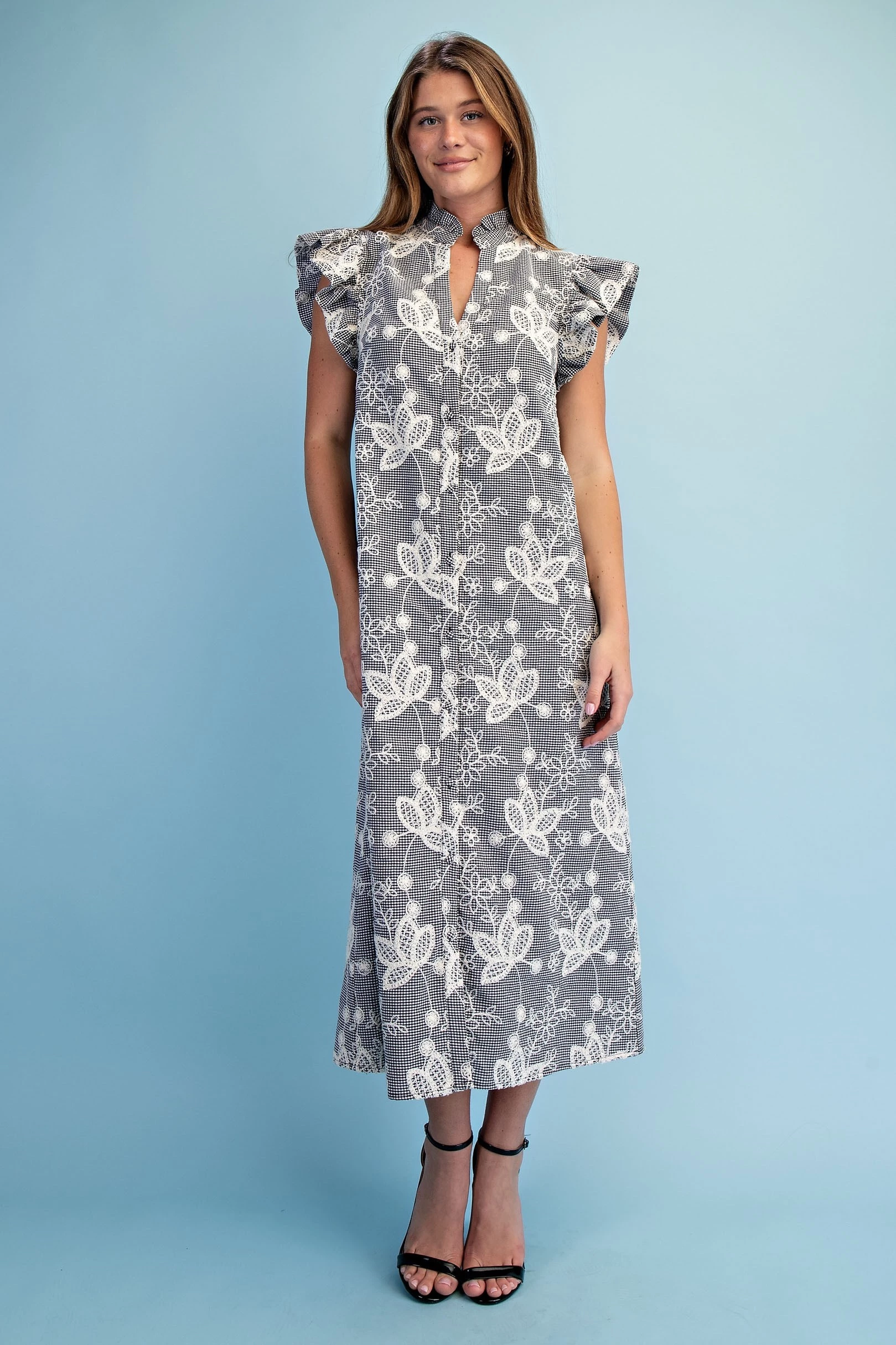 Linen V-Neck Dress with Embroidered AppliquΓ© Design Details. The Dress is Lined