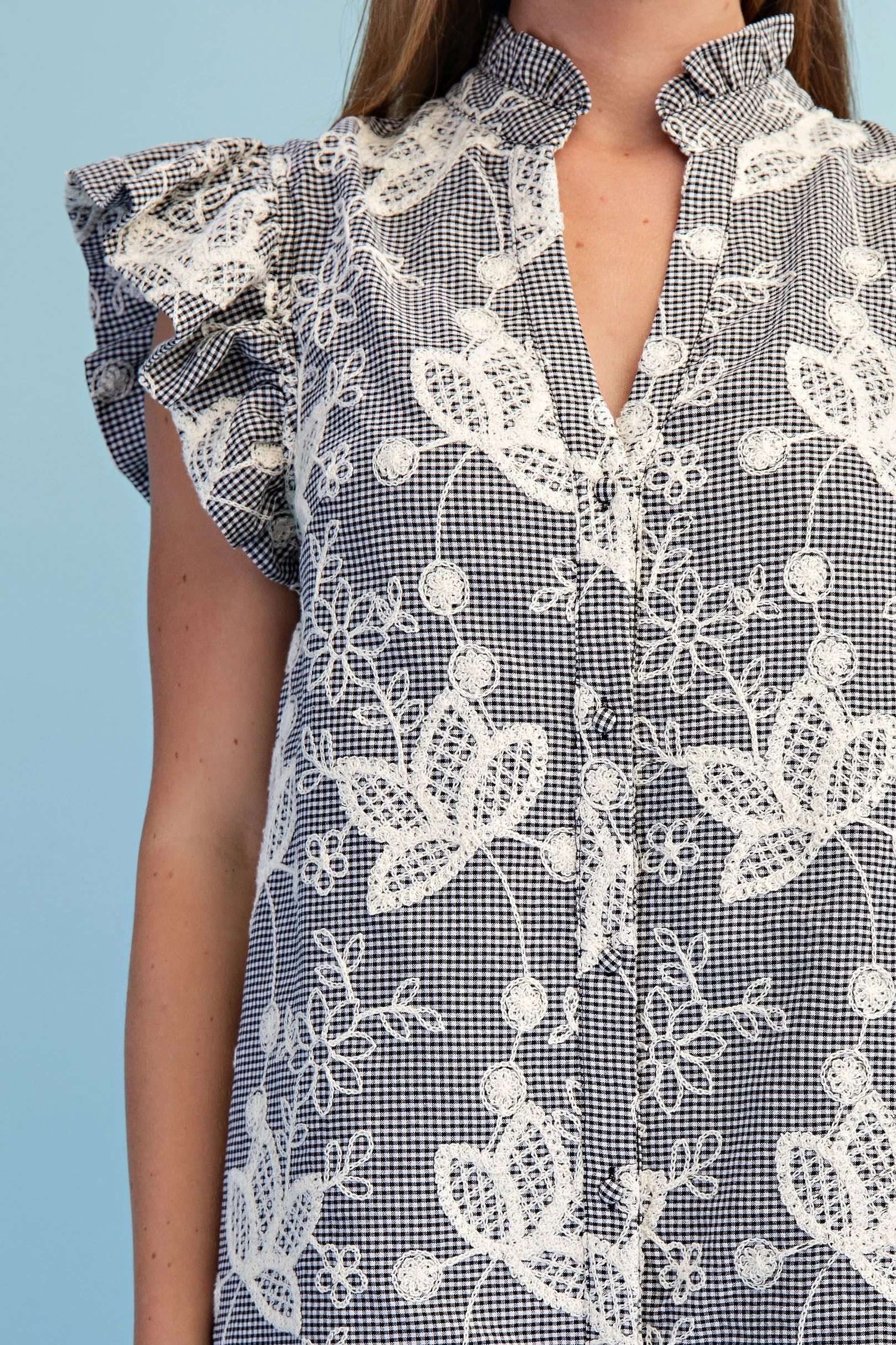 Eyelet V-Neck Mini Dress with a Ruffle Sleeve and Trimmed Neck. The Dress is Lined
