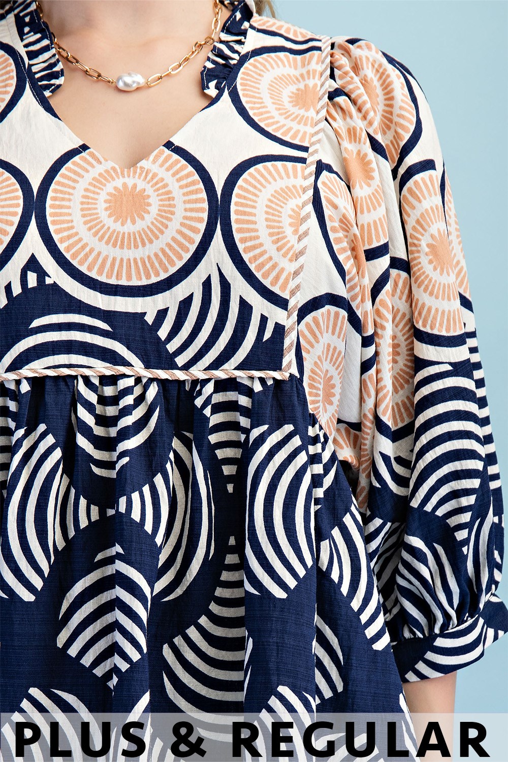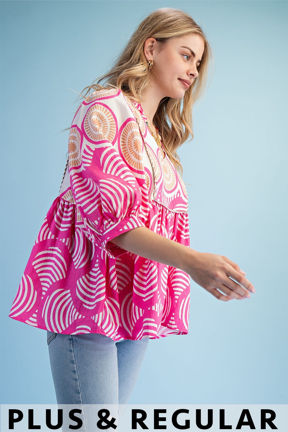 Printed Button Down Top with 3/4 Length Gathered Balloon Sleeves