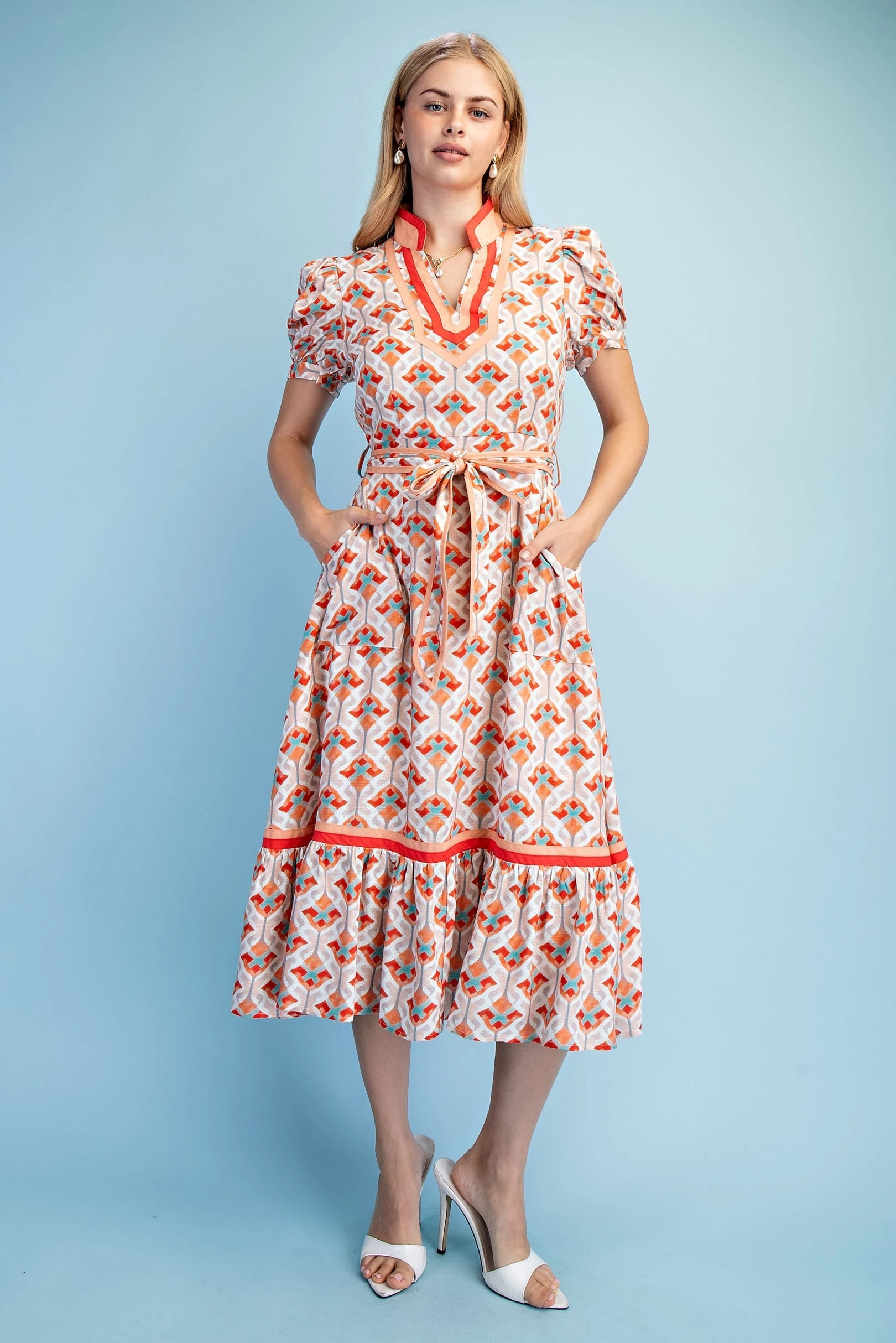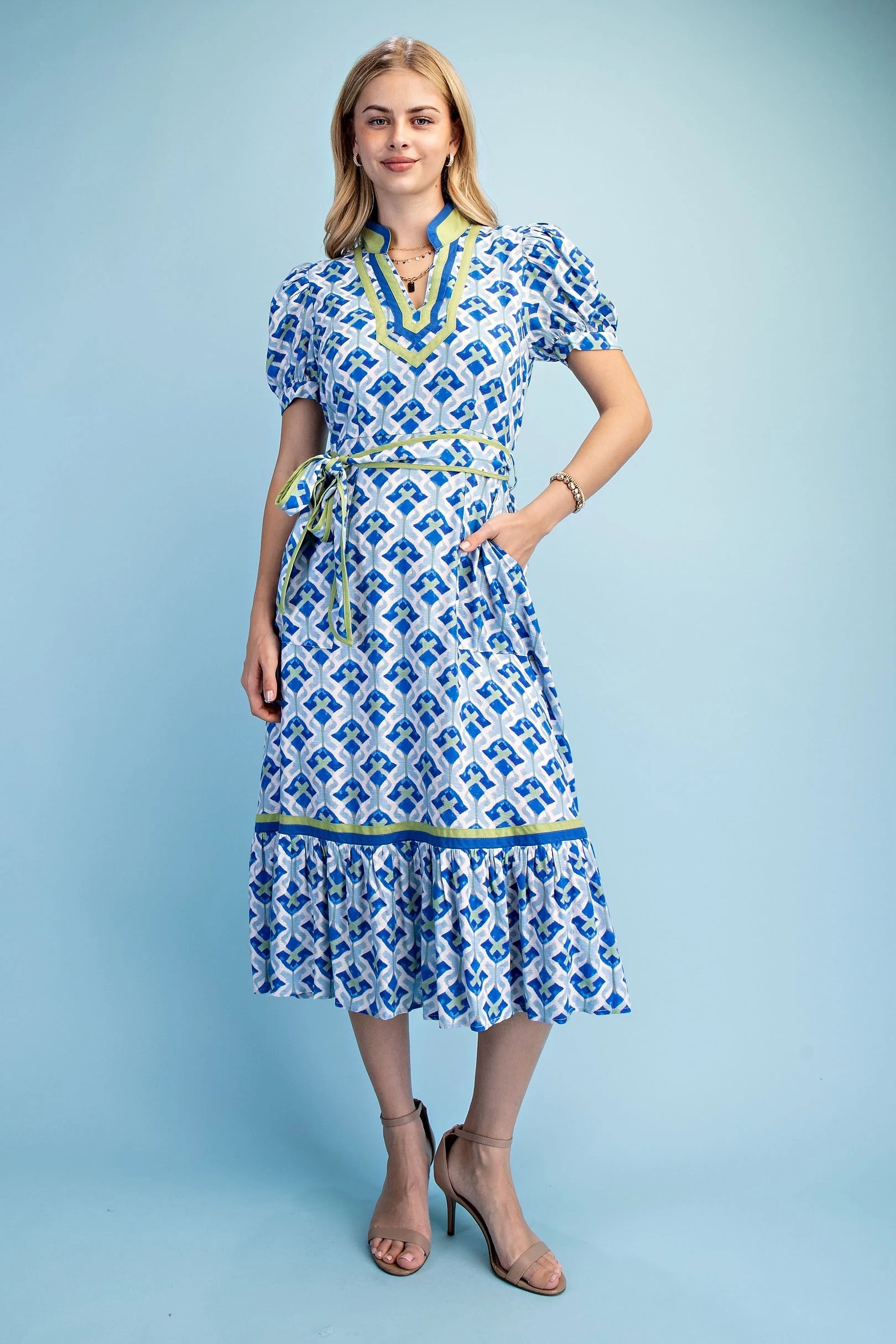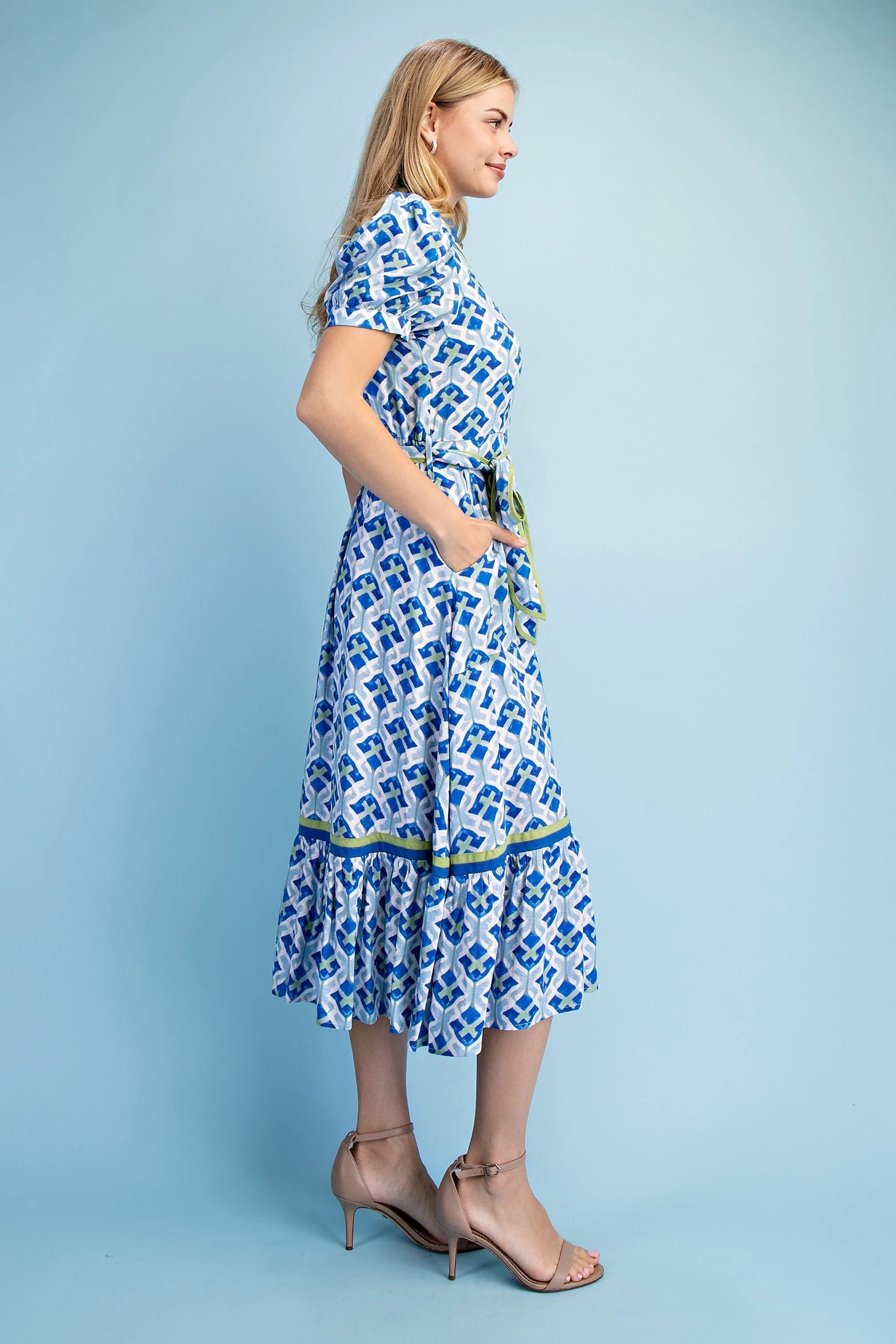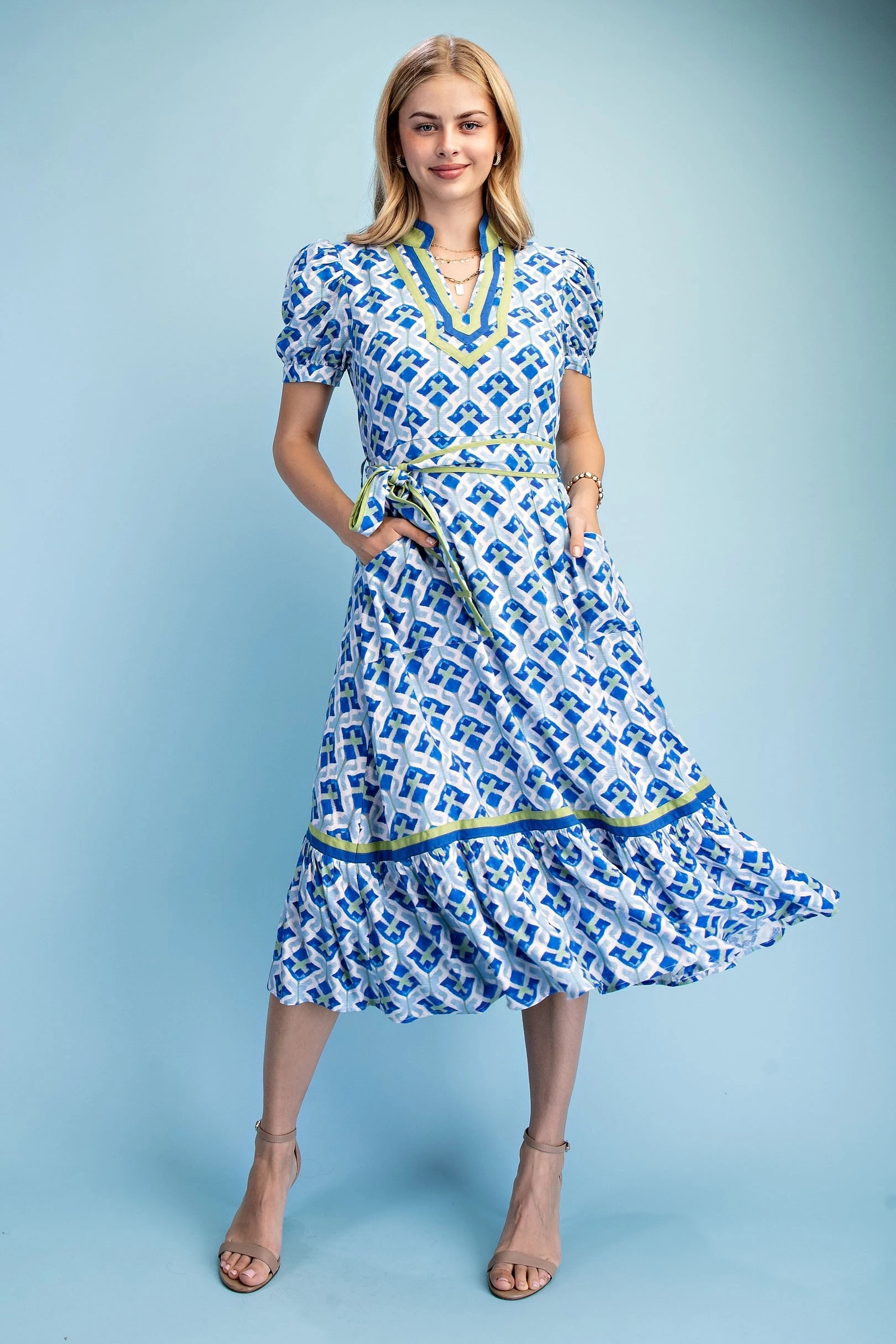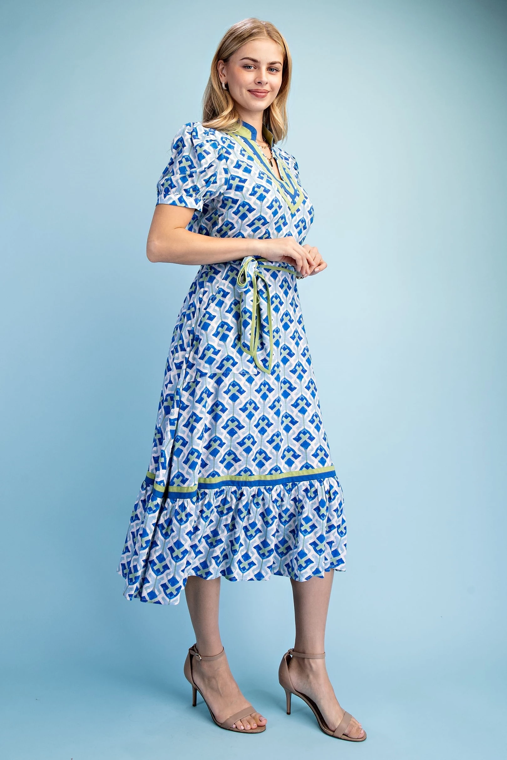 Short Bubble Sleeve Tired Midi Dress with Waist Tie