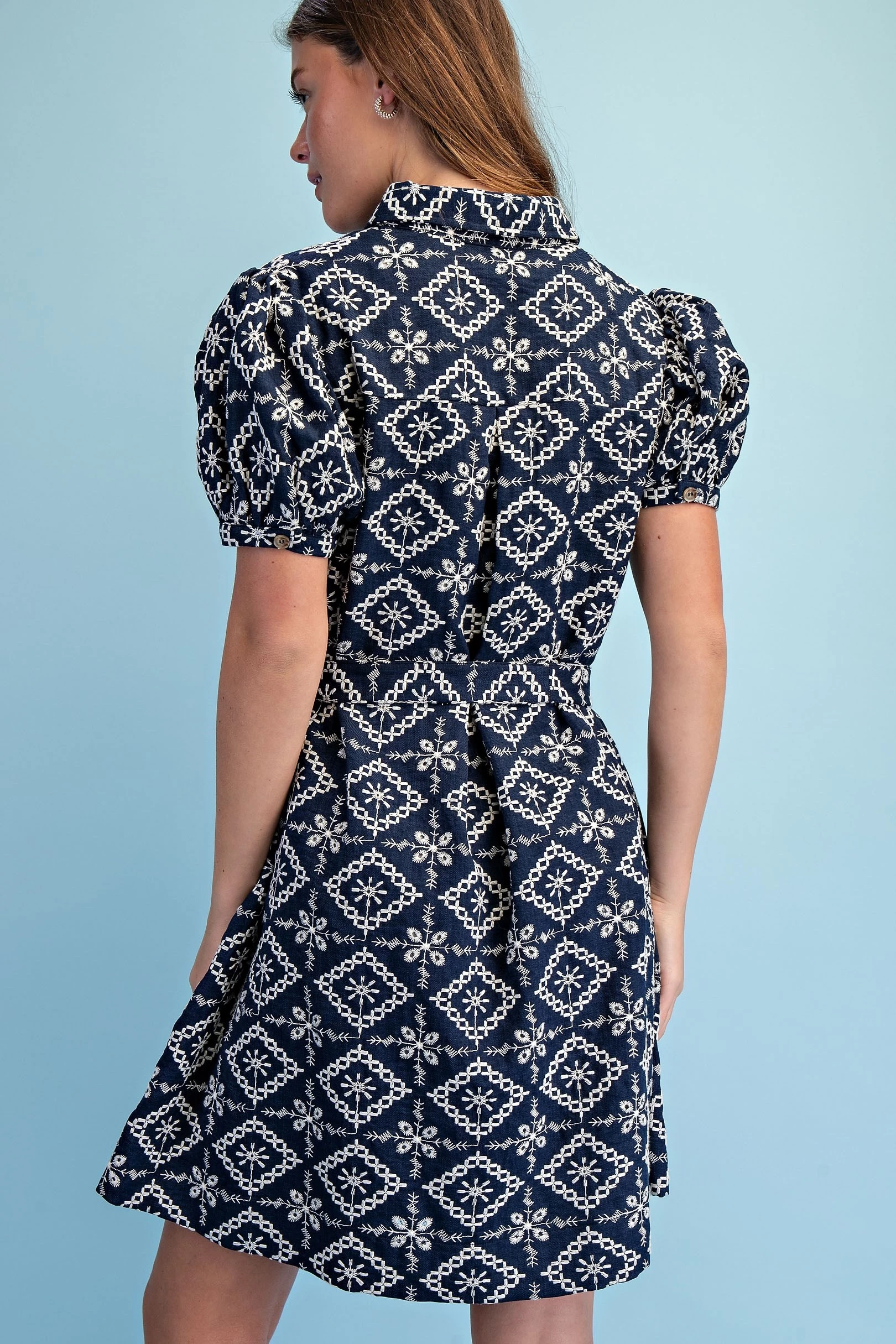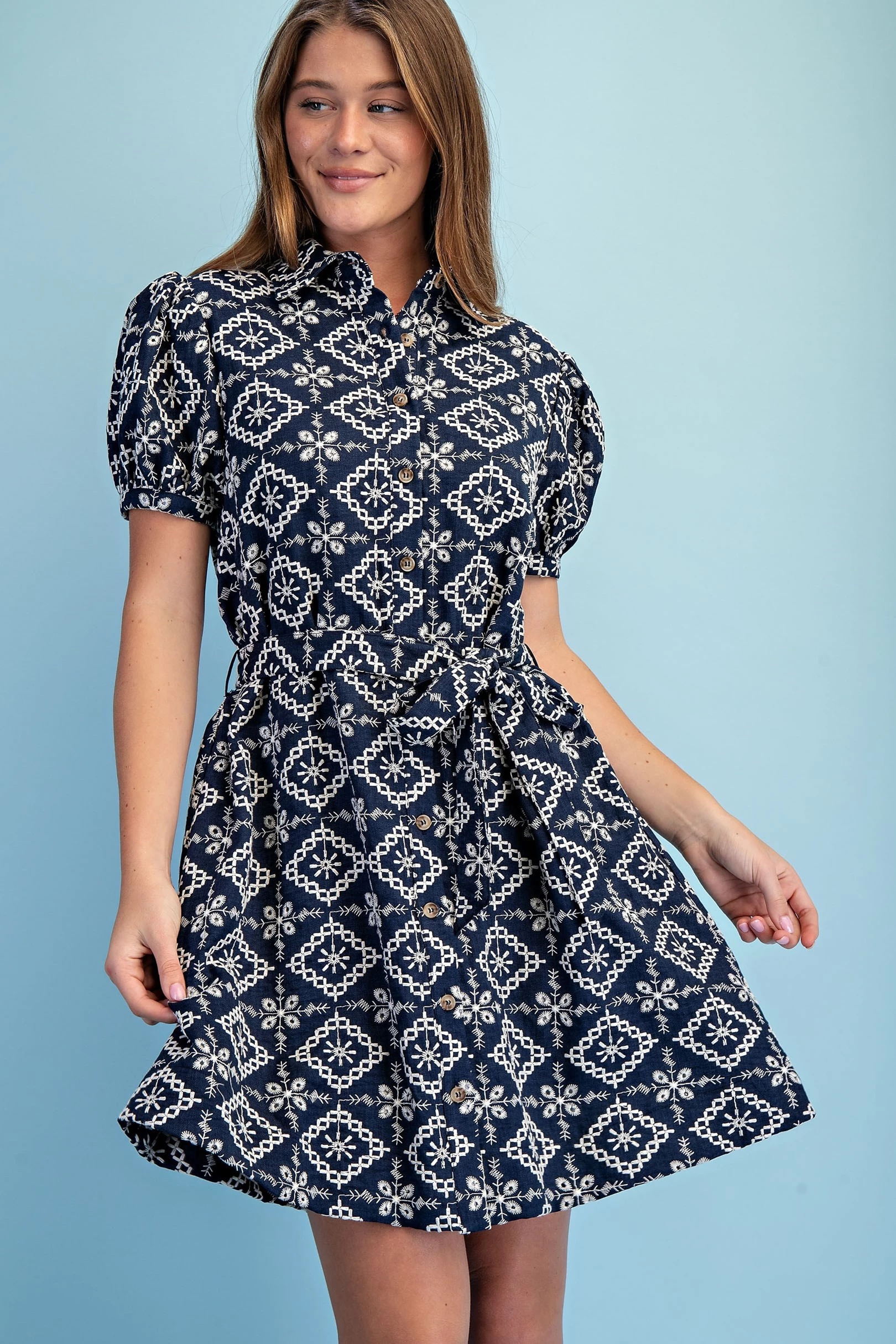 Textured Shirt Dress with Smocked Side Waist Details and Short Puff Sleeves