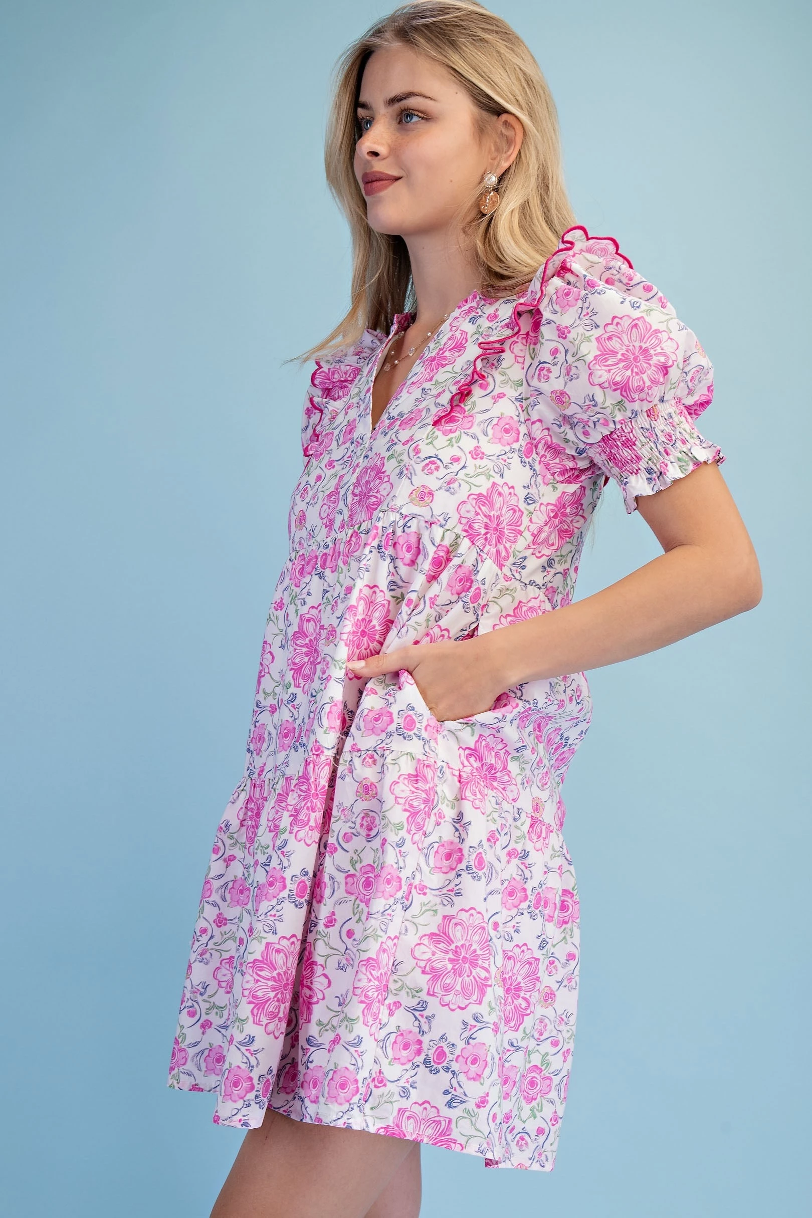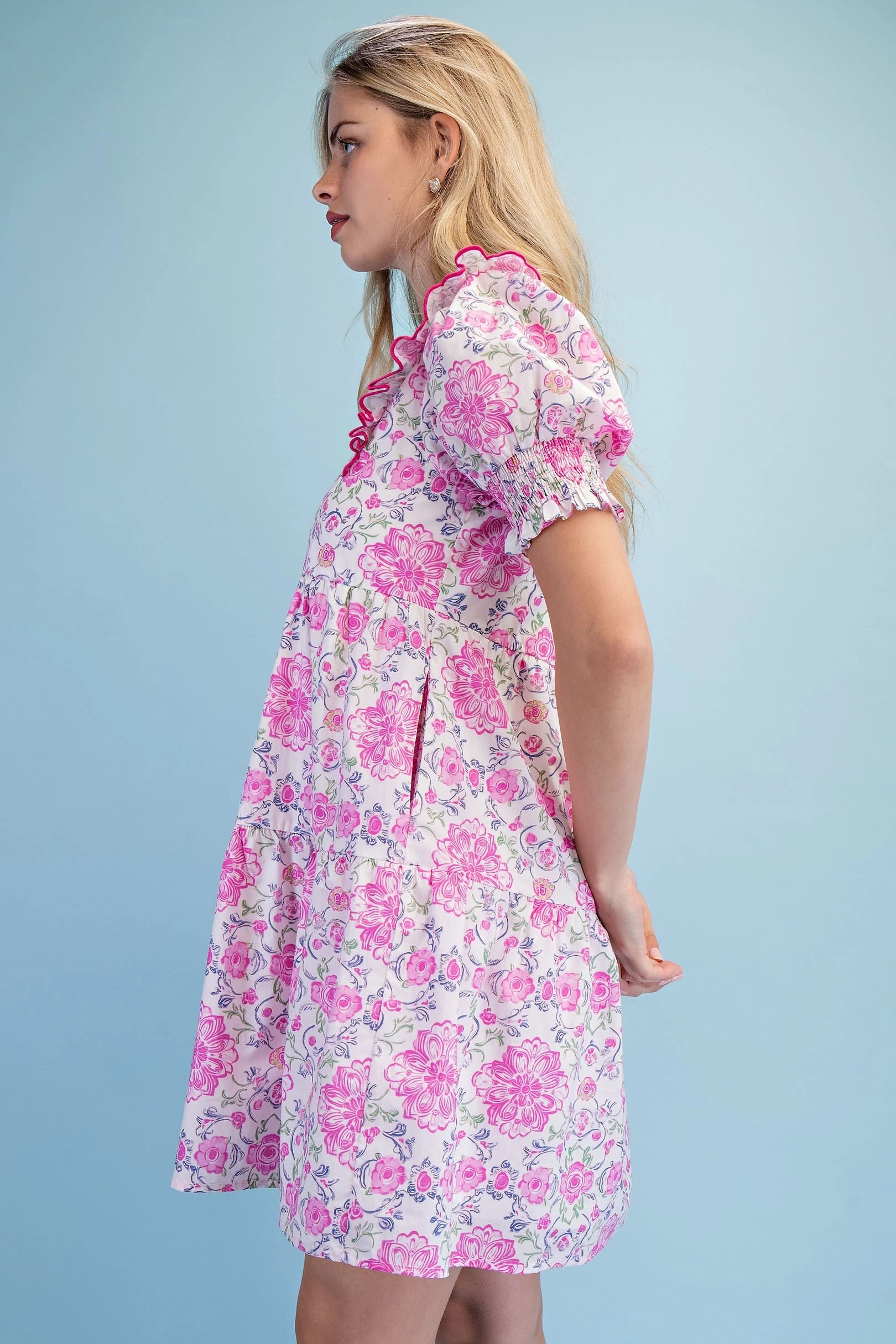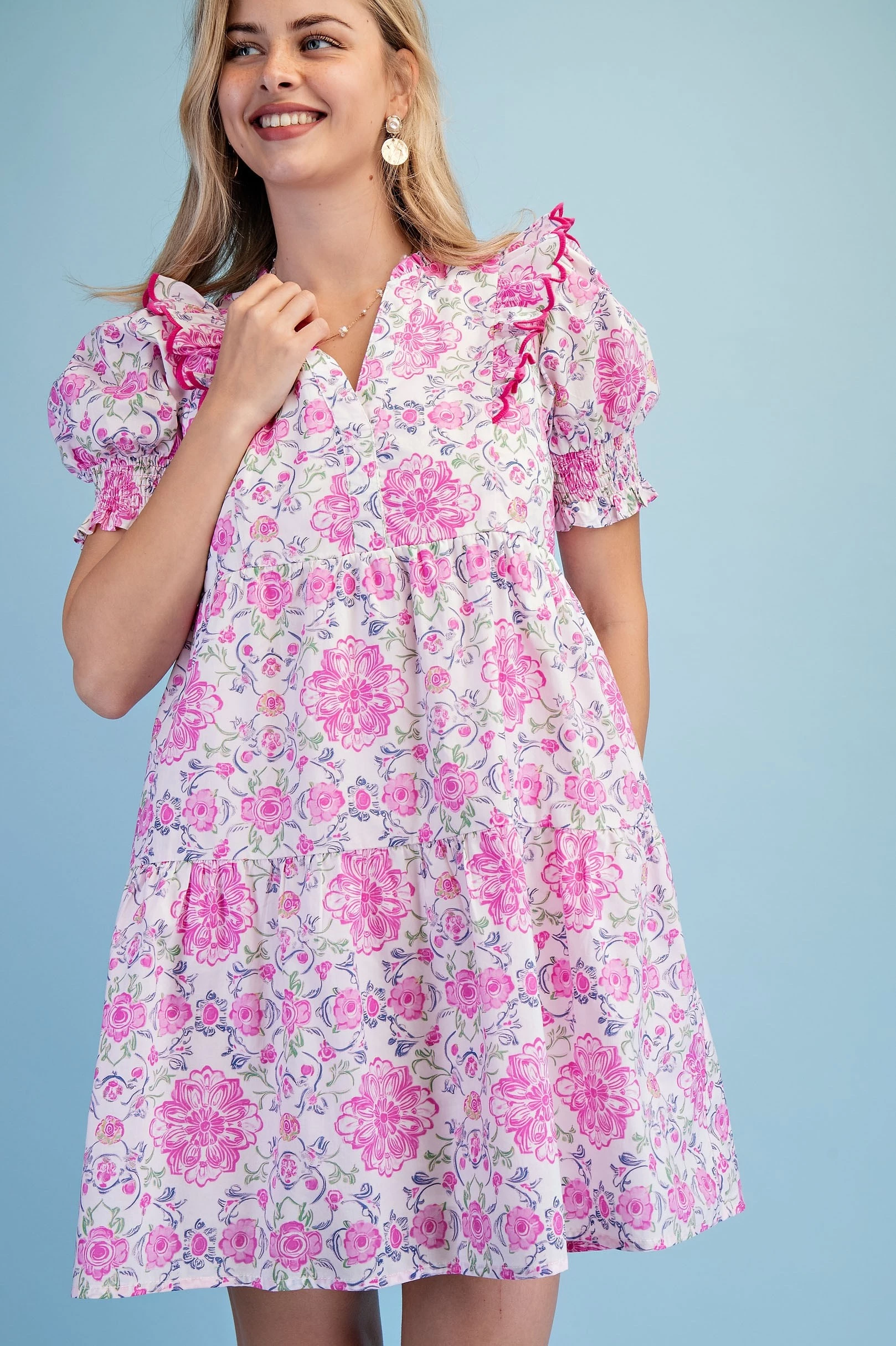 Printed Notch Neck Dress with Gathered Short Balloon Sleeves and Ric-Rac Trim Details.