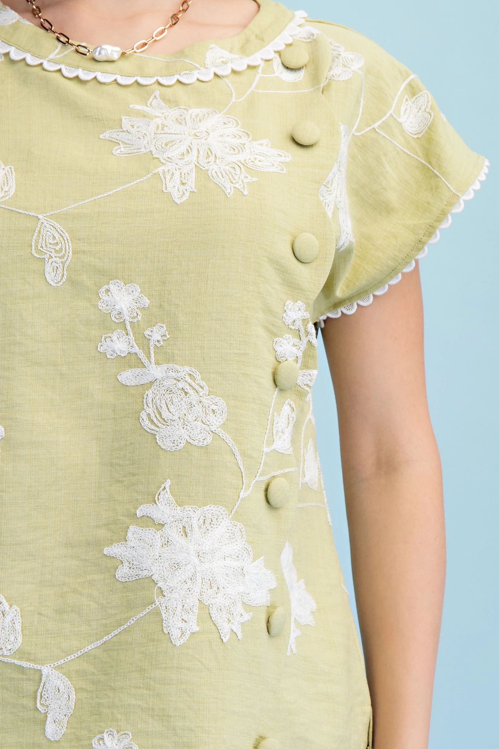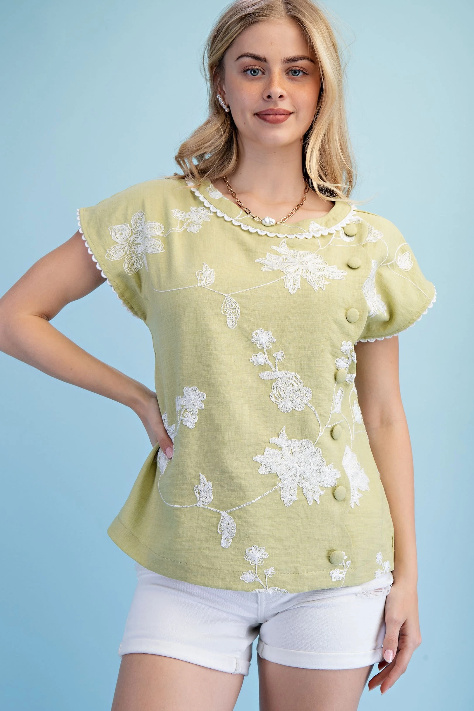 Floral 3D Appliqué and Embroidered V-Neck Top with a Covered Button Placket and Elastic Banded Sleeves