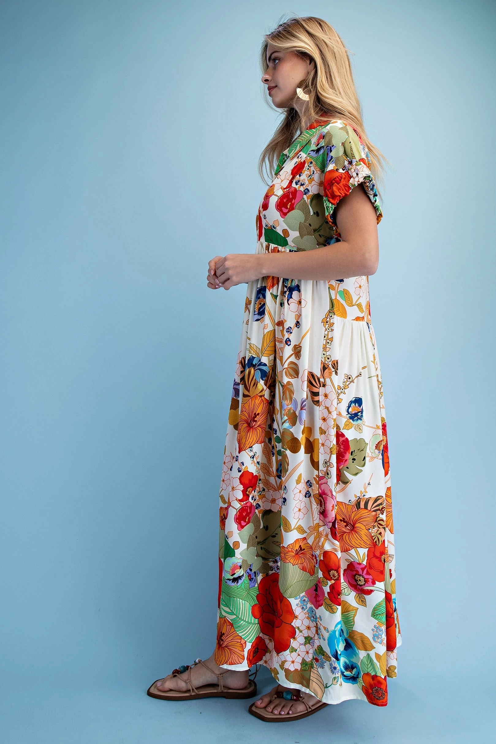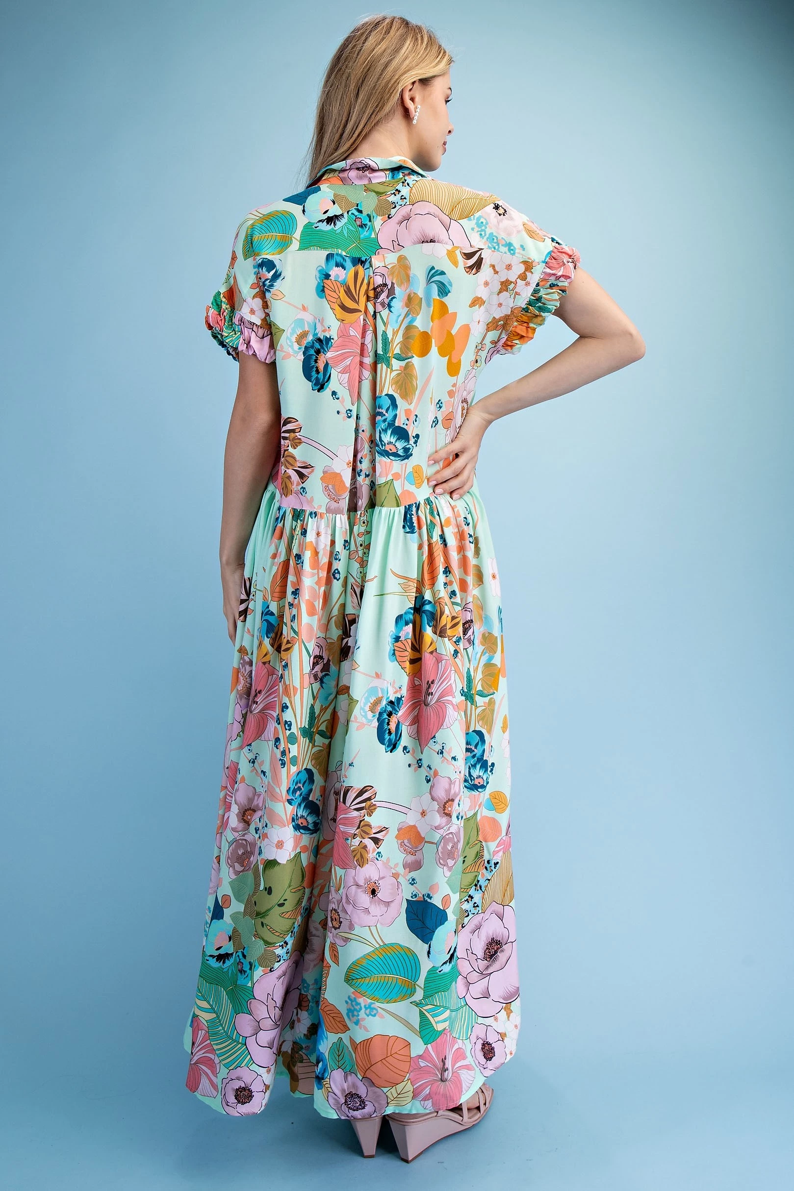 Floral Embroidered Gingham Print Button Down Midi Dress with a Ruffled Collar and Ruffle Sleeves. The Dress is Lined