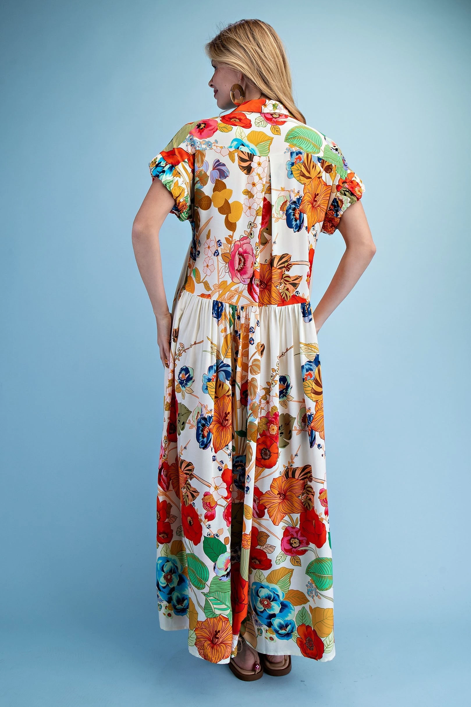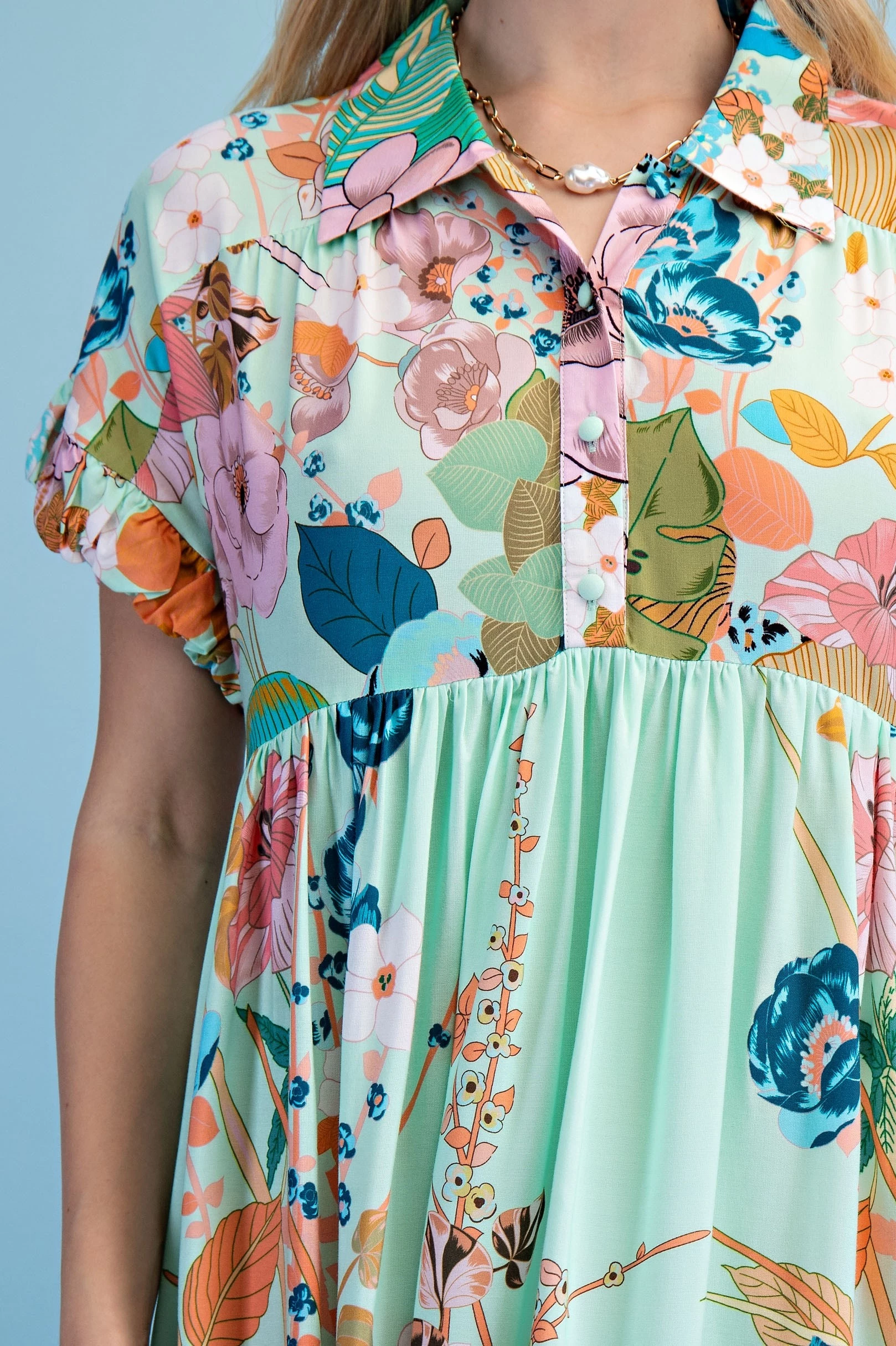 Printed Button Down Top with 3/4 Length Gathered Balloon Sleeves