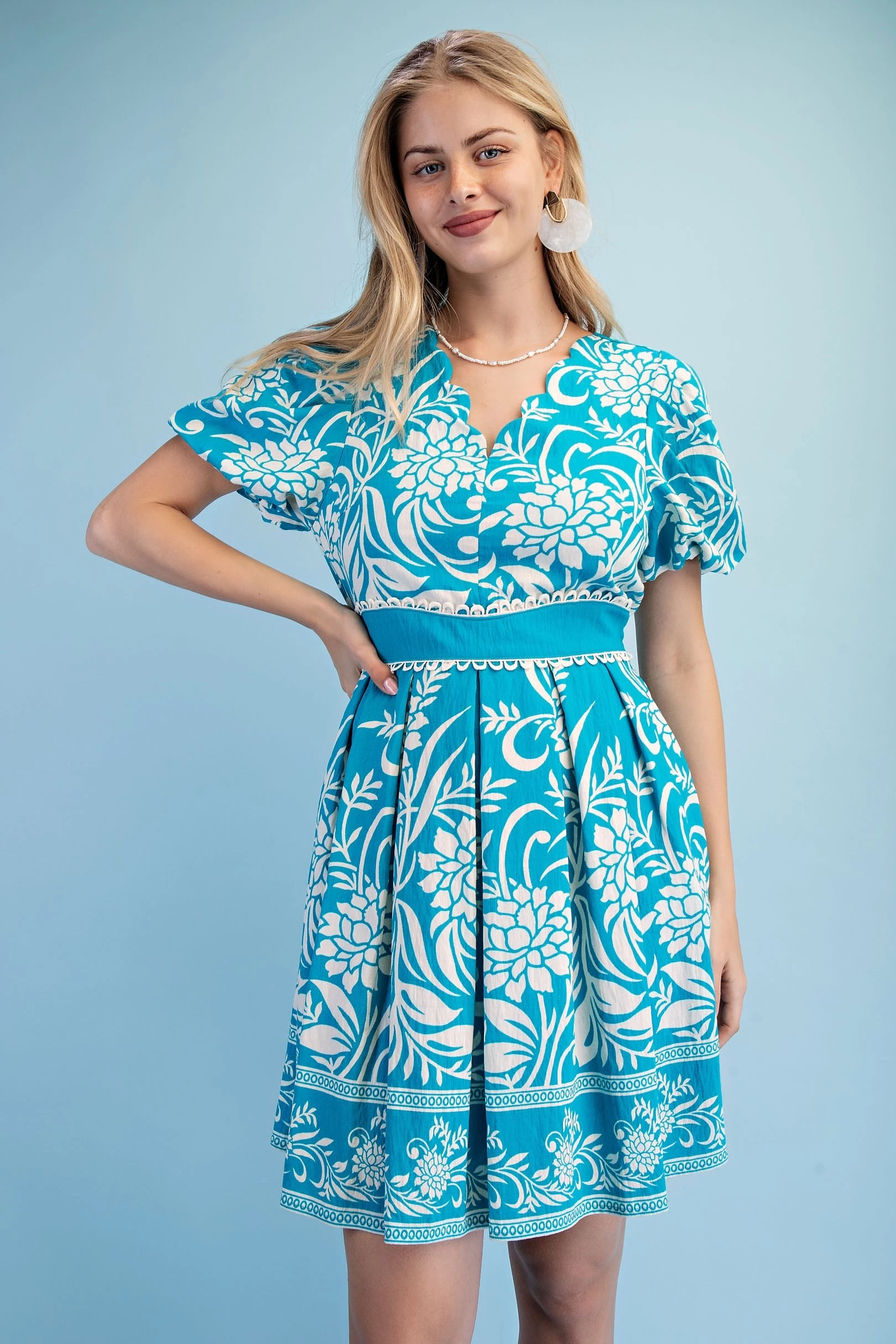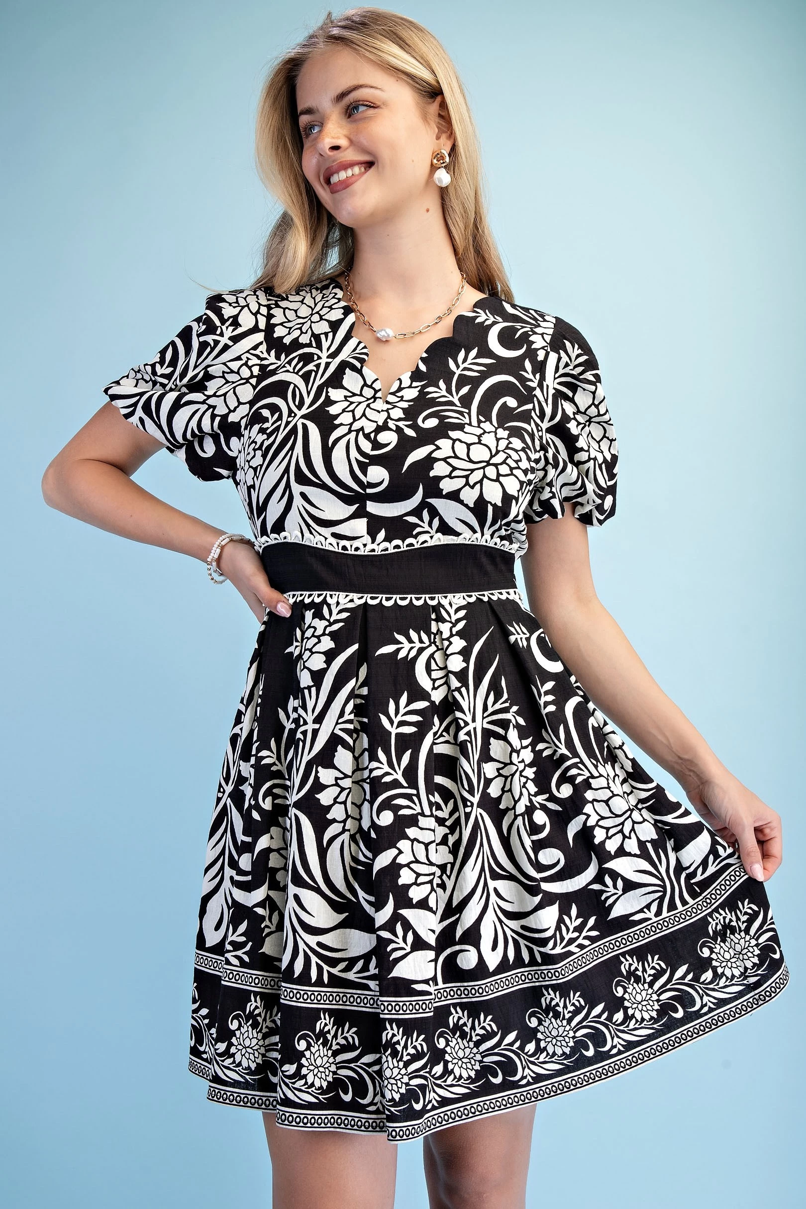 Printed Pleated Skirt Mini Dress with a Scalloped V-Neck and a Decorative Trim. The Dress is Lined