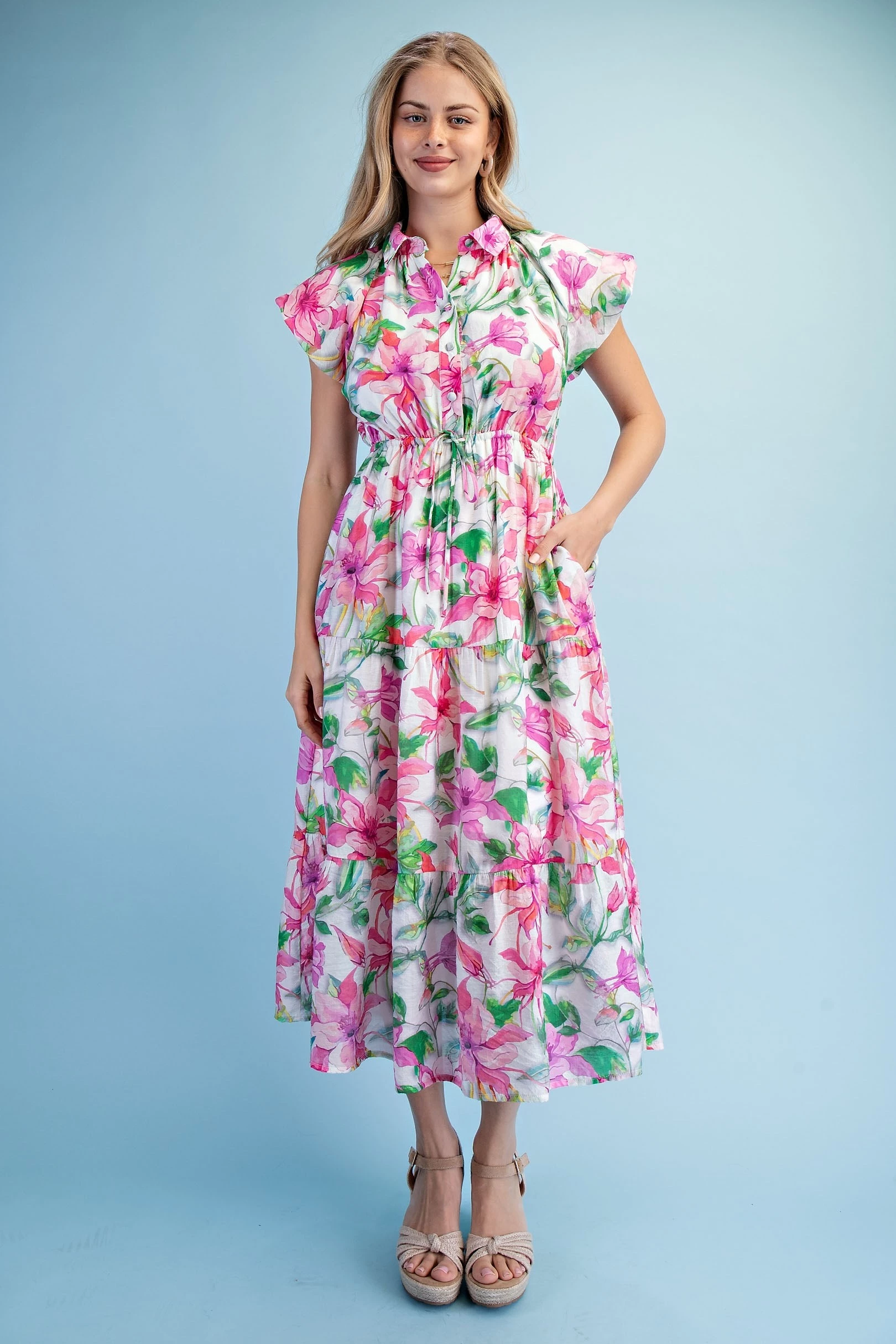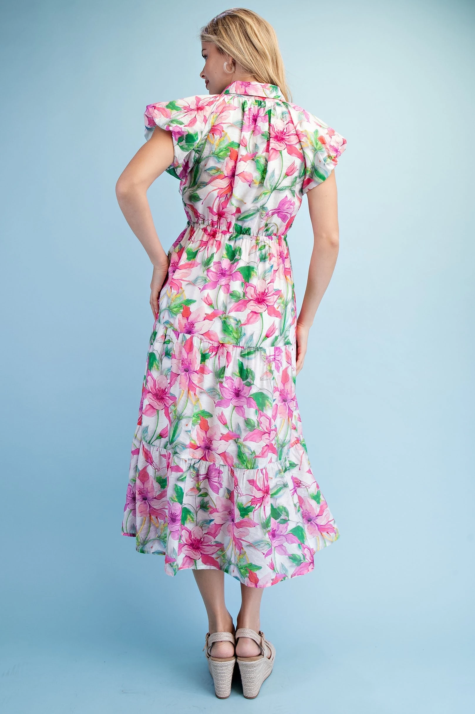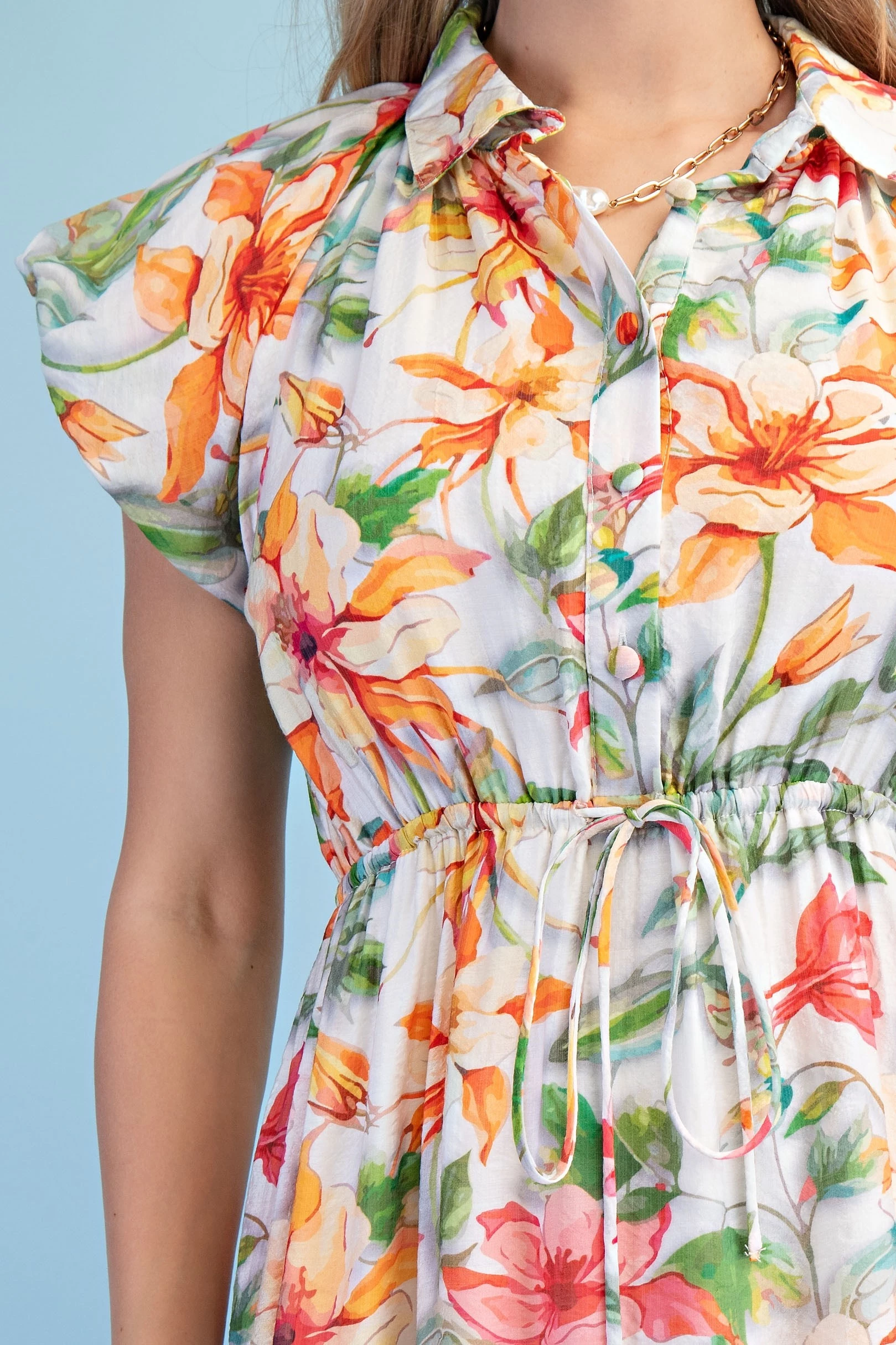 Textured Floral Print Chambray Half Button Up Dress with Box Pleat and Trapunto Stitching Details. The Skirt is Lined