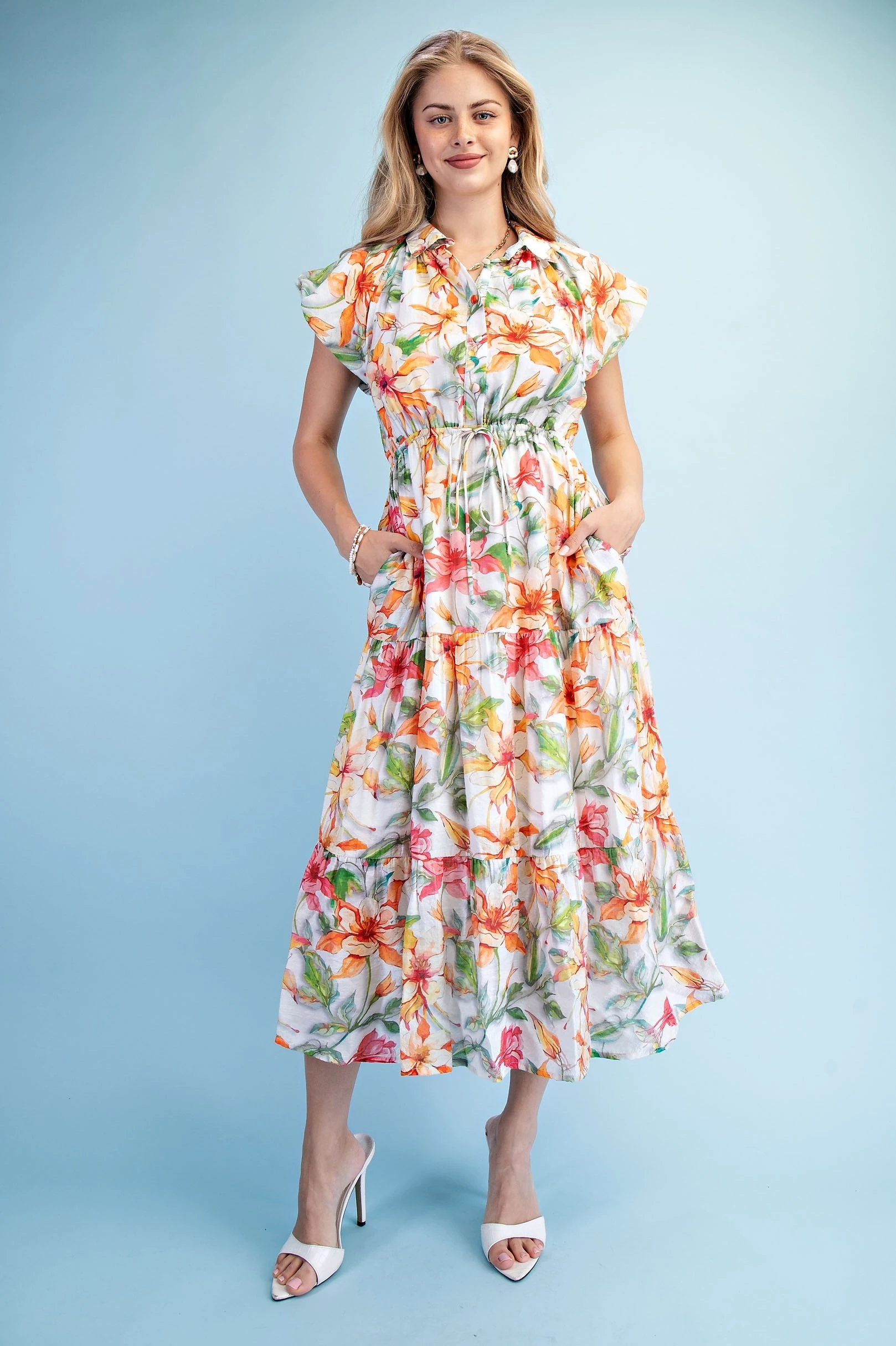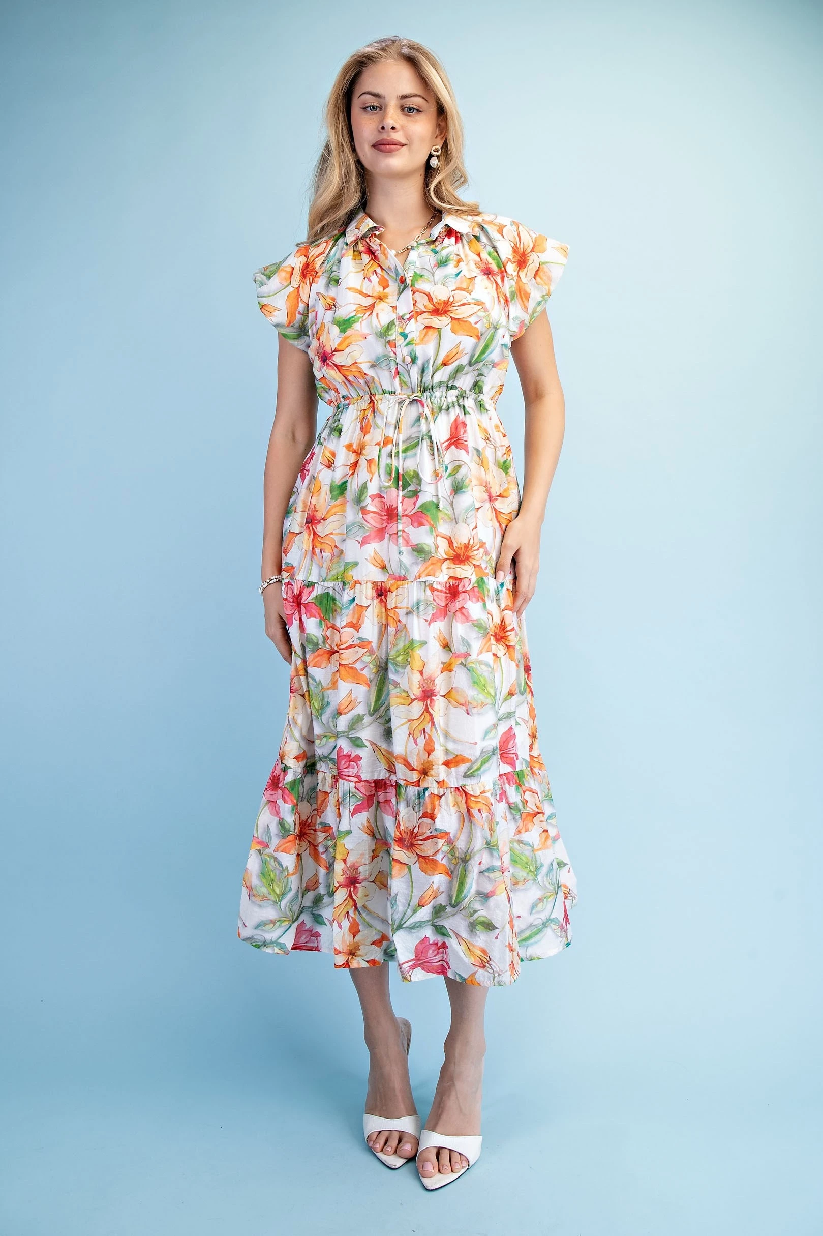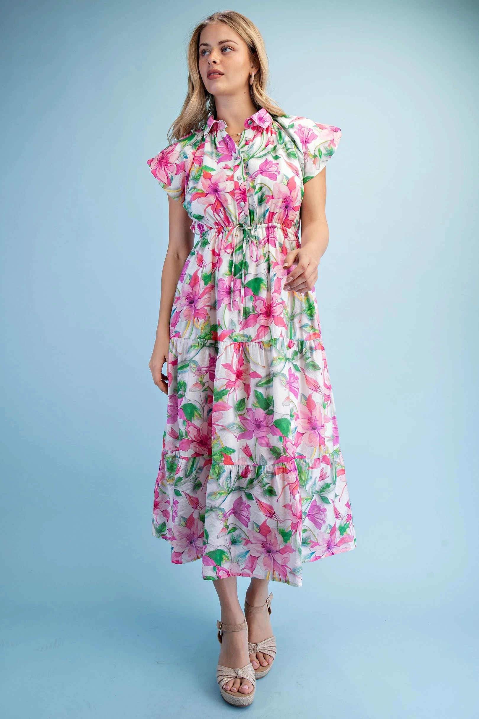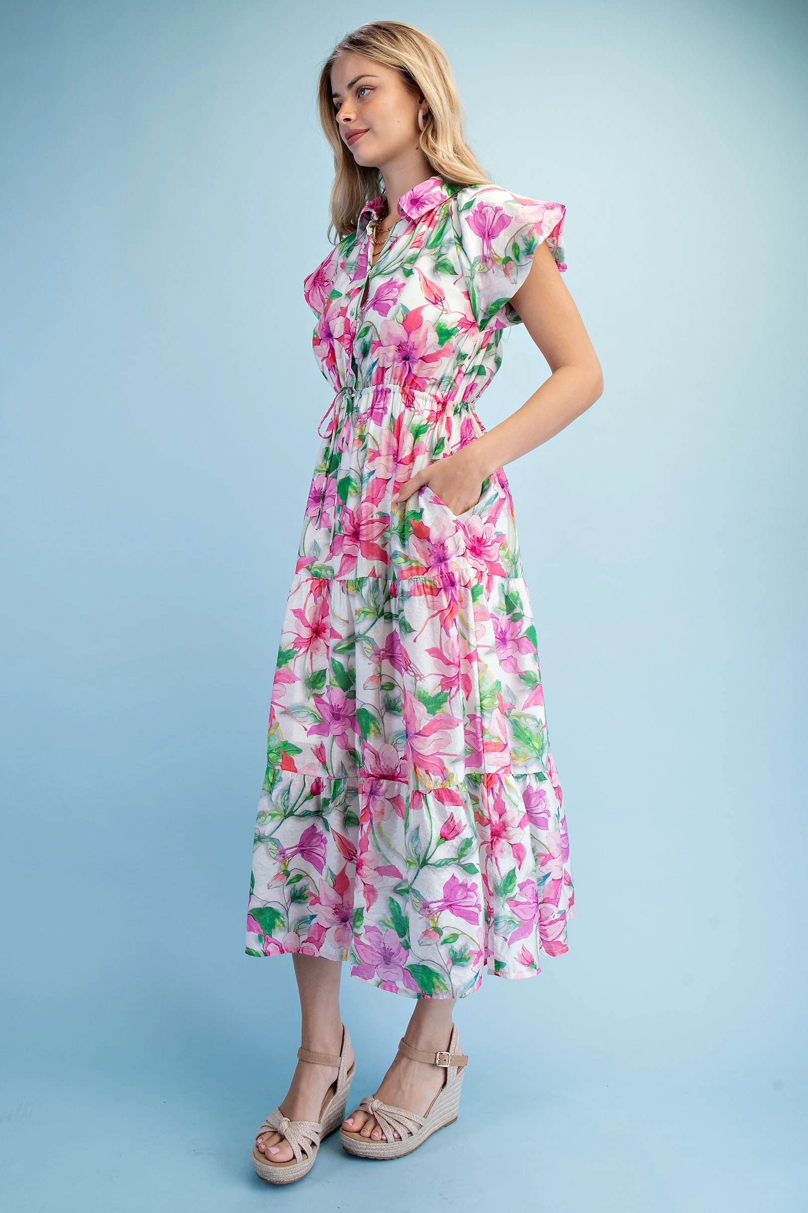 Textured Floral Print Chambray Half Button Up Dress with Box Pleat and Trapunto Stitching Details. The Skirt is Lined