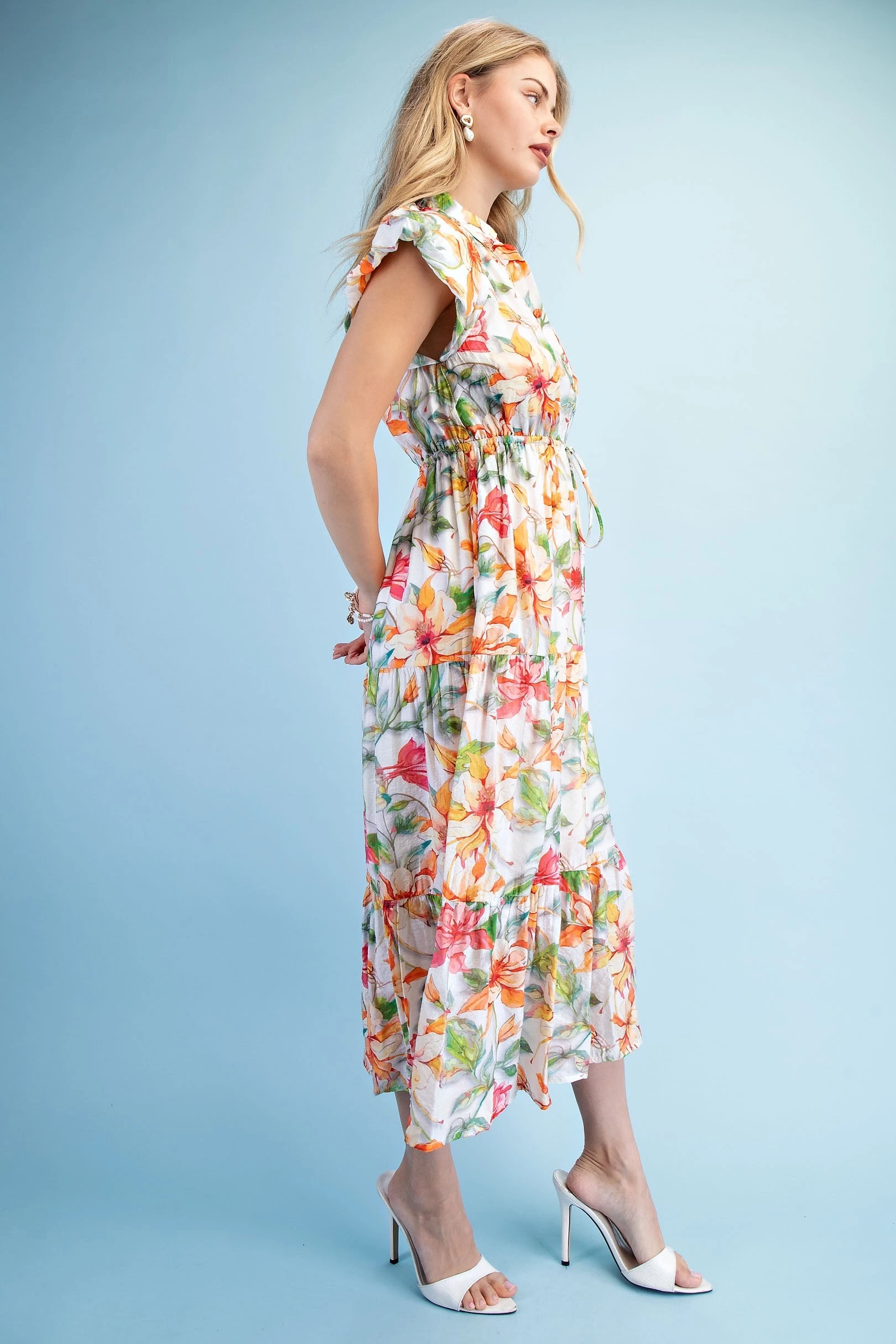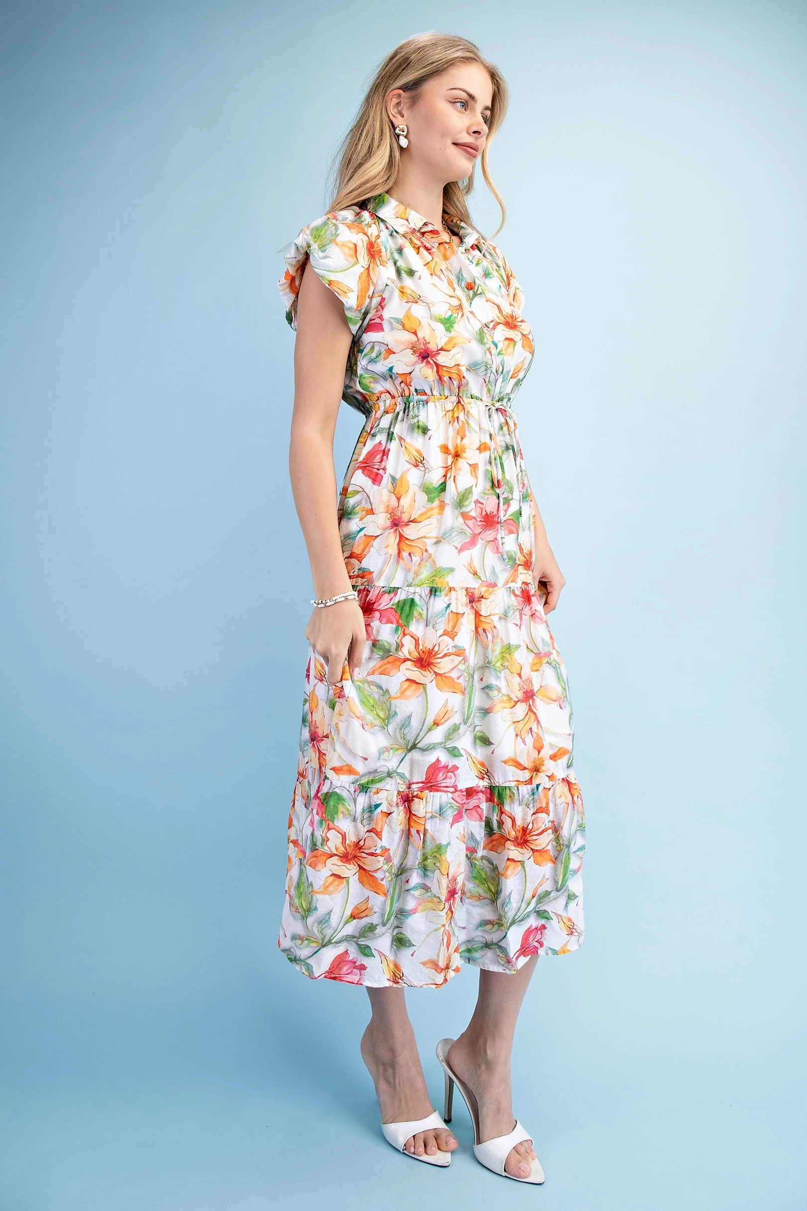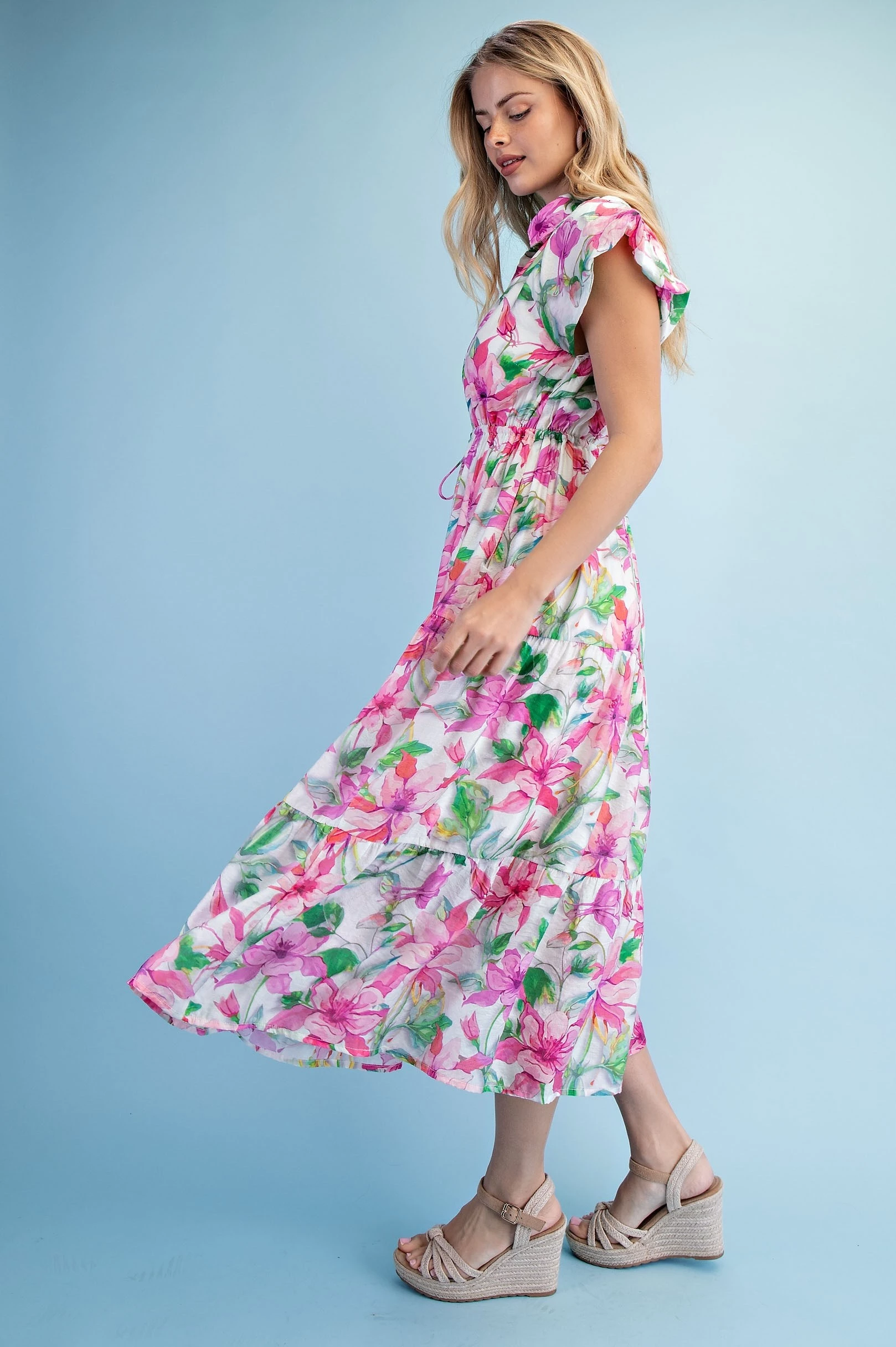 Looping Floral Print V-Neck Dress with Color Block and Trim Details. The Dress is Lined
