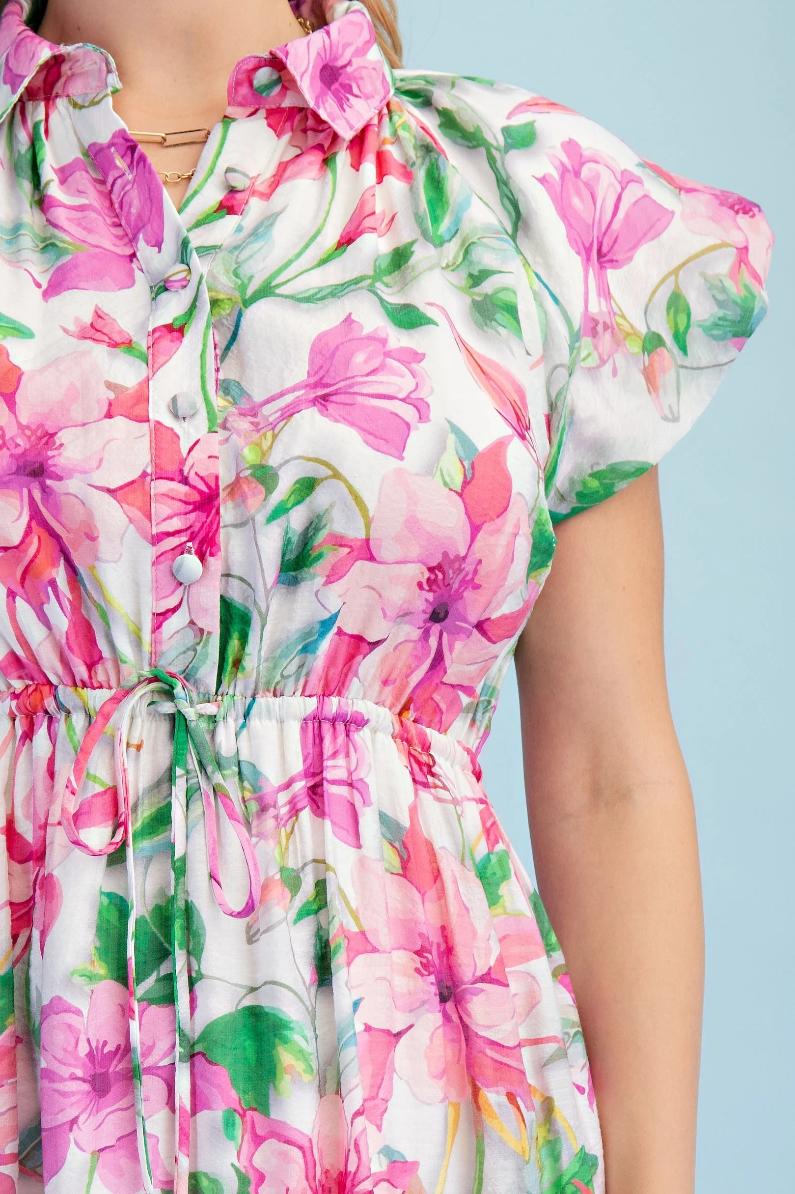 Bright Floral Printed Button Down Top with 3/4 Length Gathered Balloon Sleeves. The Top is Lined