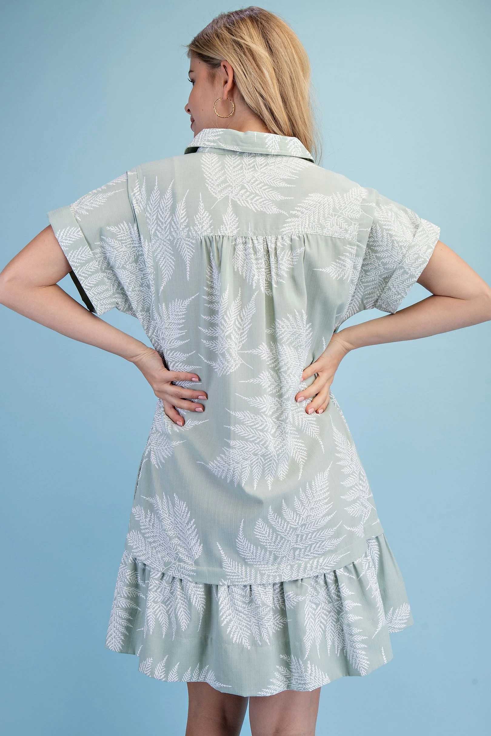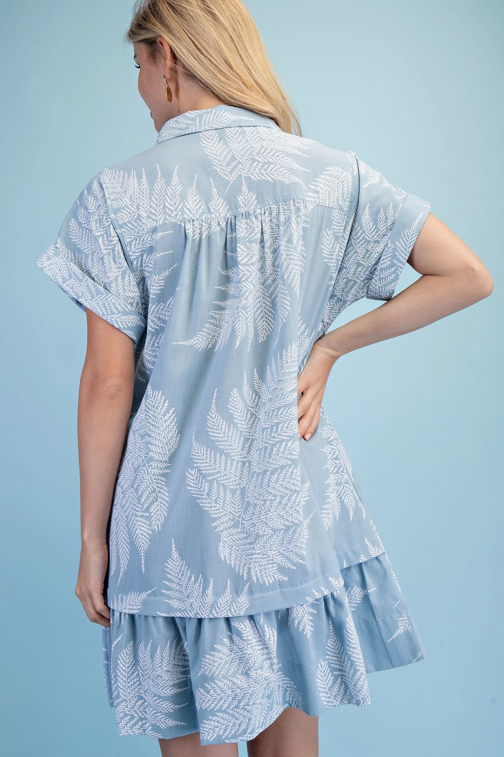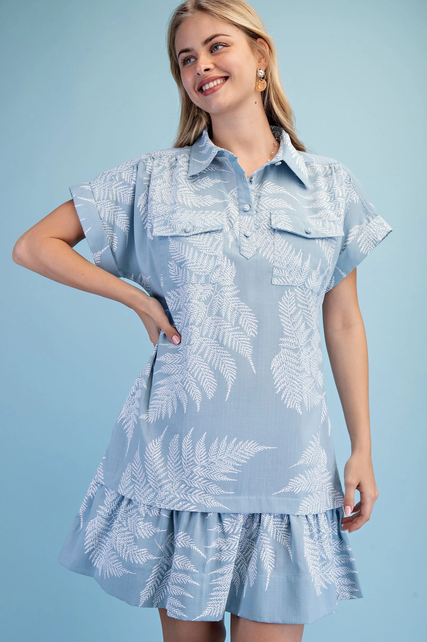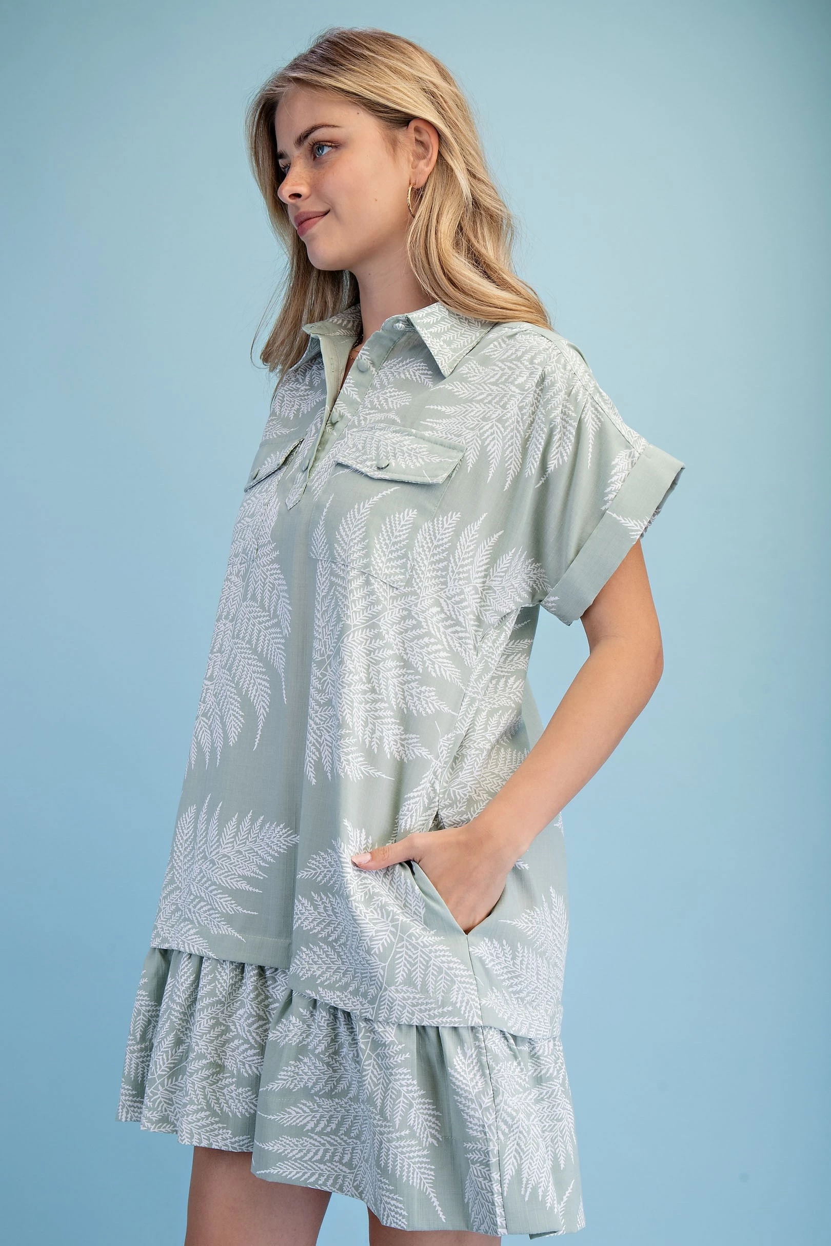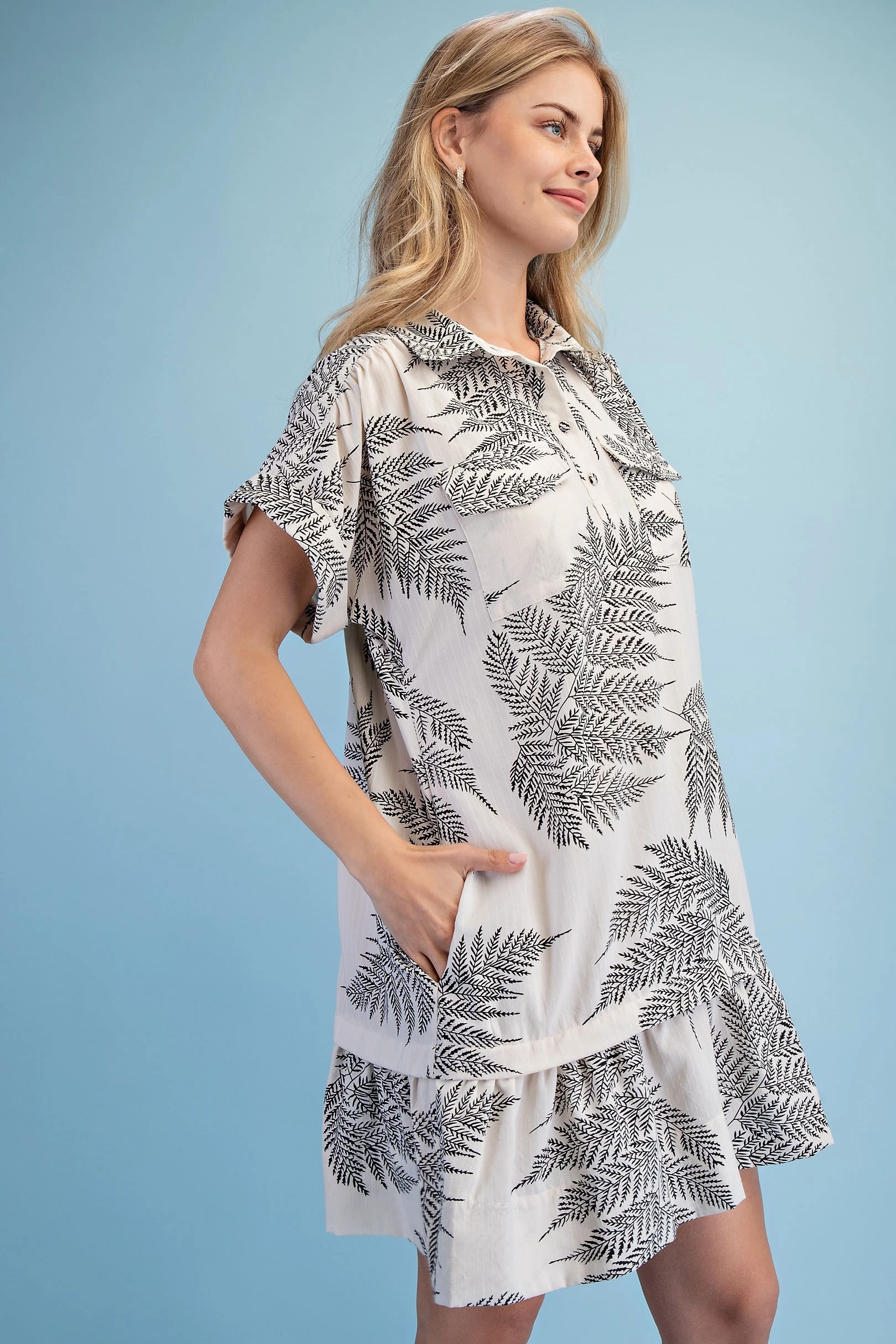 Fern Print Half Button Shirt Dress with a Layered Tier Details and Two Front Pockets