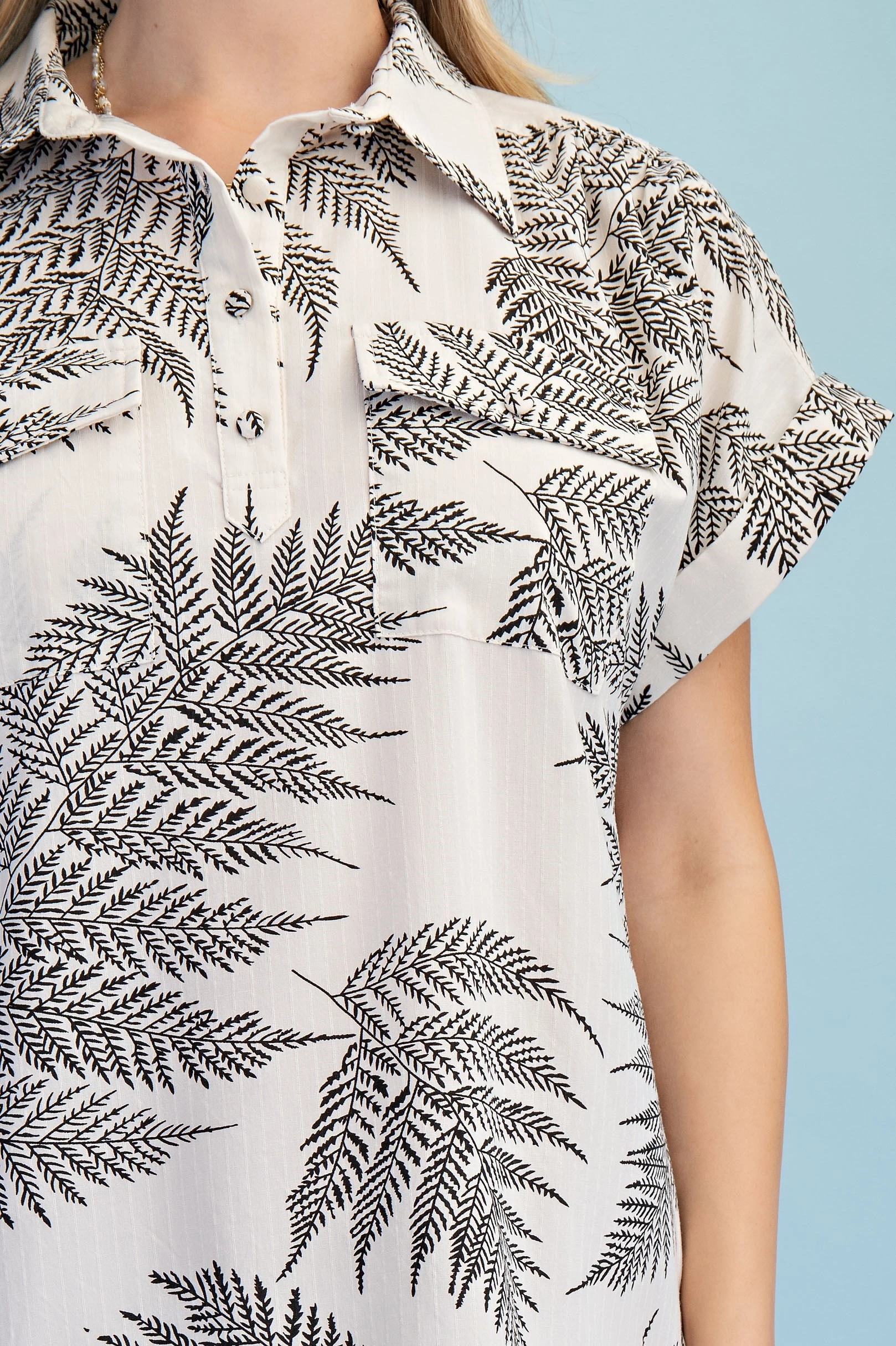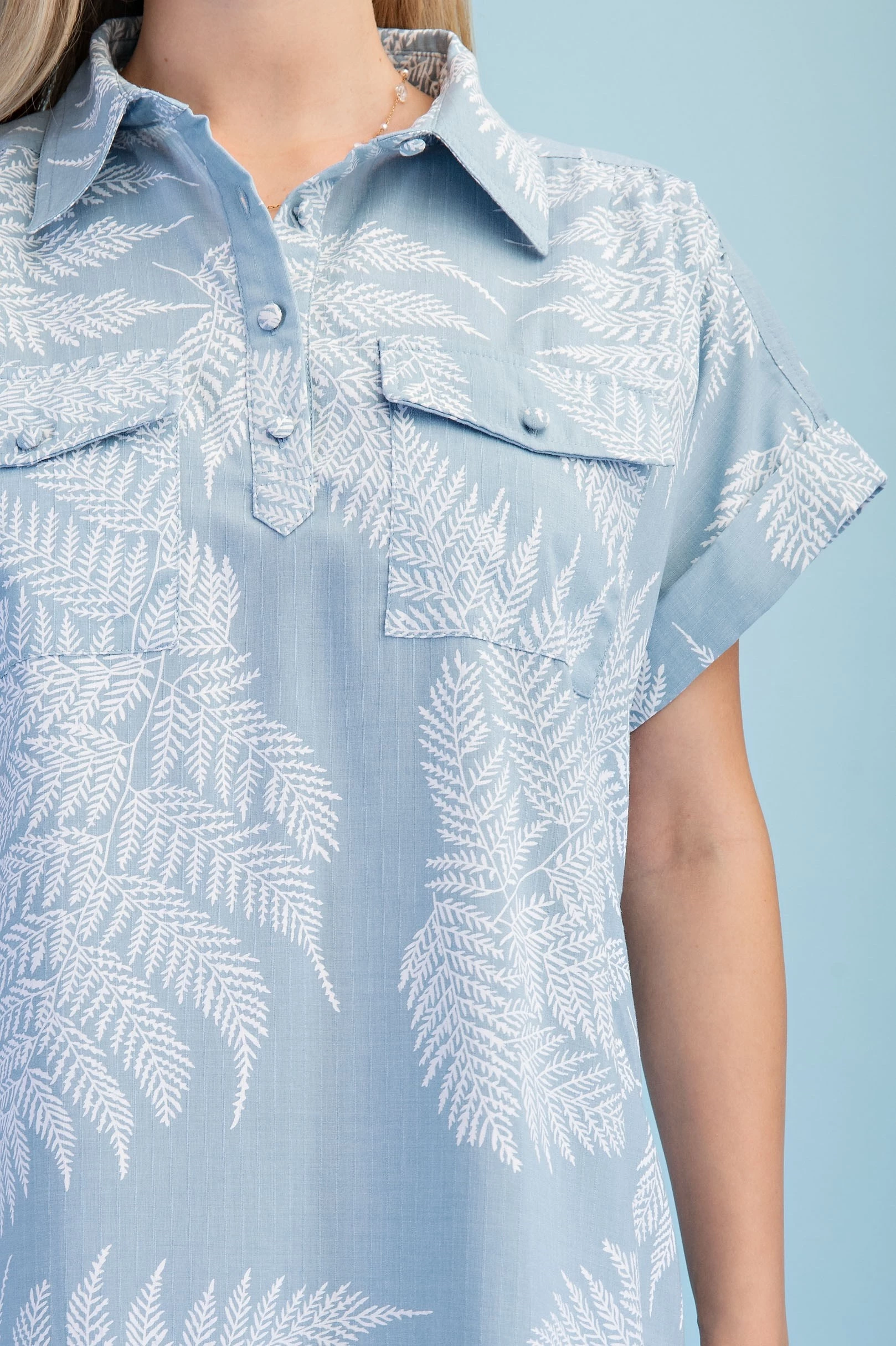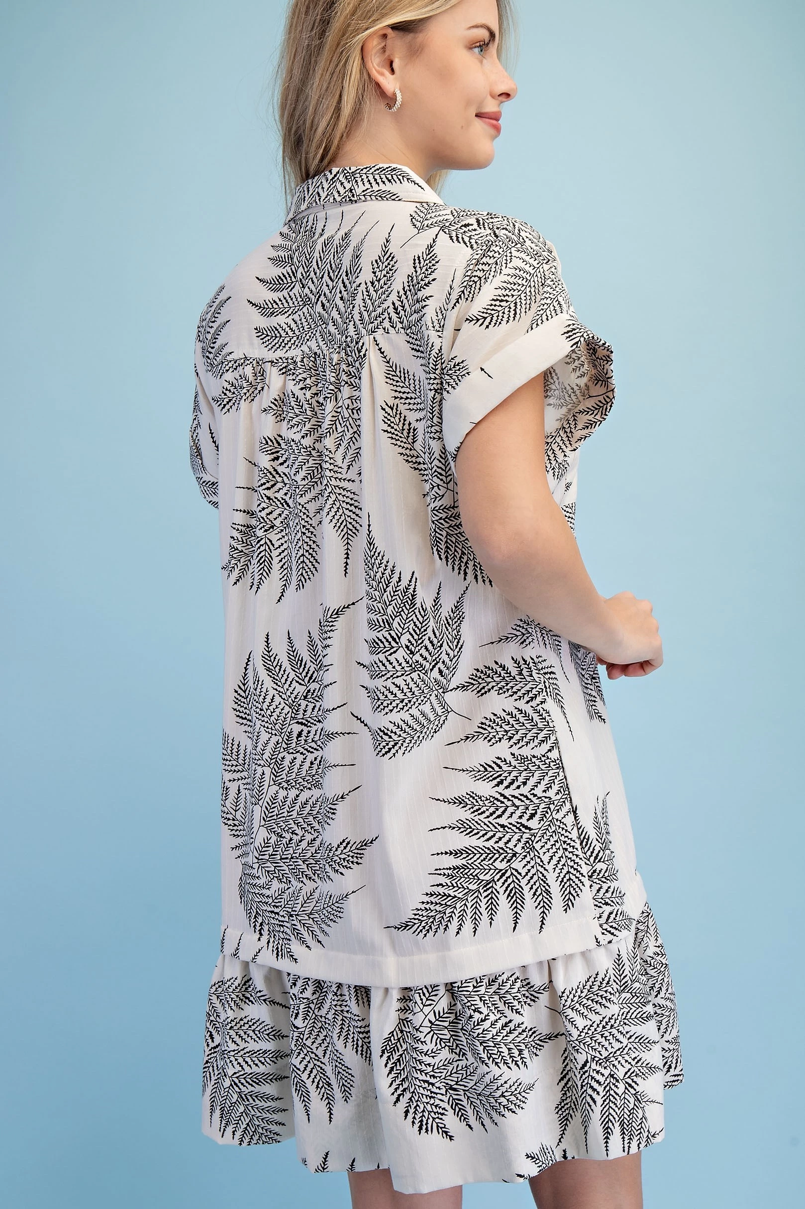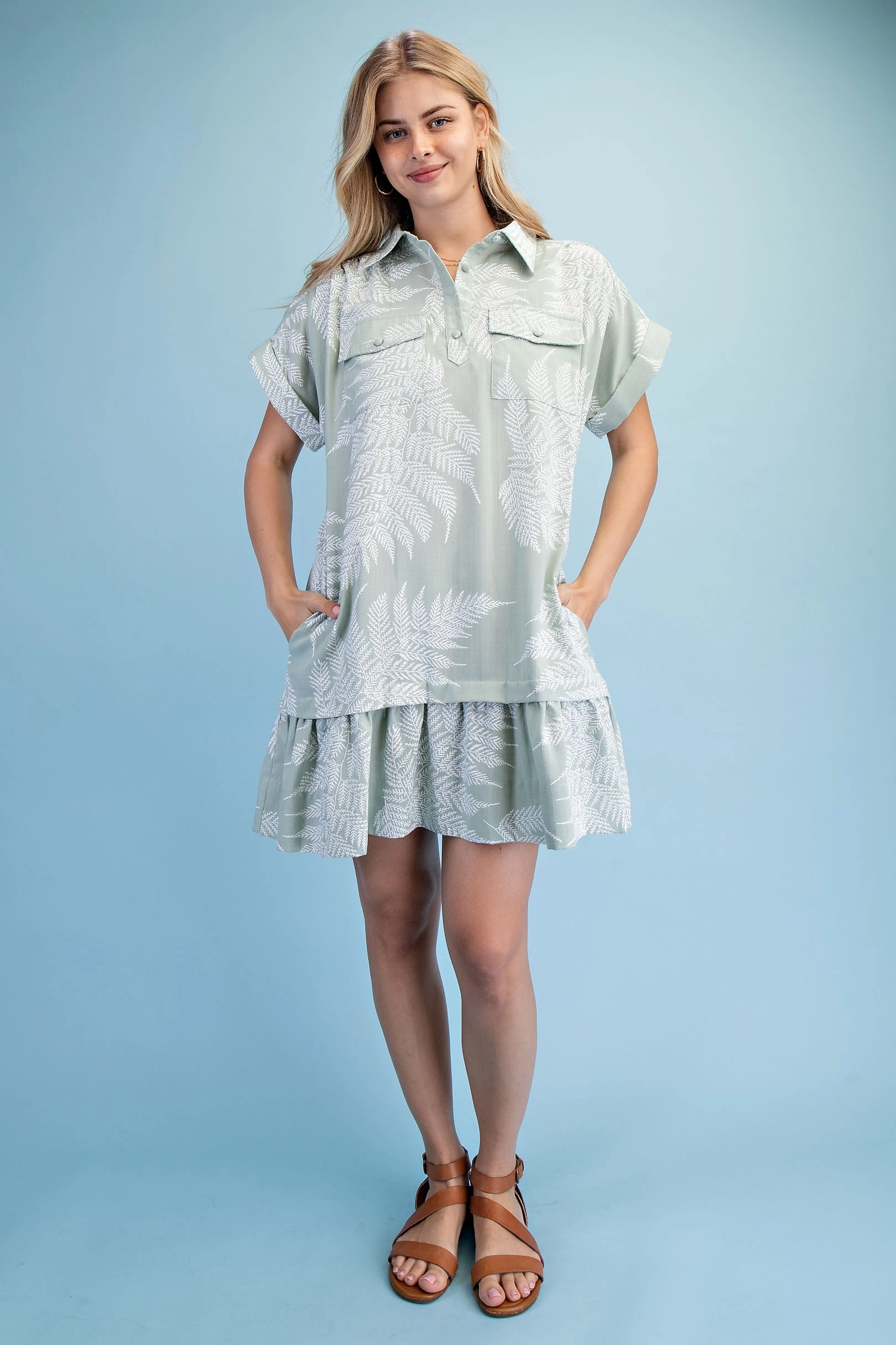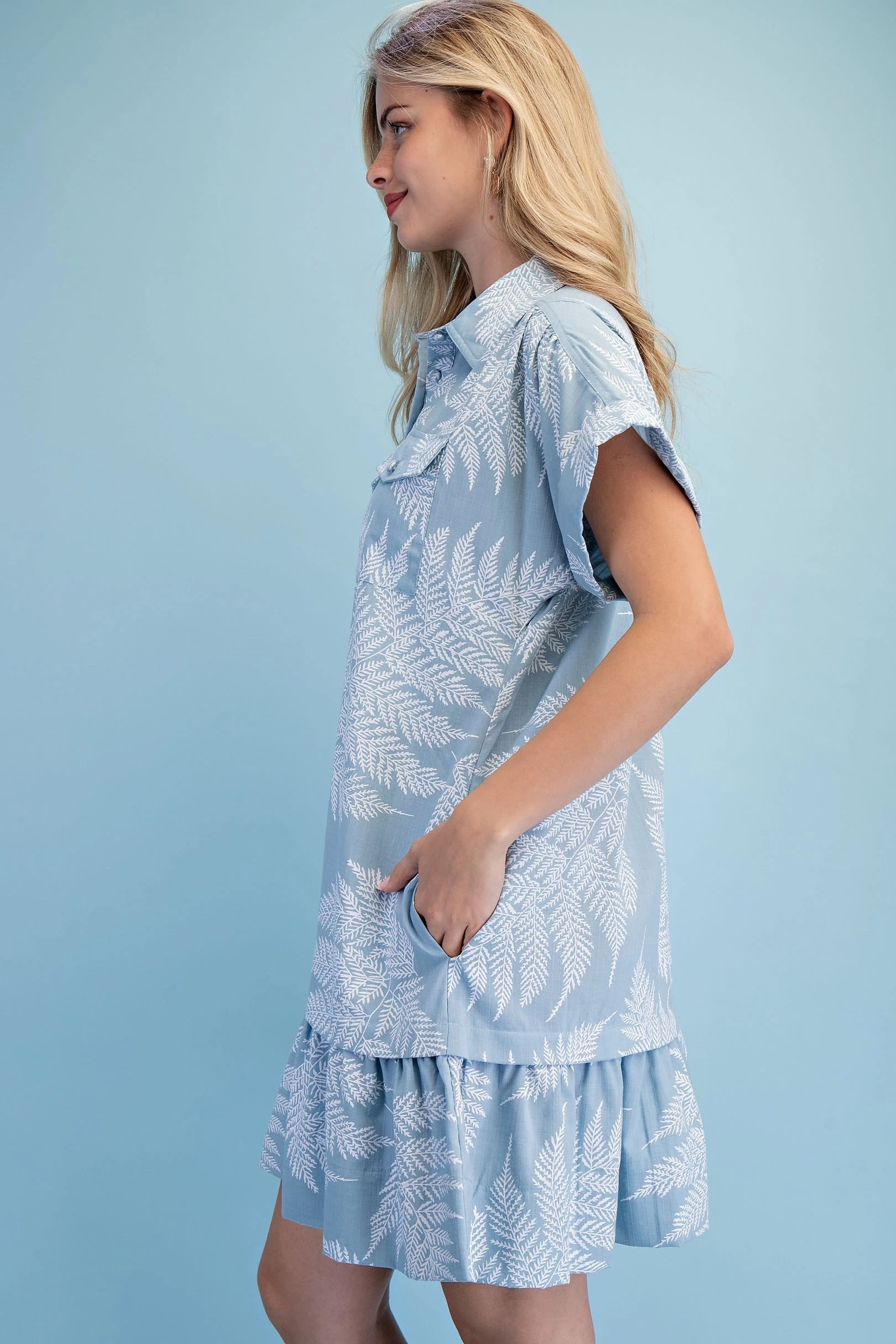 Fern Print Half Button Shirt Dress with a Layered Tier Details and Two Front Pockets