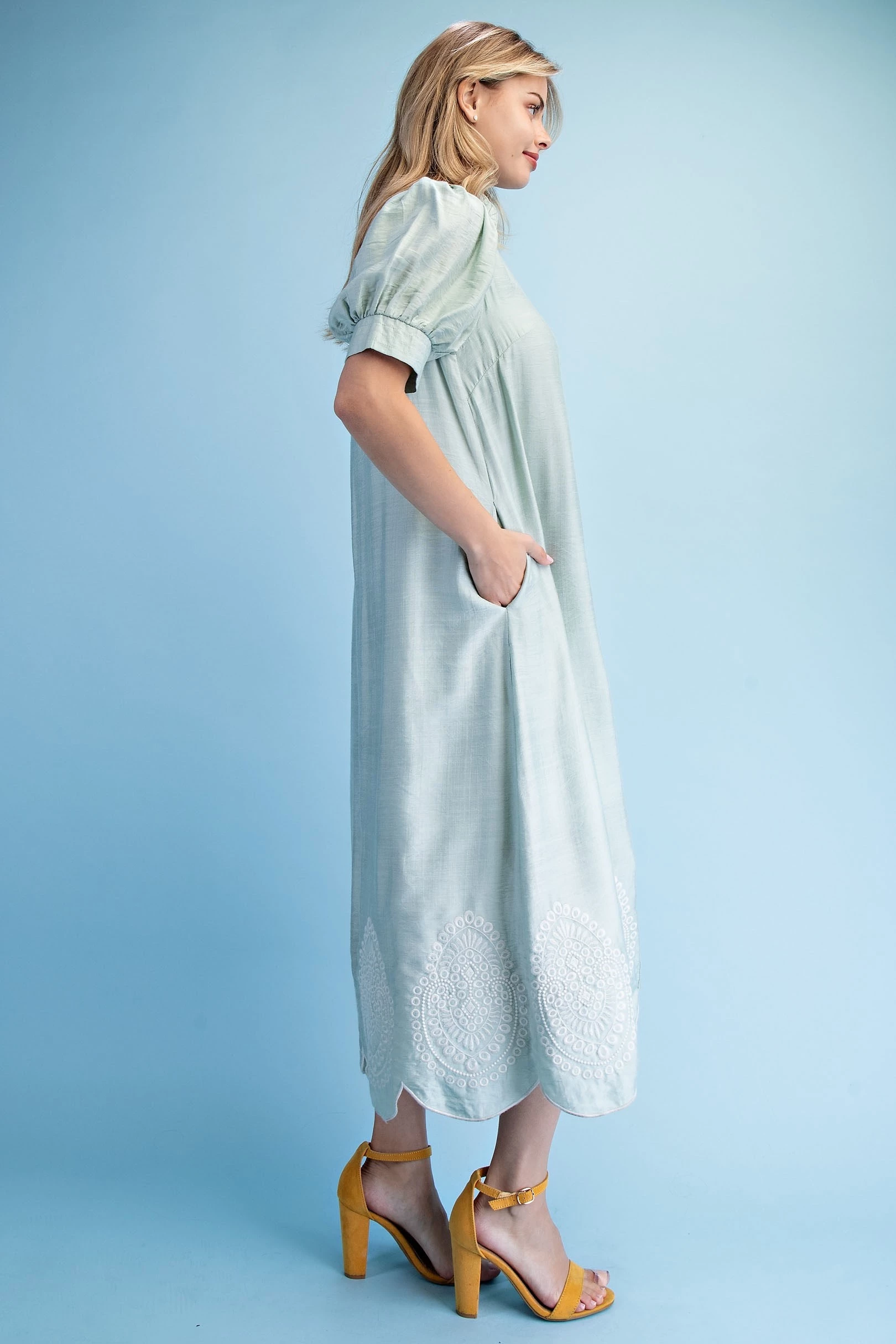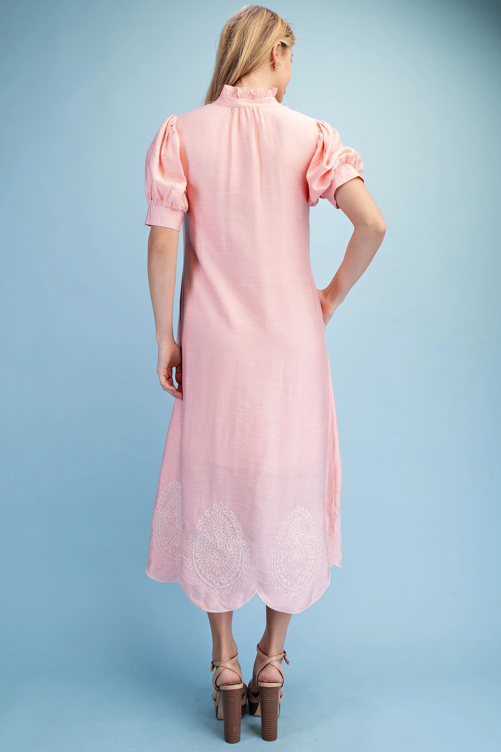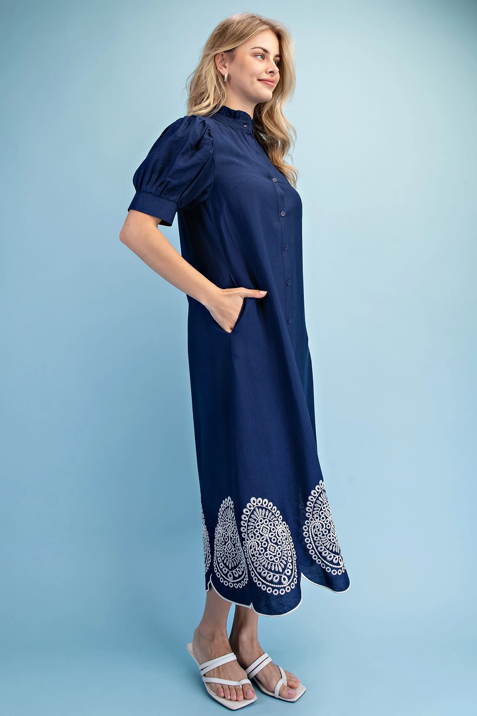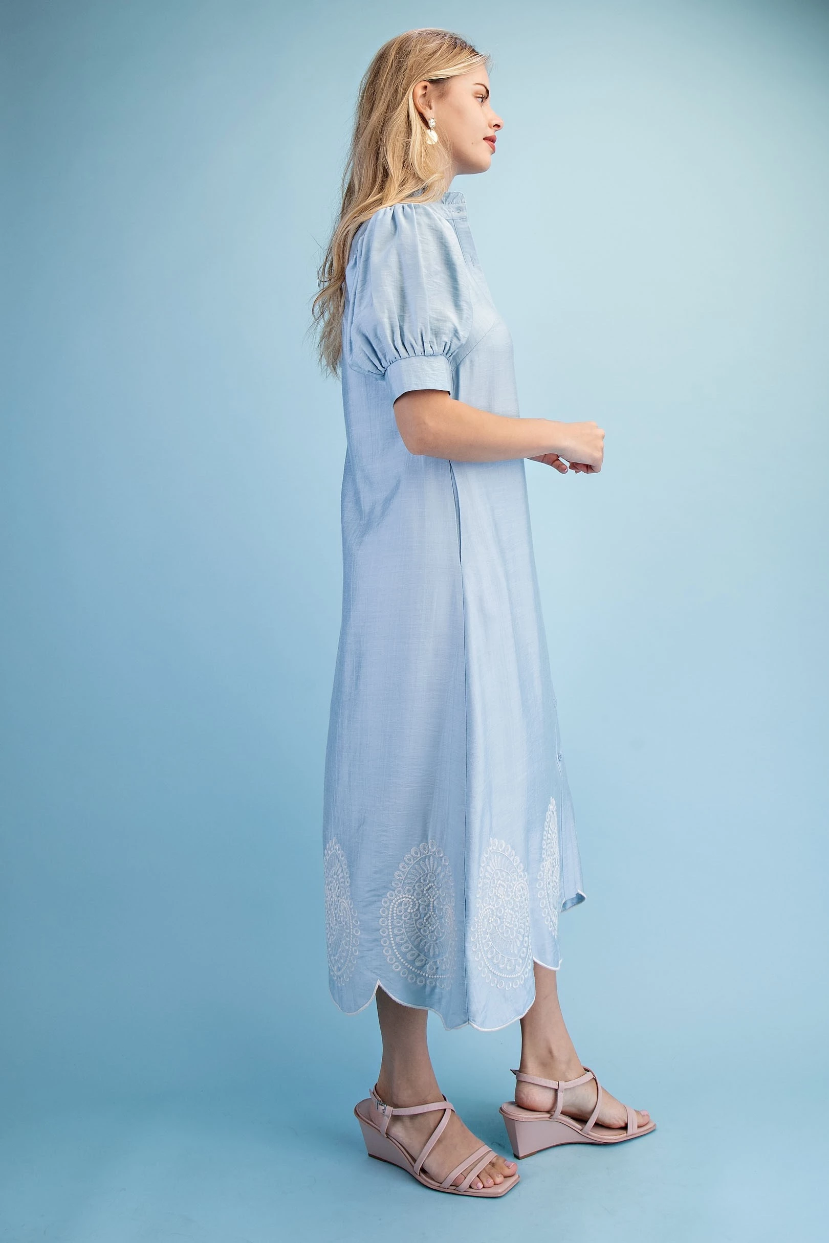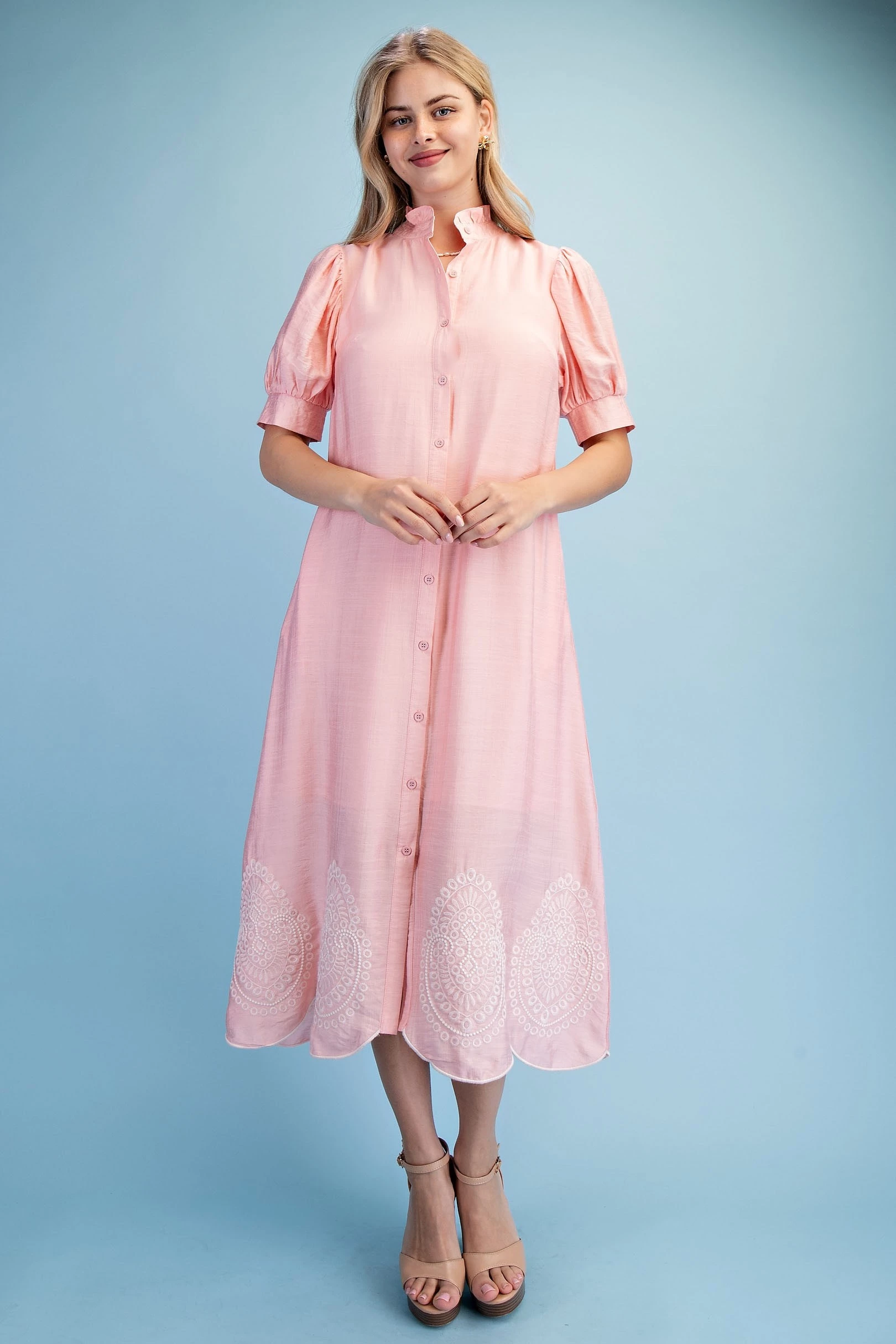 Embroidered V-Neck Button Down Dress with Short Puff Sleeves
