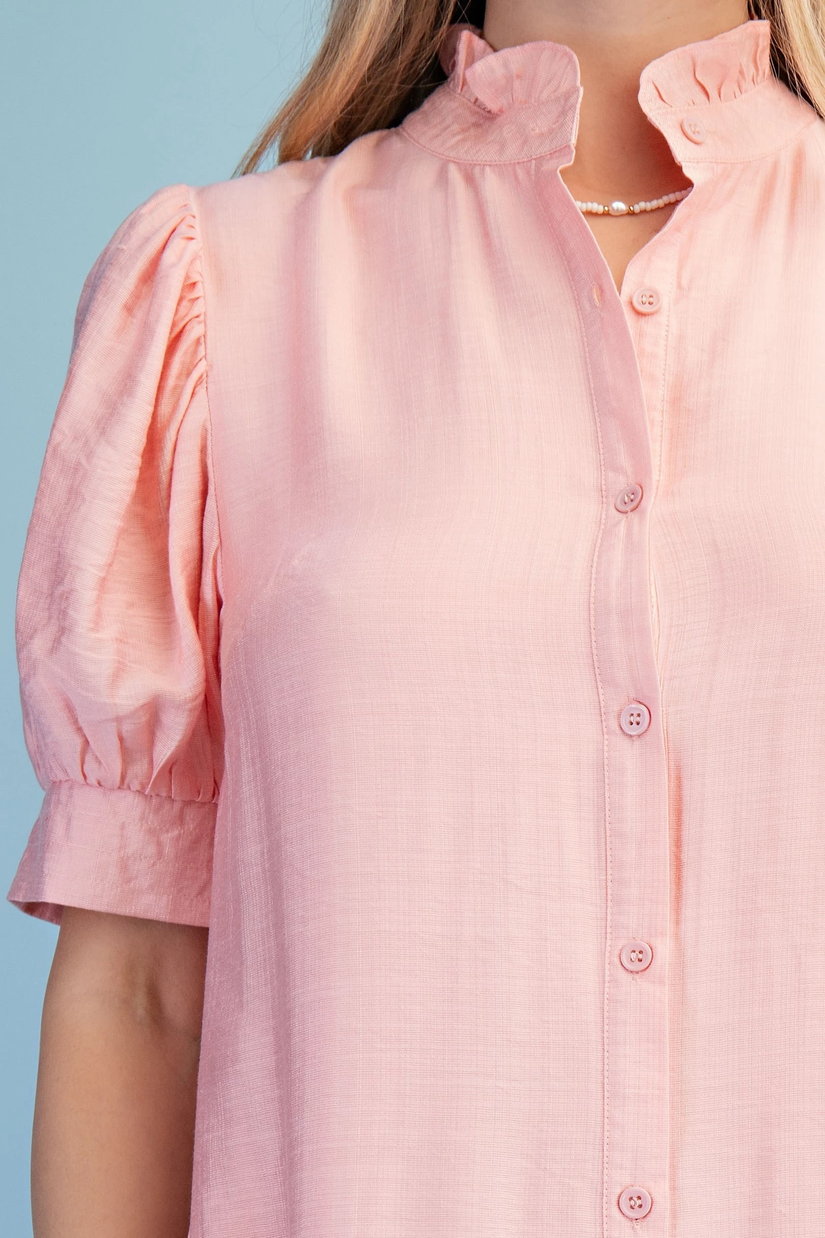 Scalloped Edged V-Neck Blouse with 3/4 Length Gathered Balloon Sleeves