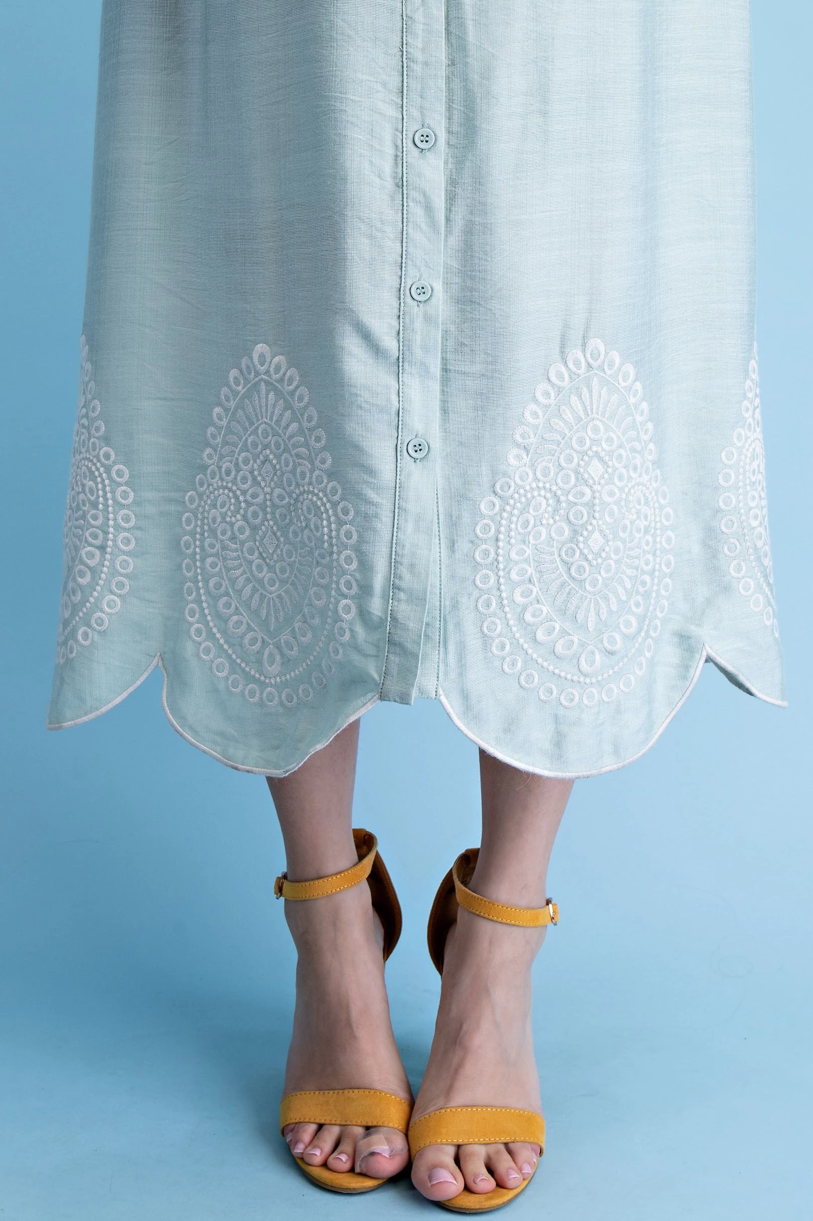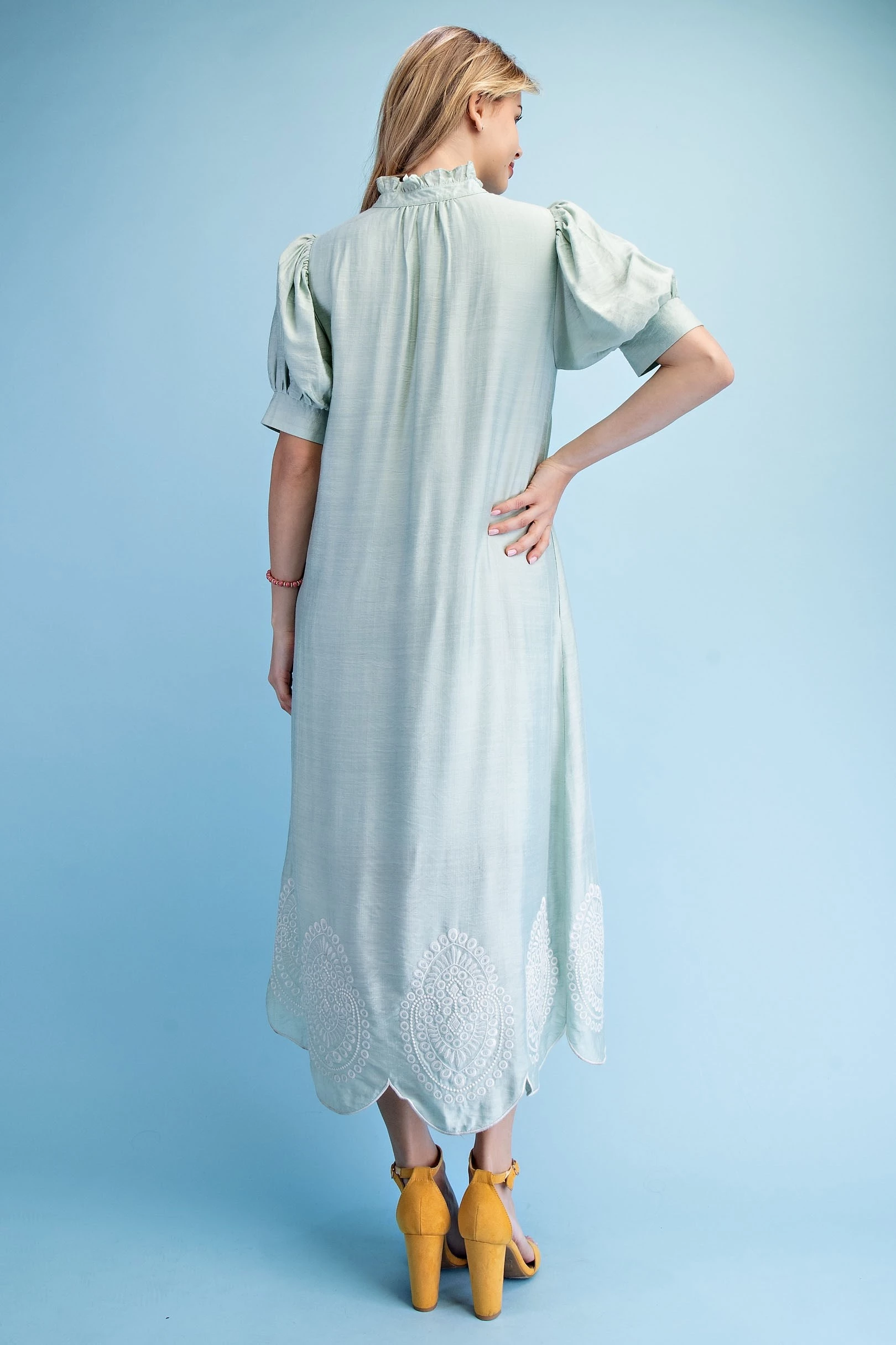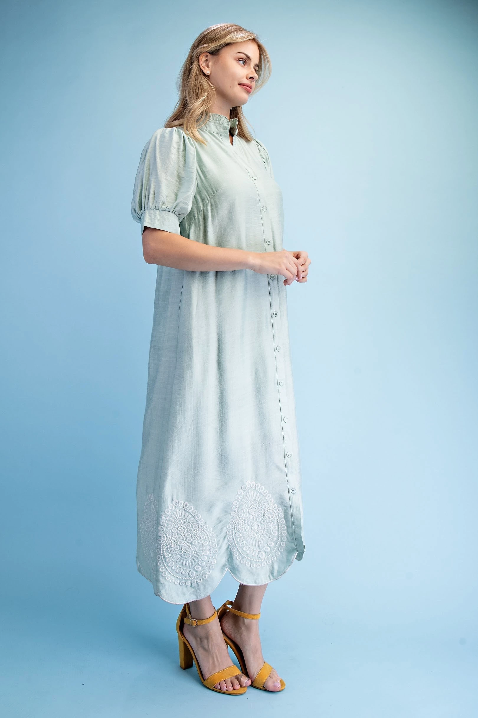 Button Down Midi Dress with a Ruffled Collar and Metallic Embroidery