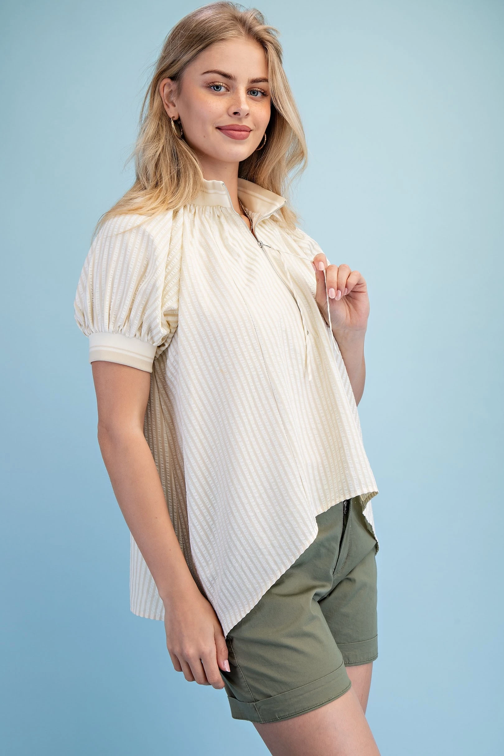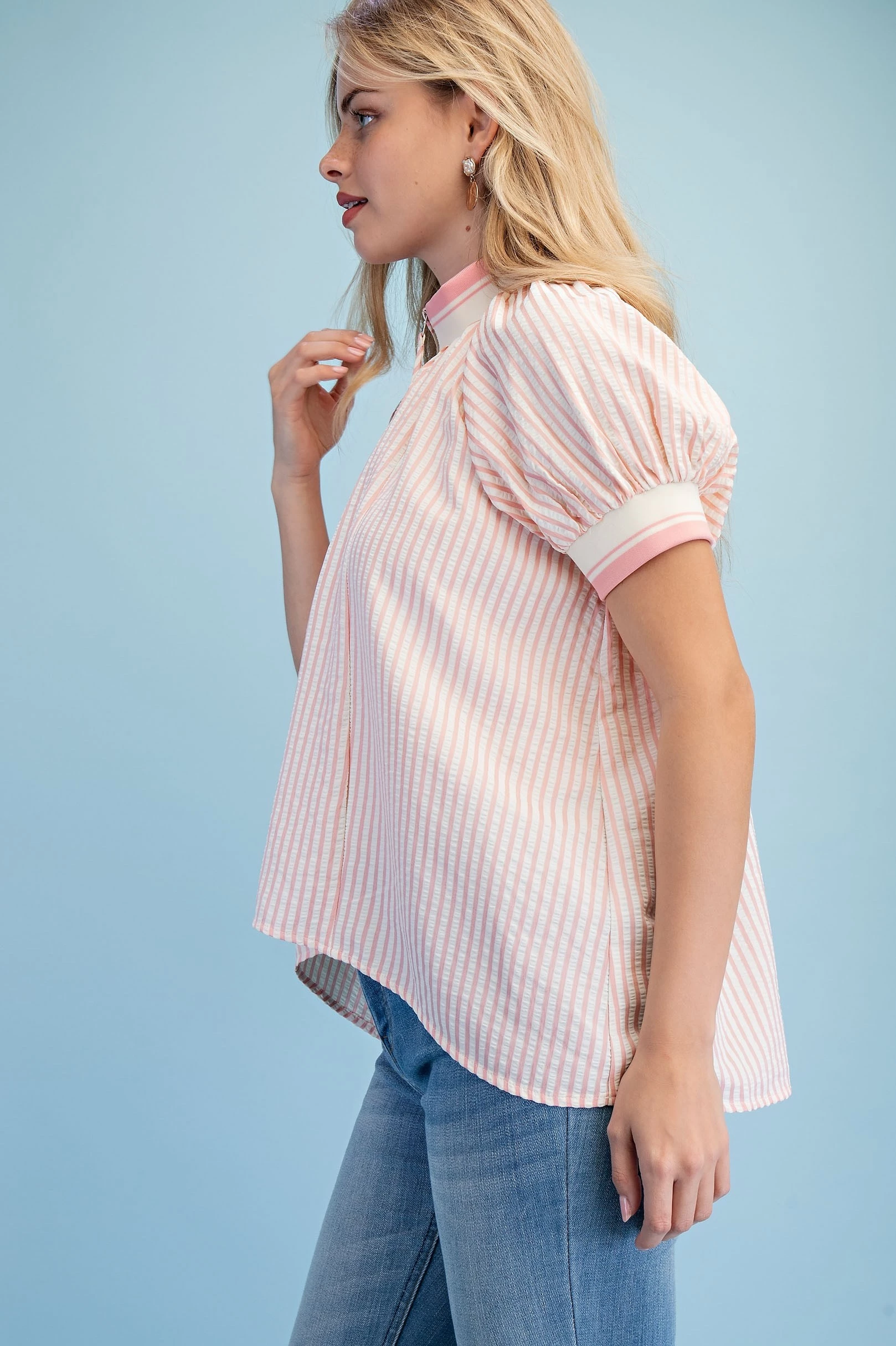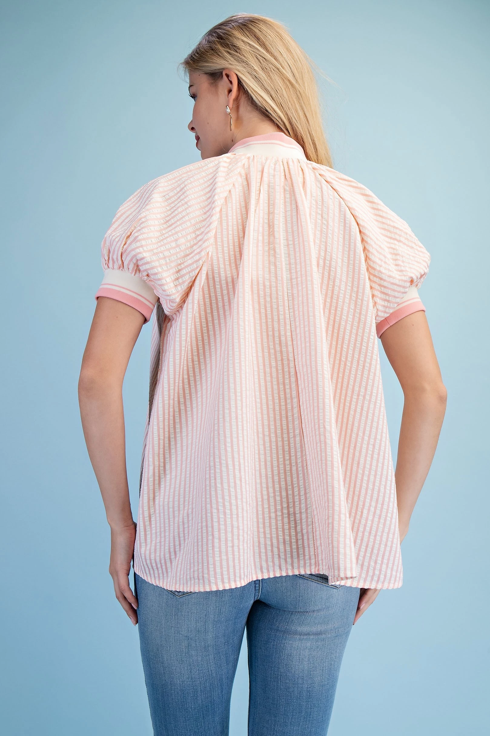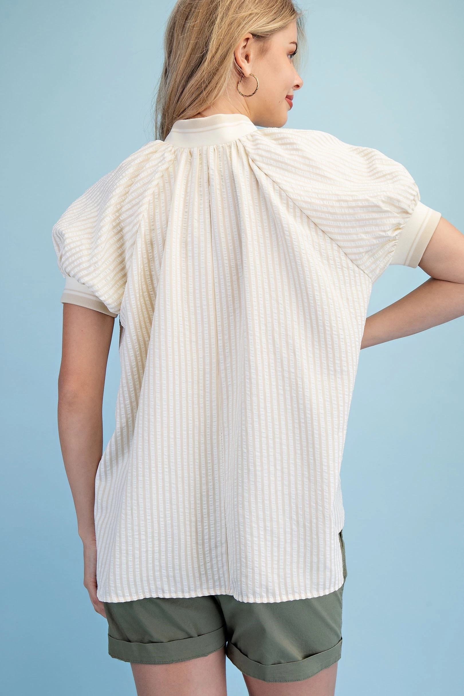 Textured Round Neck Top with Ruffled Contrasting Stripe Details. The Top is Lined