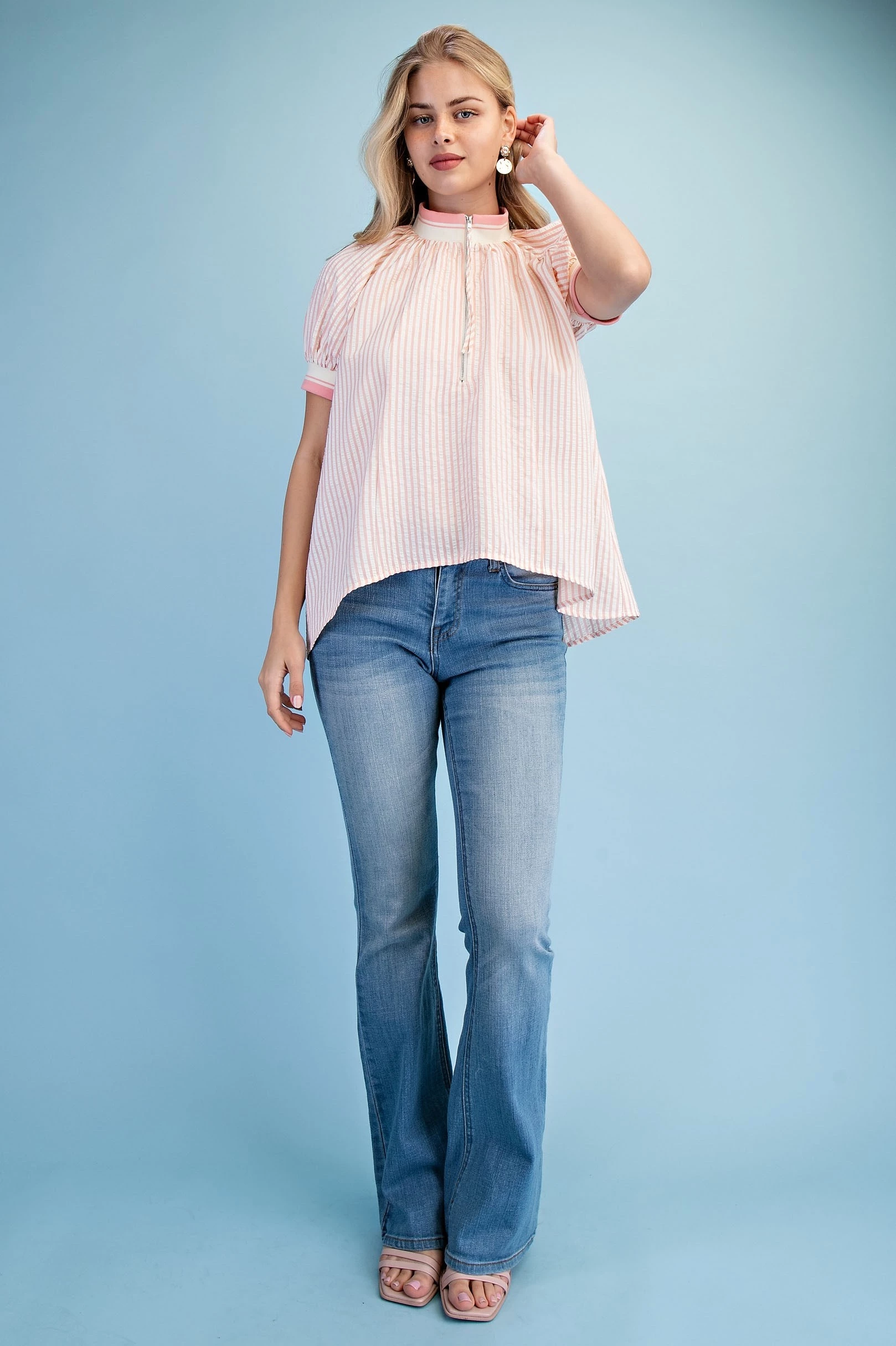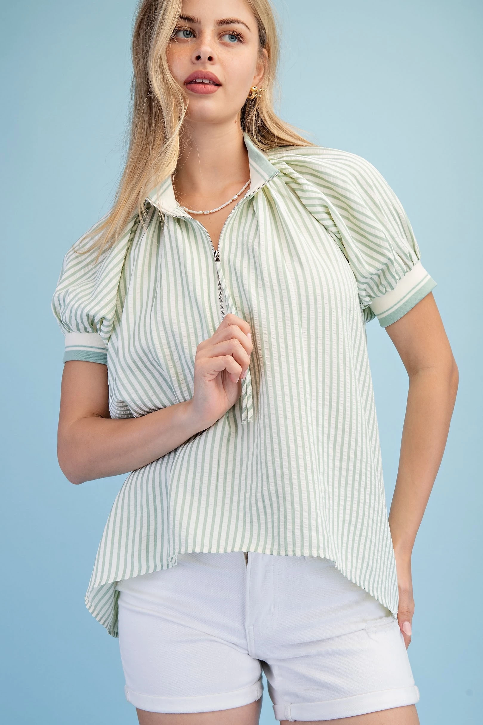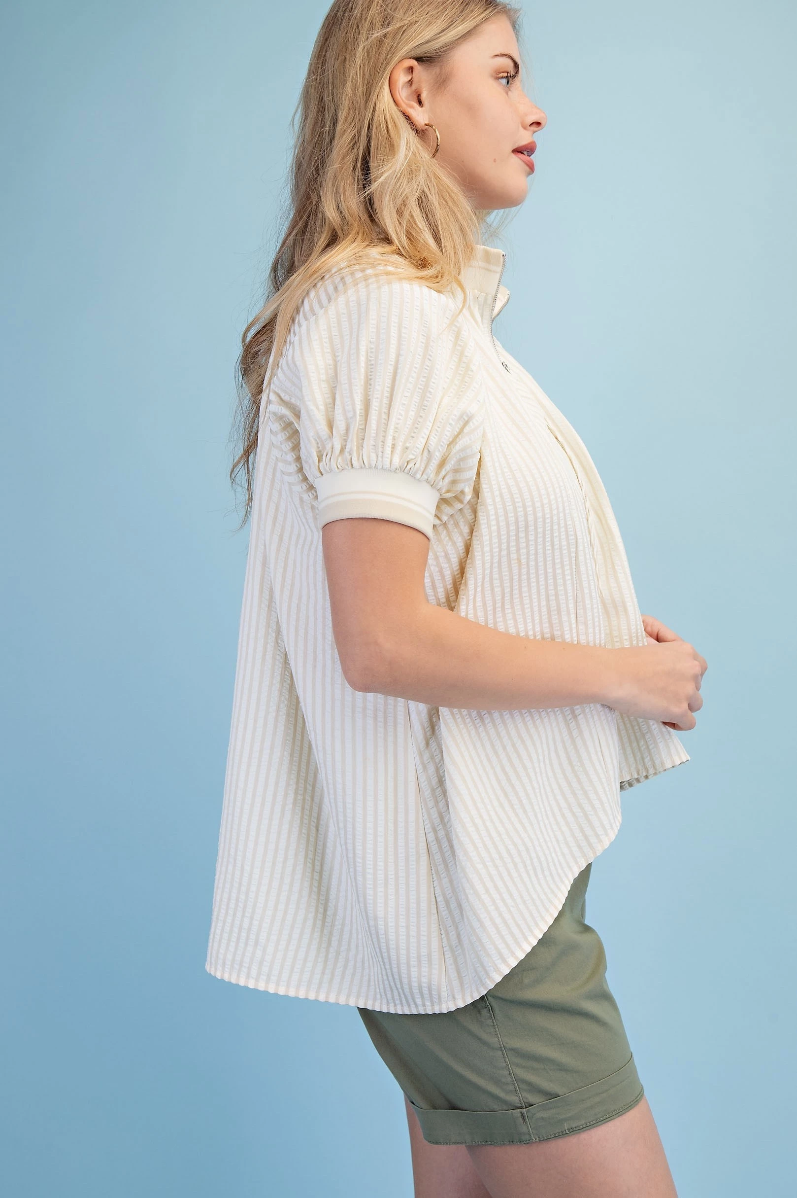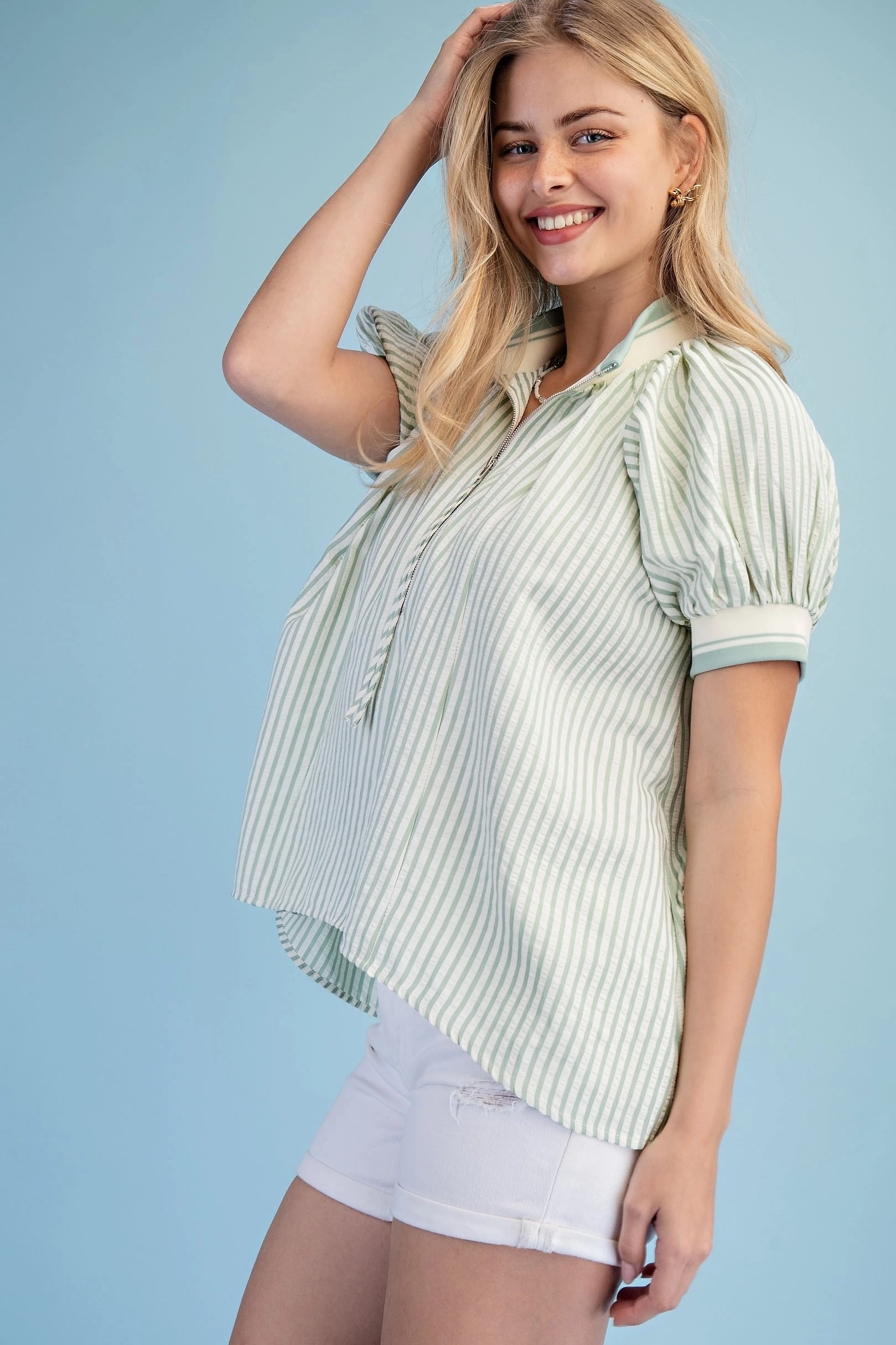 Textured Round Neck Top with Ruffled Contrasting Stripe Details. The Top is Lined
