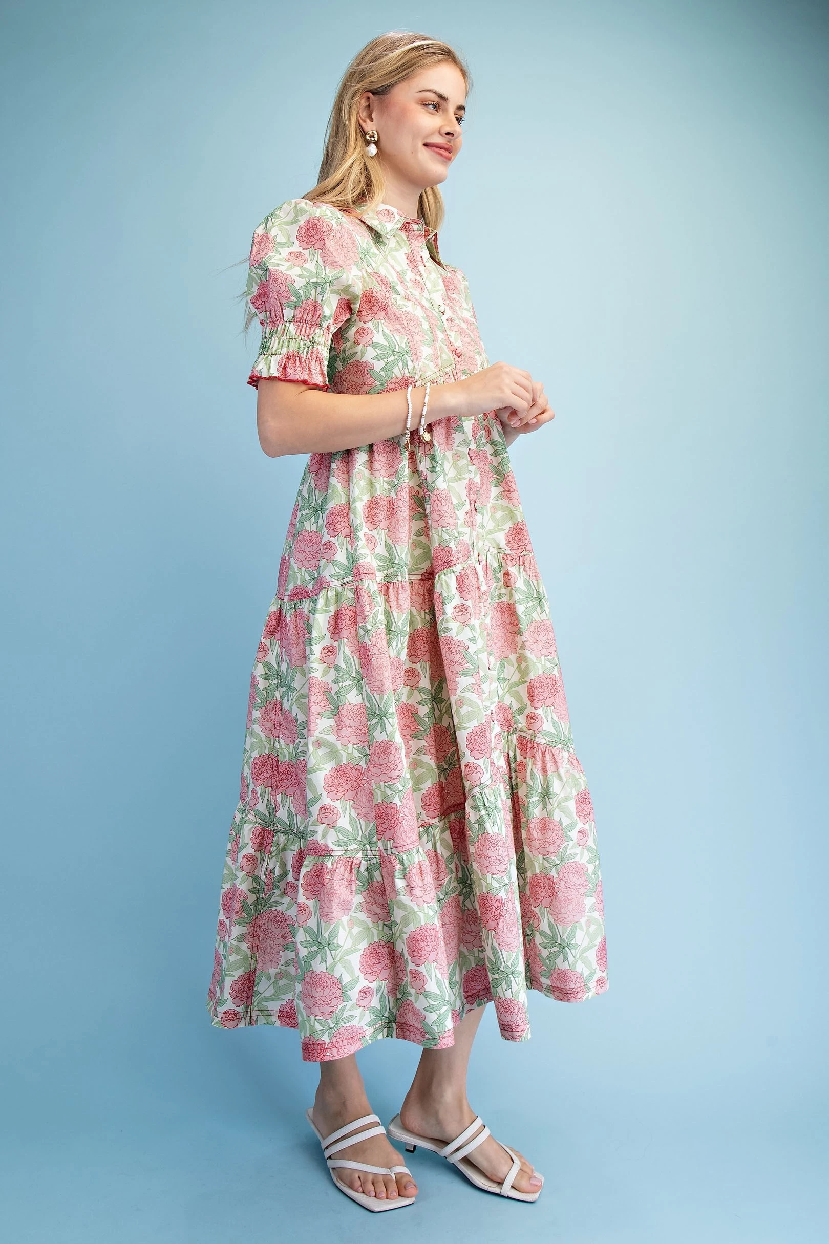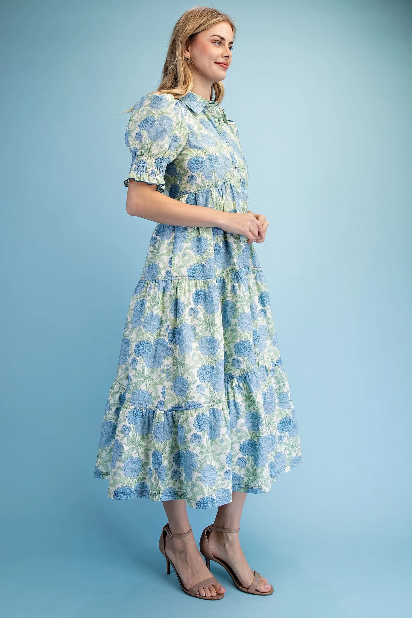 Floral Print Puff Sleeve Midi Dress with a Scalloped Waist and V-Neck. The Dress is Lined