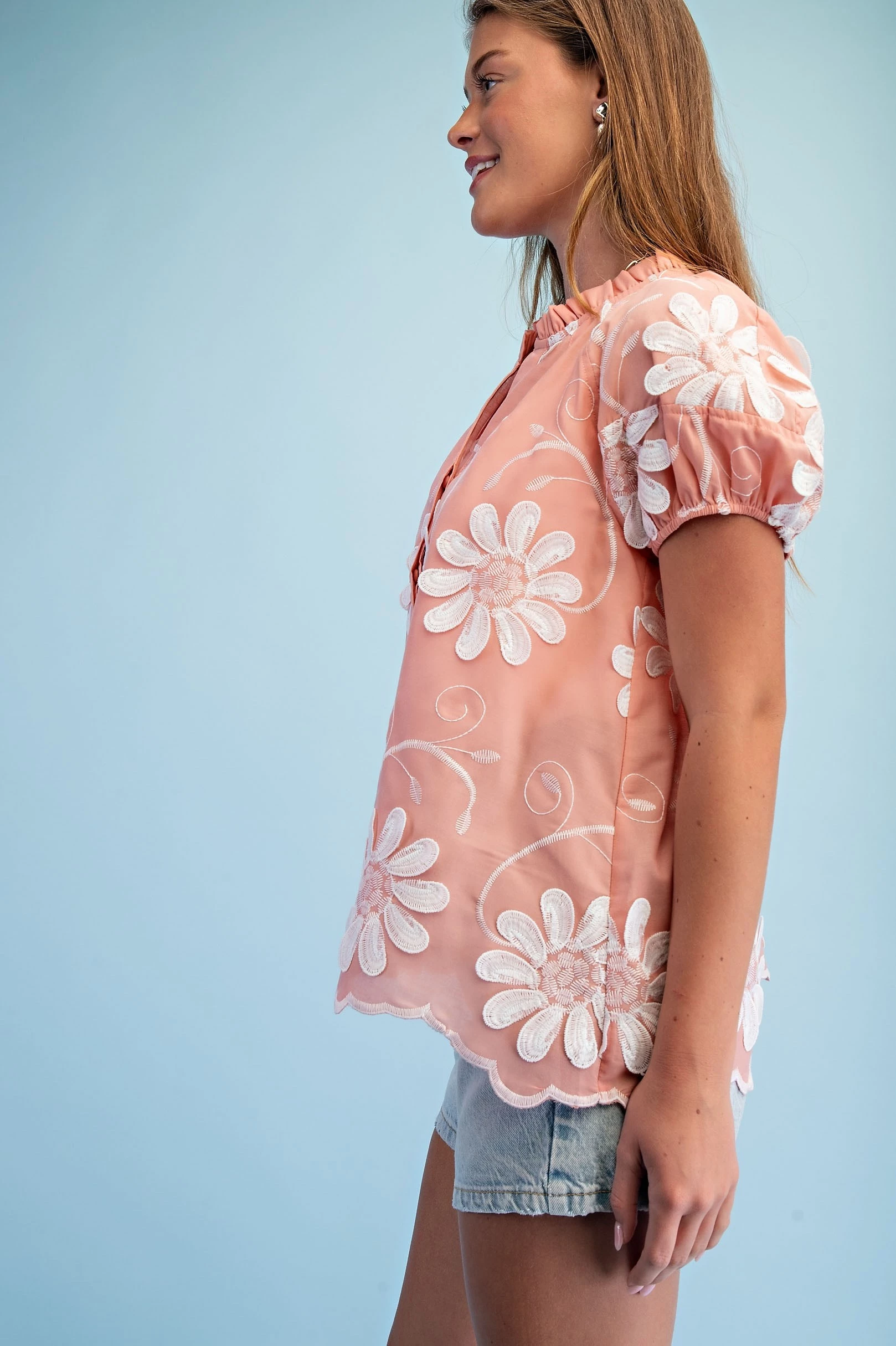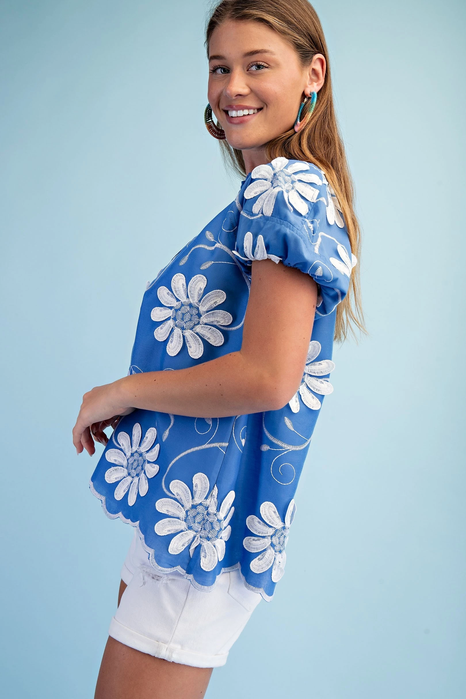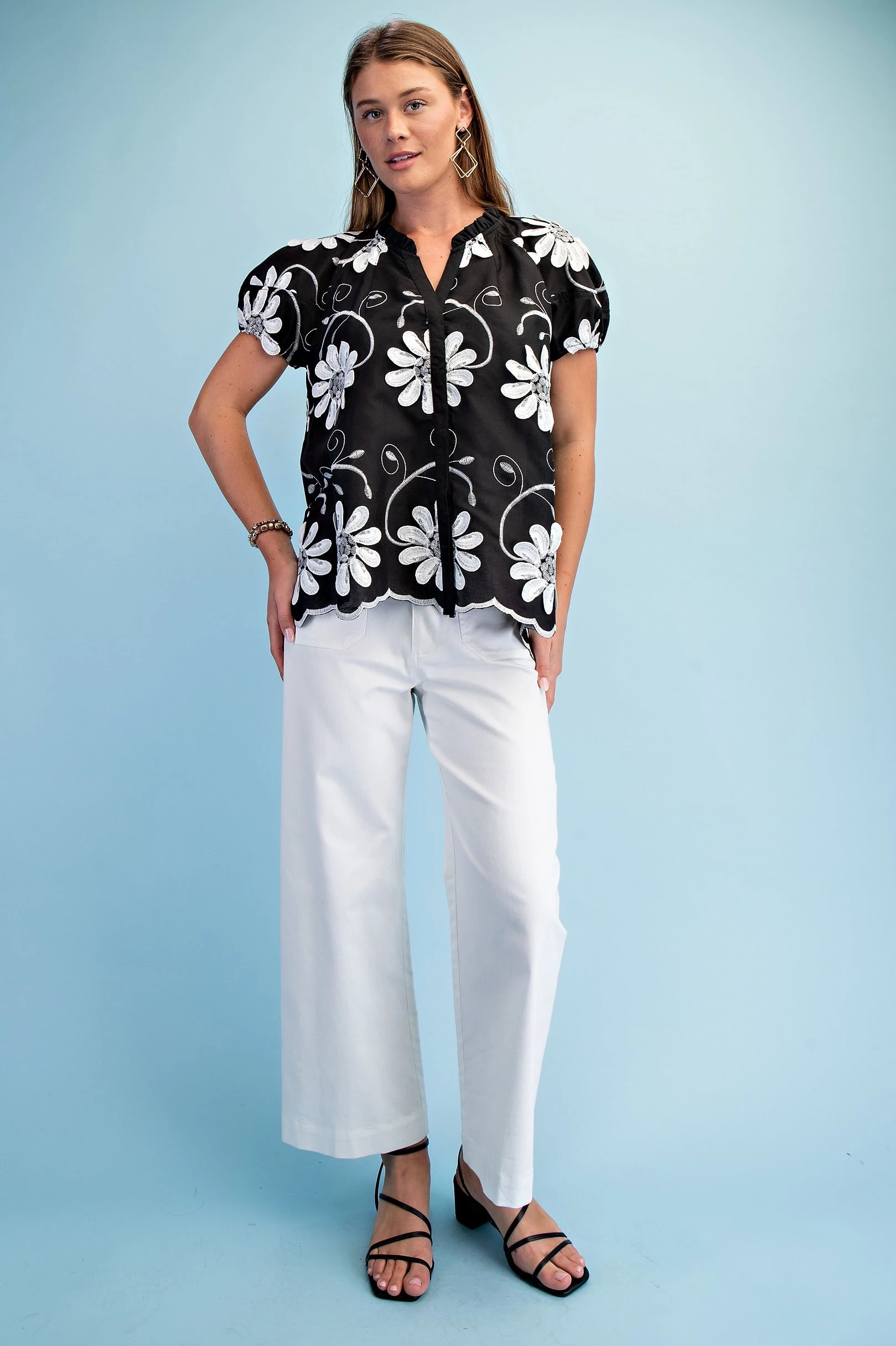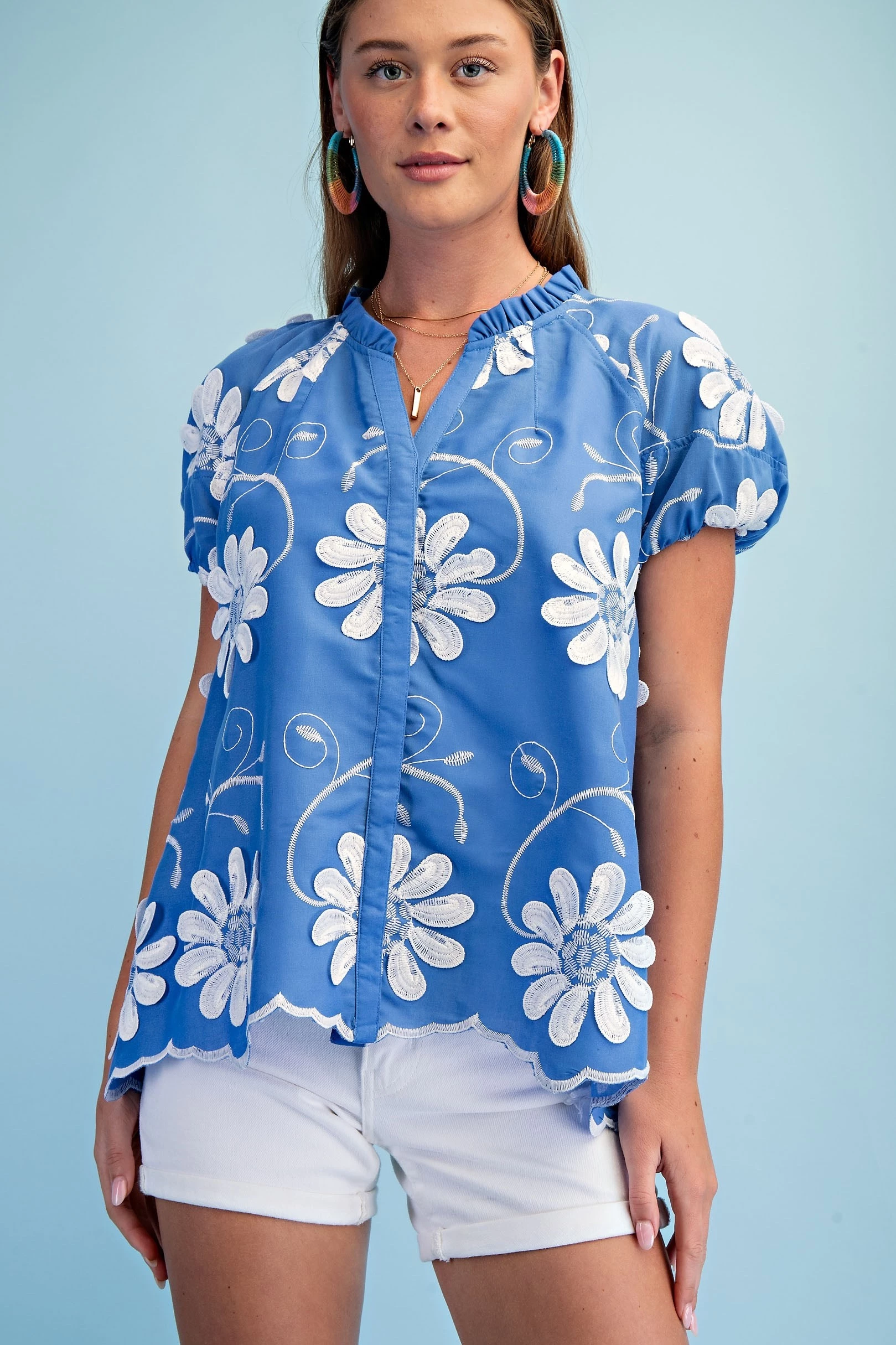 Floral Embroidered Top with a Scalloped Overlap Detail and a Decorative Trim
