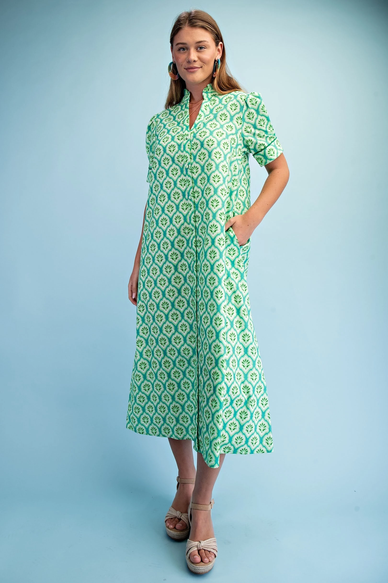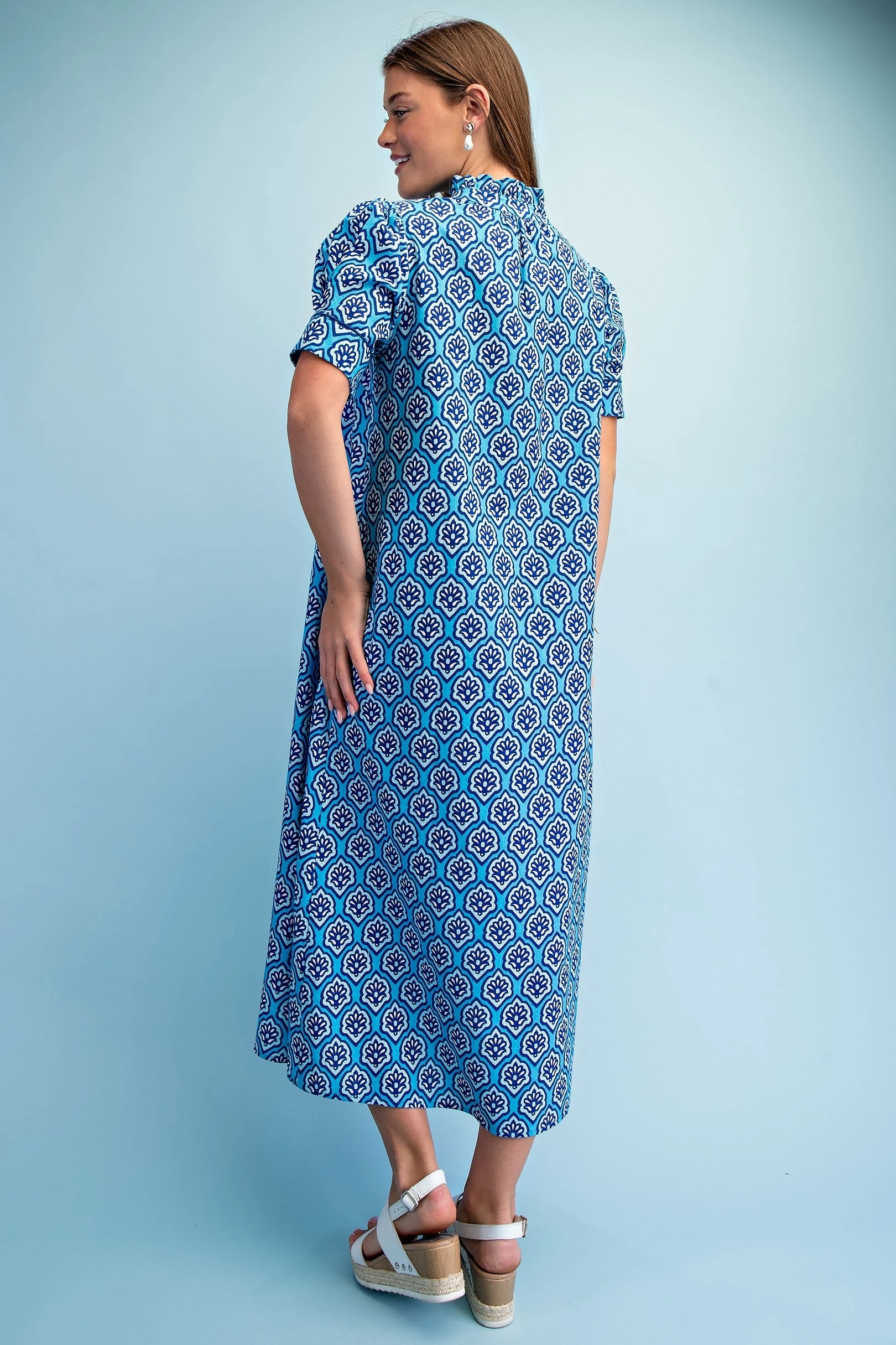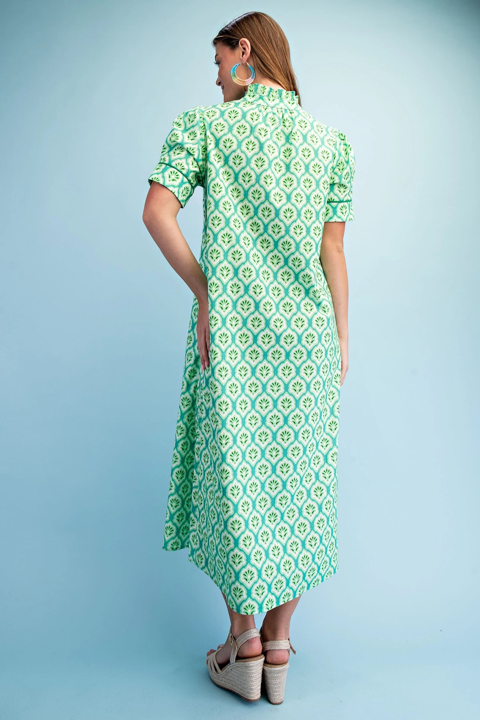 Bright Printed Button Down Midi Dress with a Ruffled Collar and Elastic Banded Arms