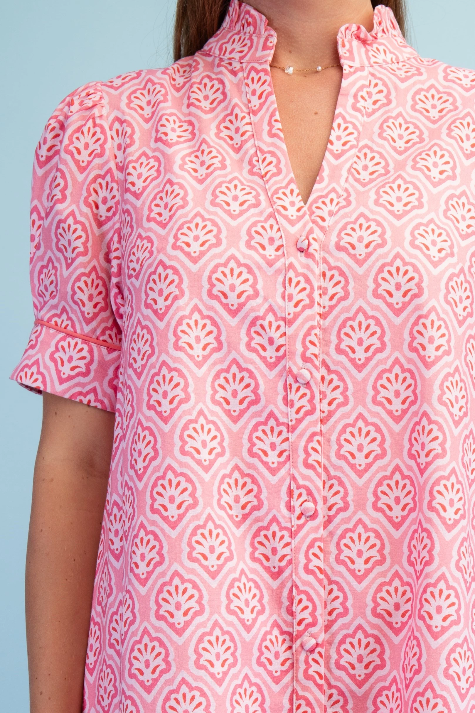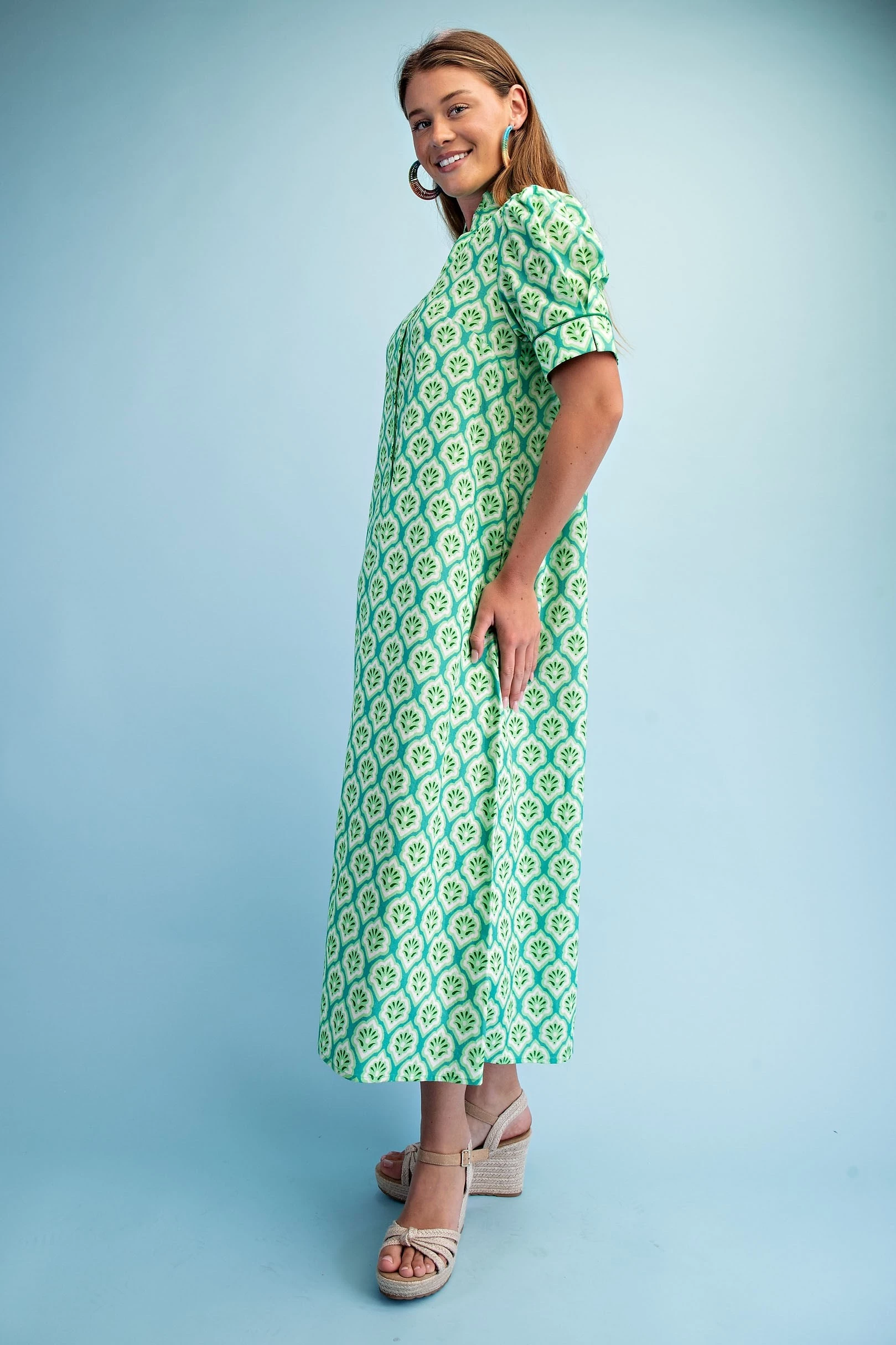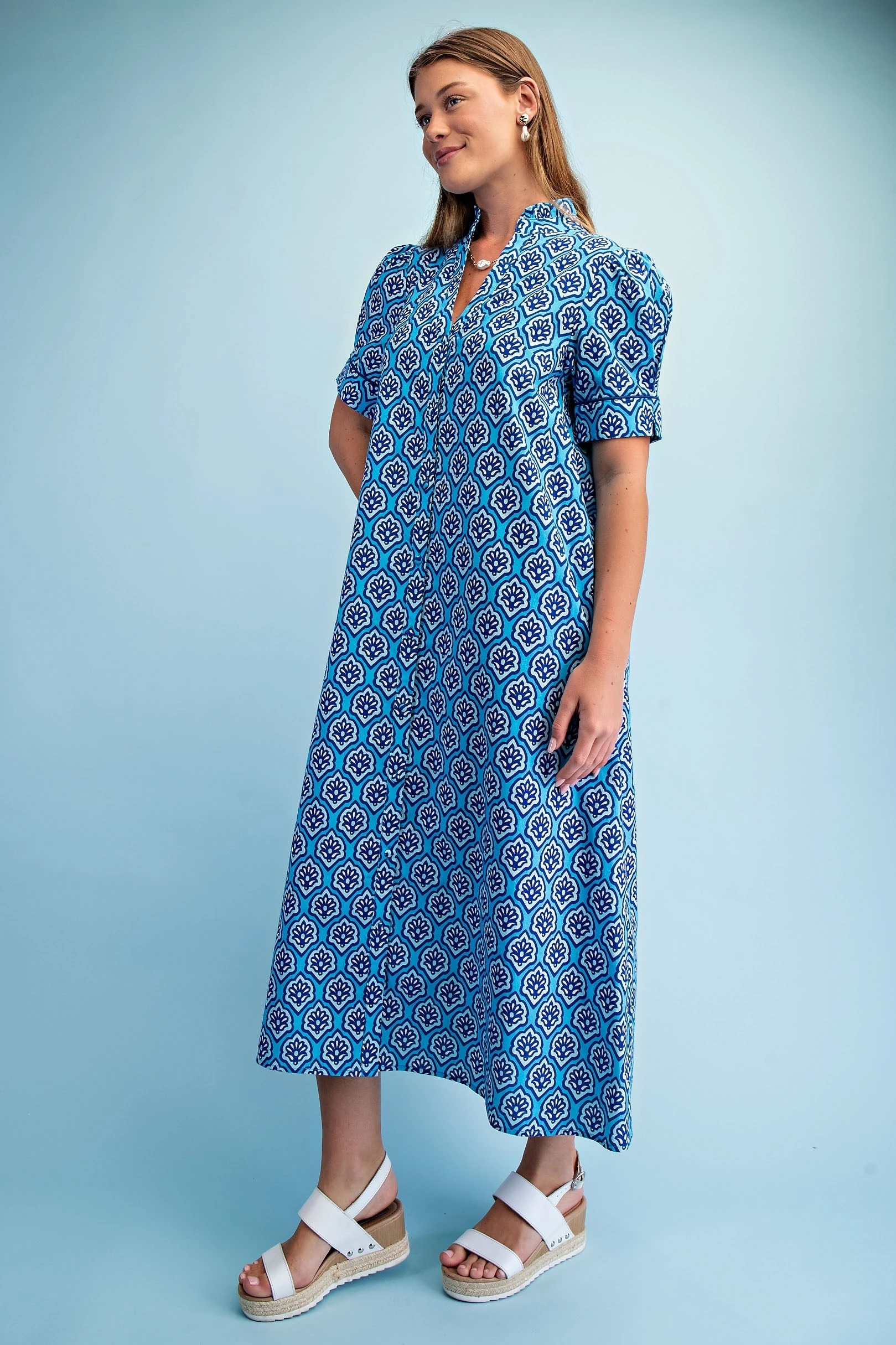 Bright Printed Button Down Midi Dress with a Ruffled Collar and Elastic Banded Arms