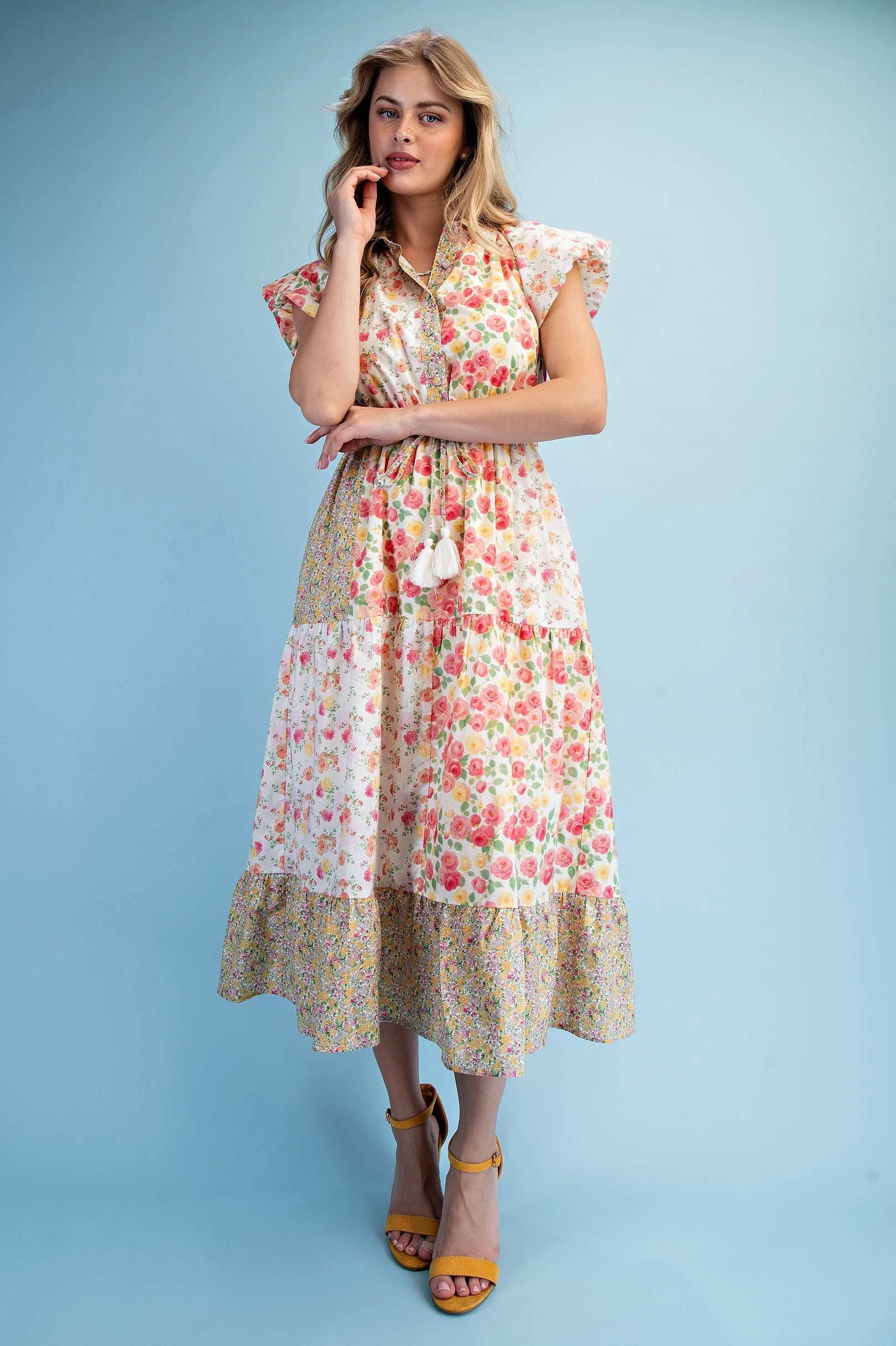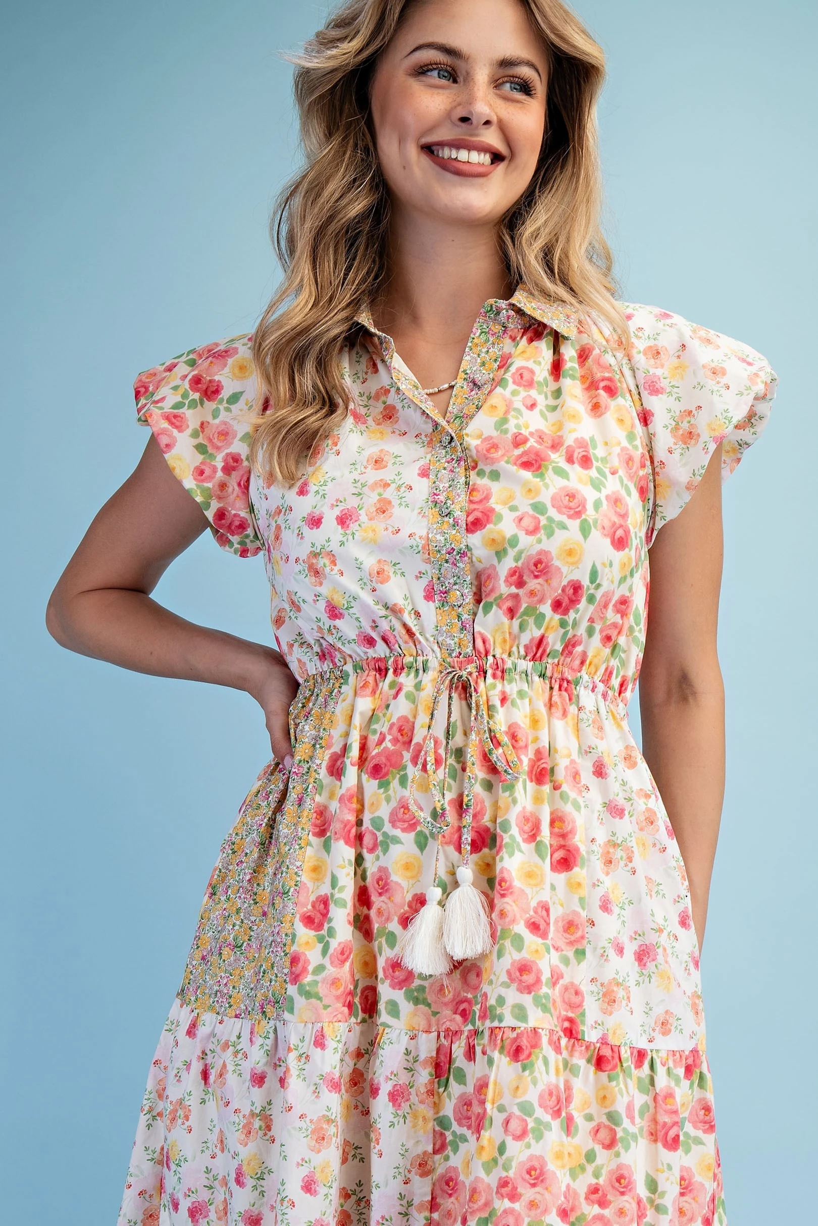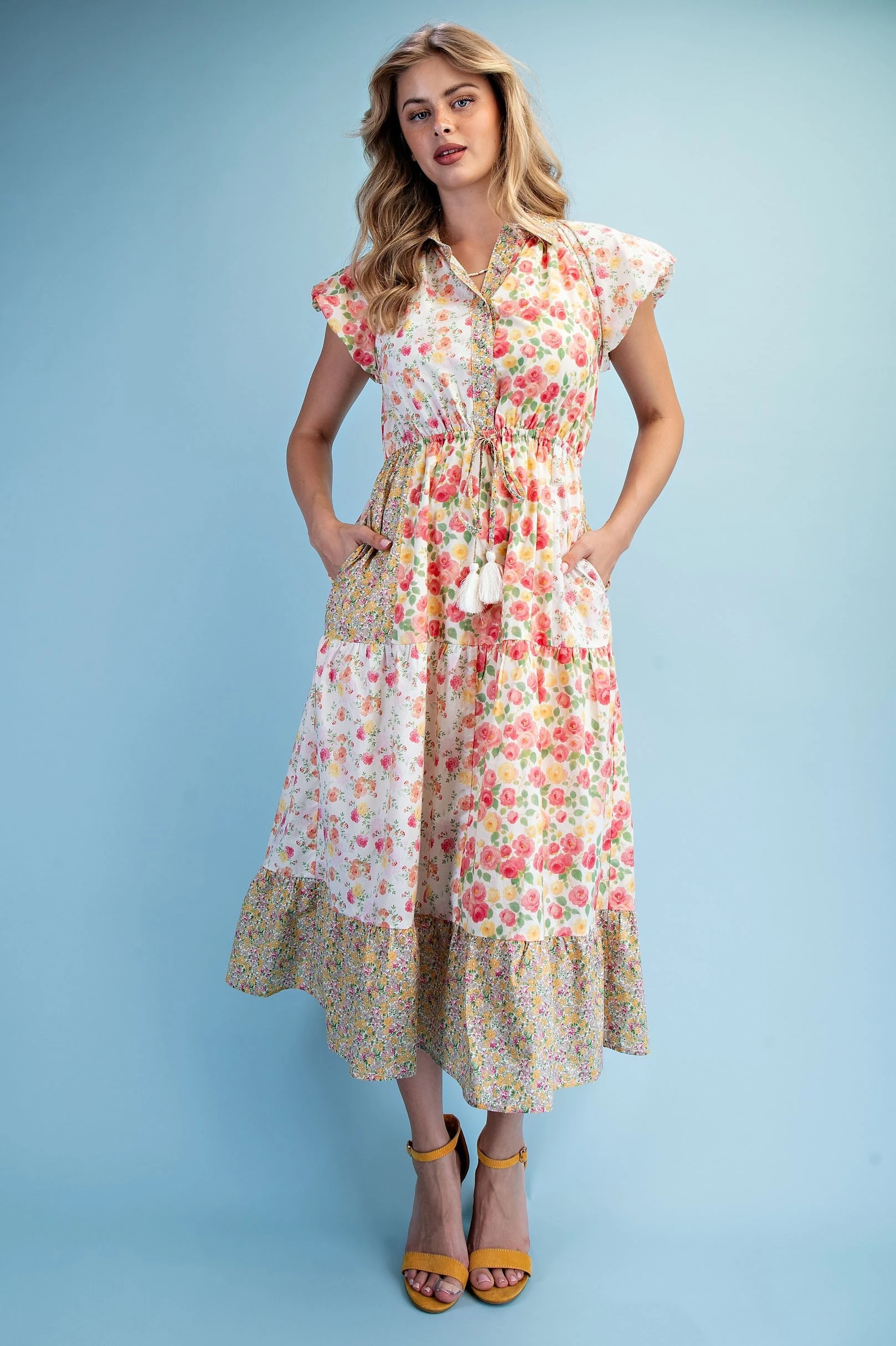 Mixed Floral Print Half Button Tiered Shirt Dress with an Adjustable Drawstring Waist and Tassel Tie. The Dress is Lined