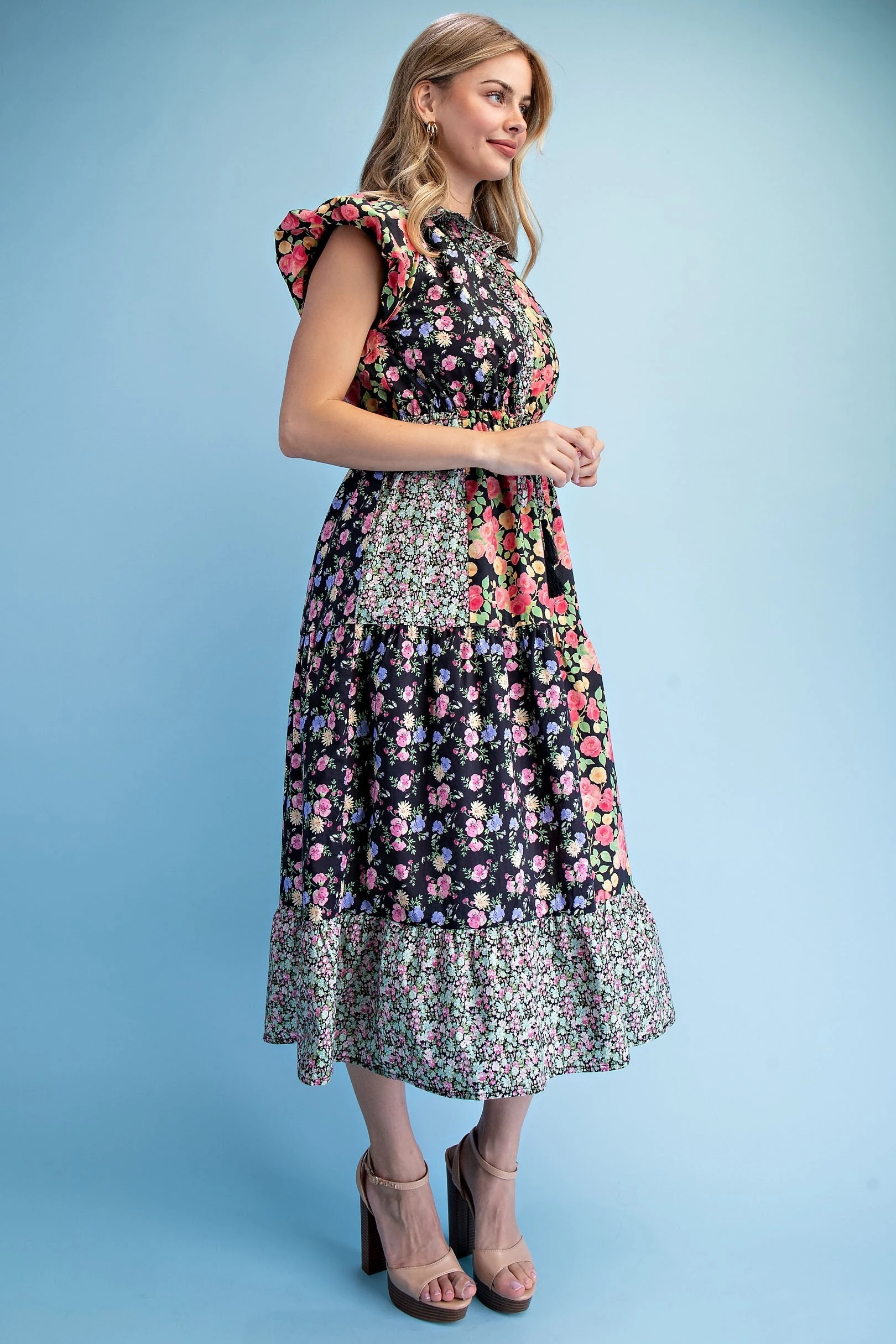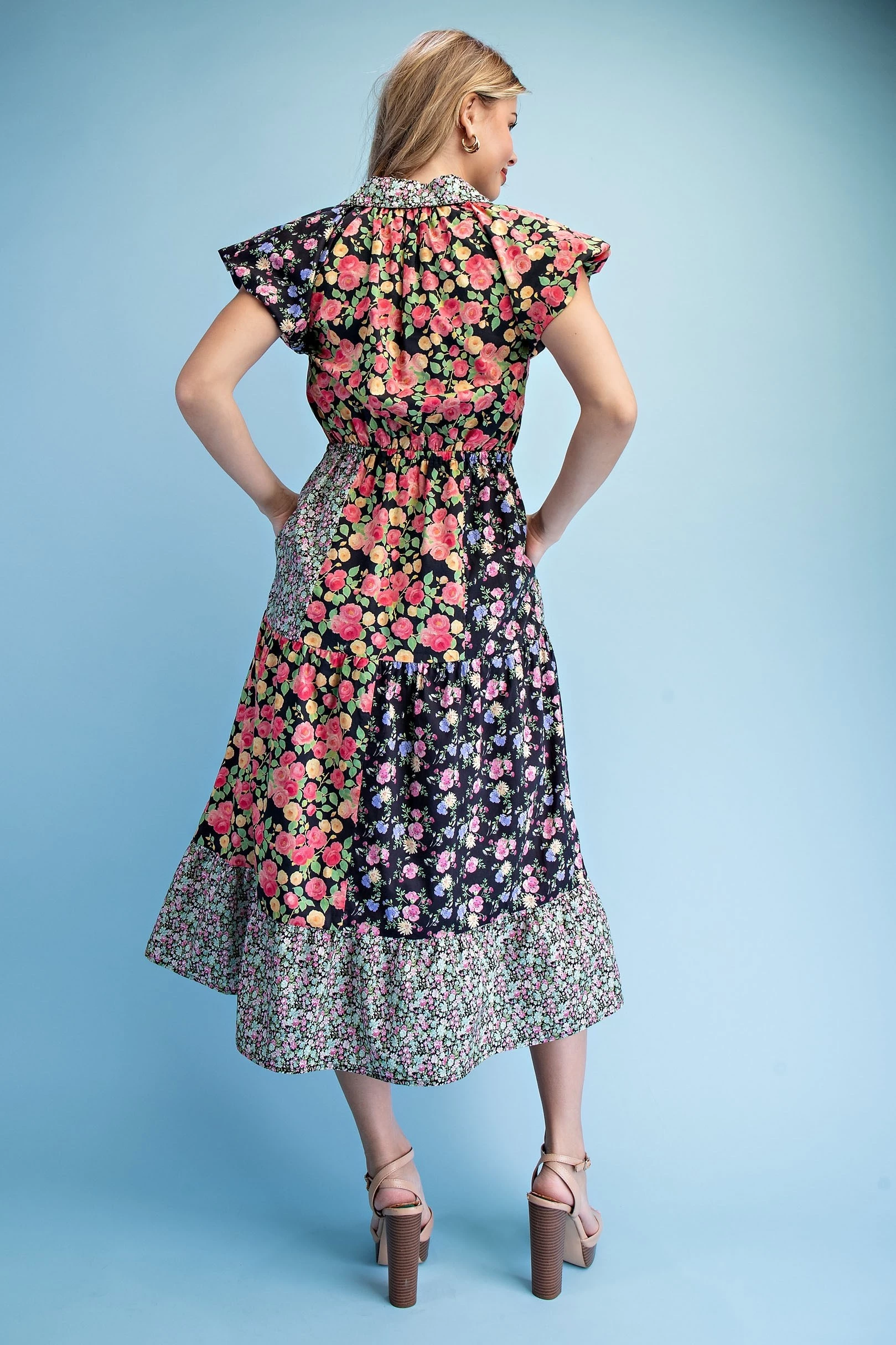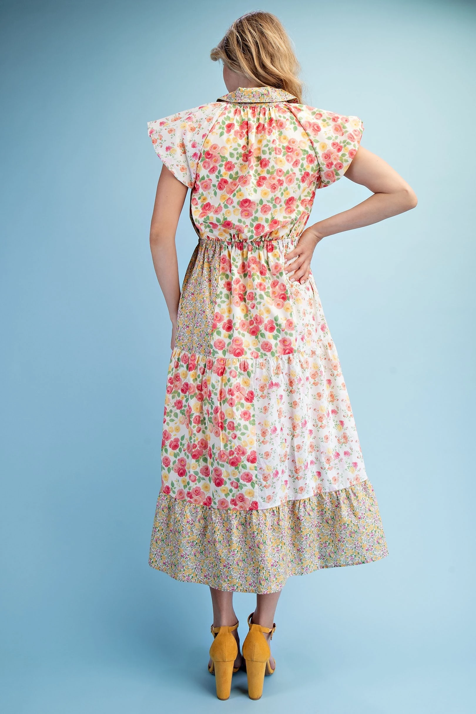 Mixed Floral Print Half Button Tiered Shirt Dress with an Adjustable Drawstring Waist and Tassel Tie. The Dress is Lined