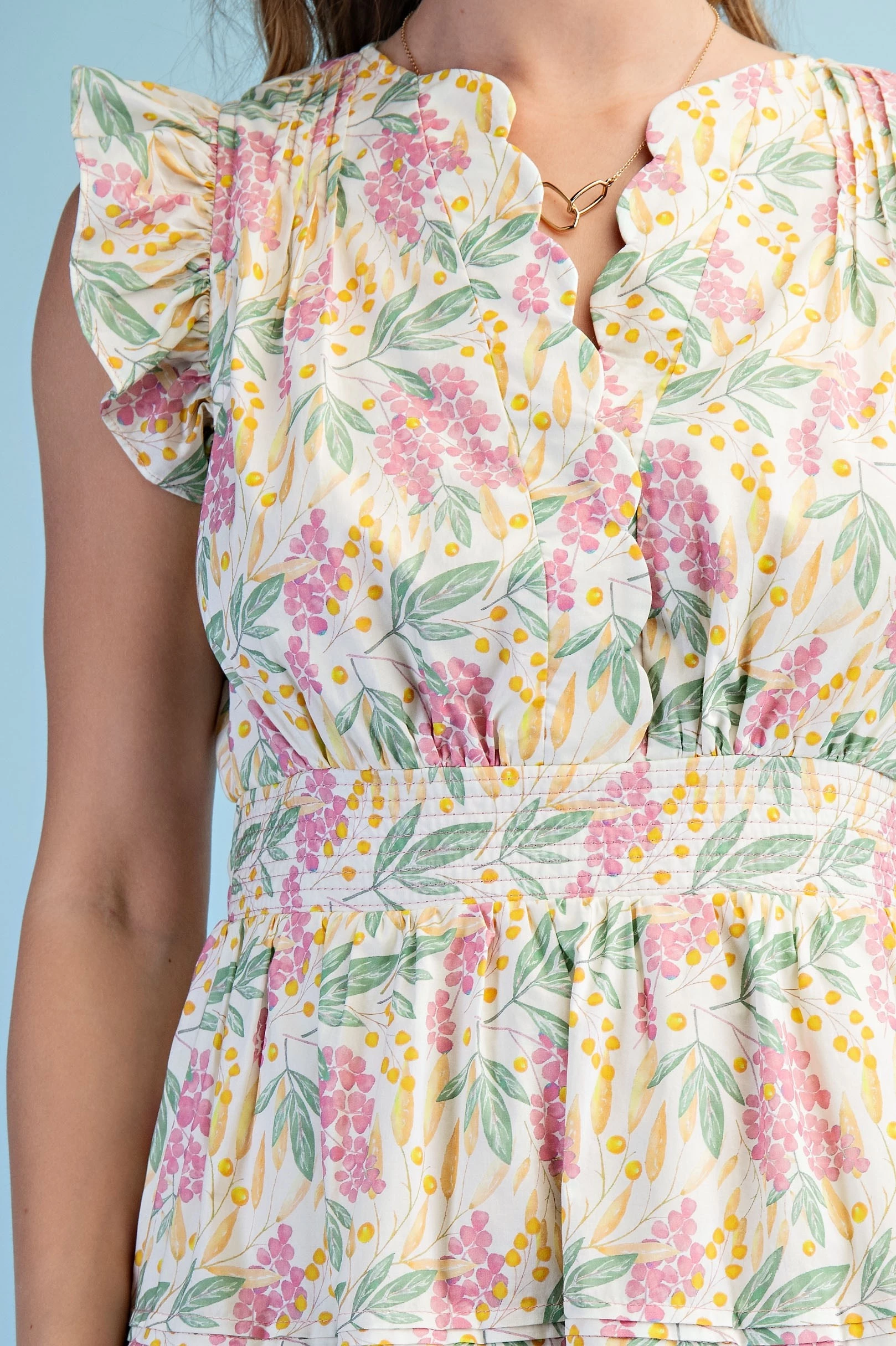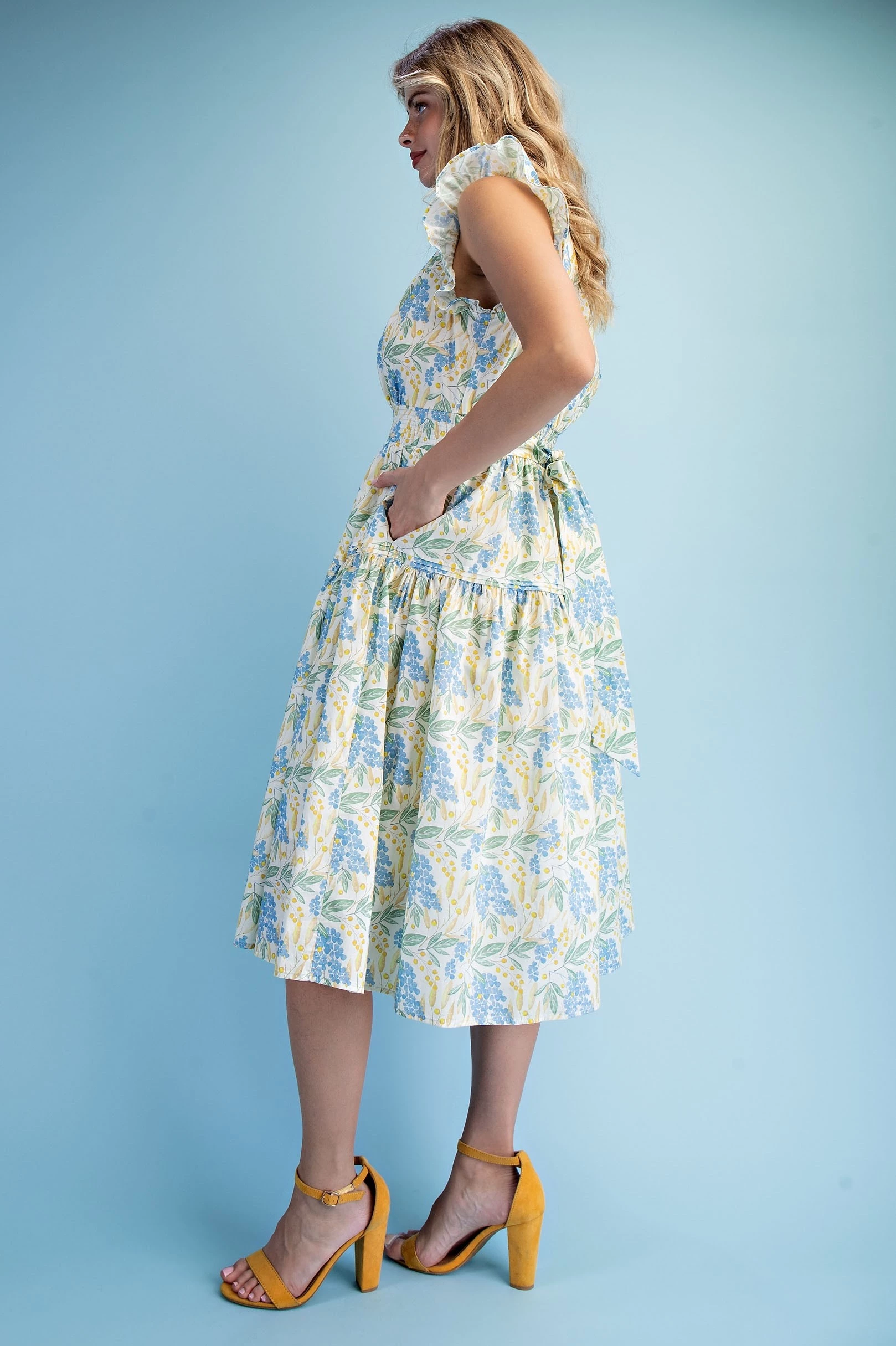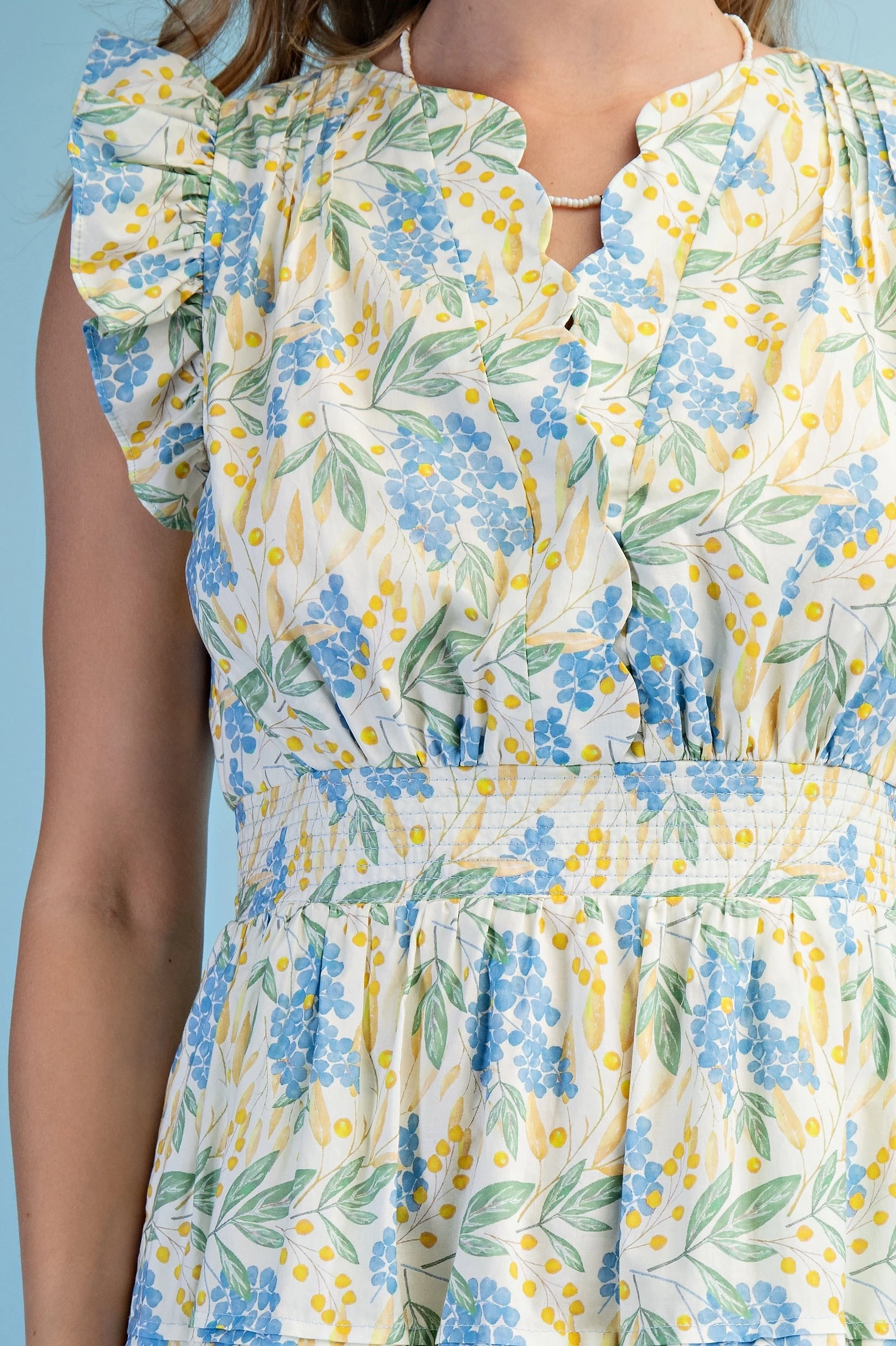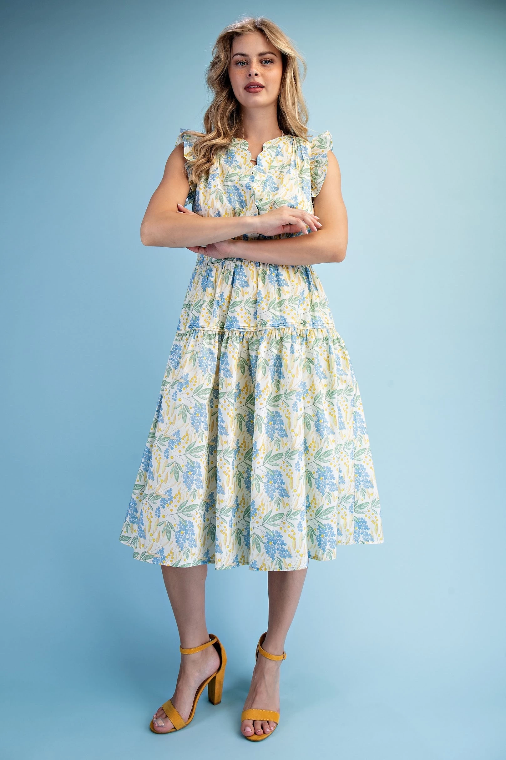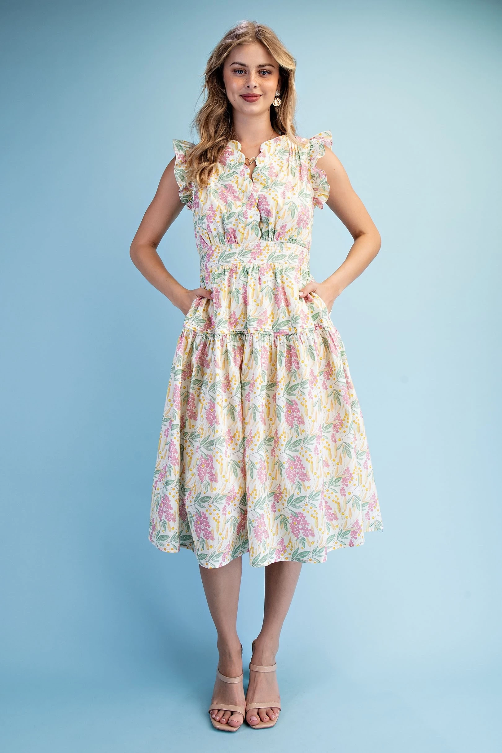 Floral Print Ruffle Sleeve Midi Dress with a Scalloped Snap Closure Neck and a Back Elastic Waist. The Dress is Lined