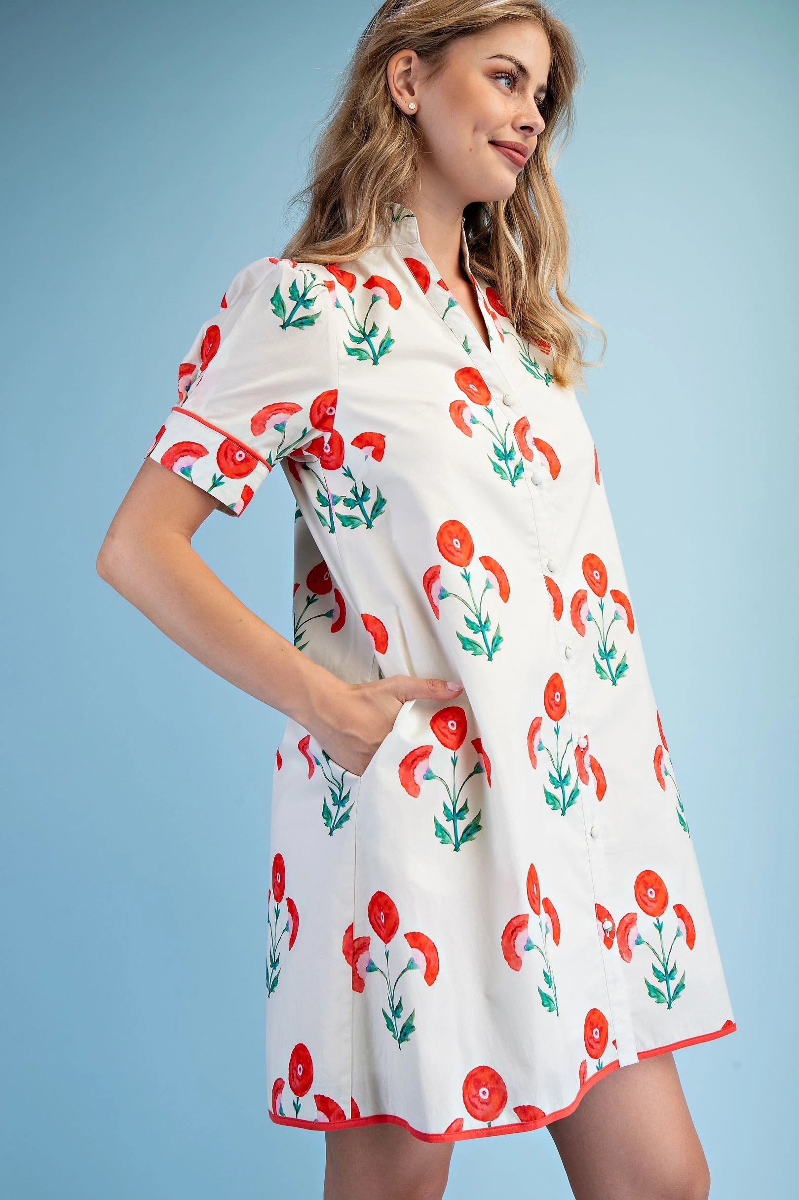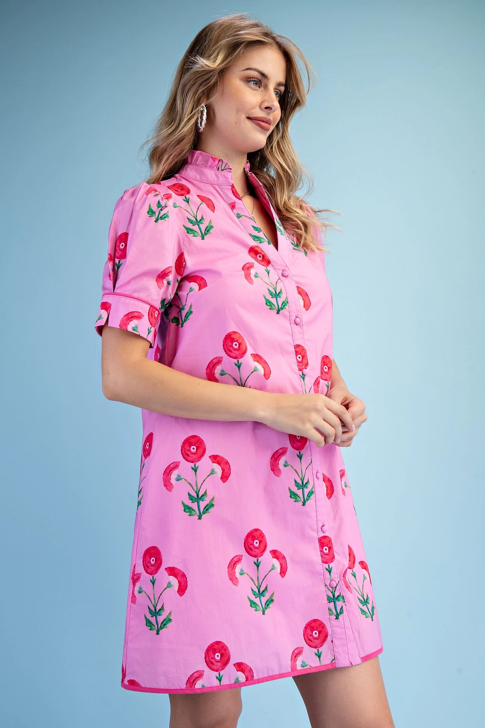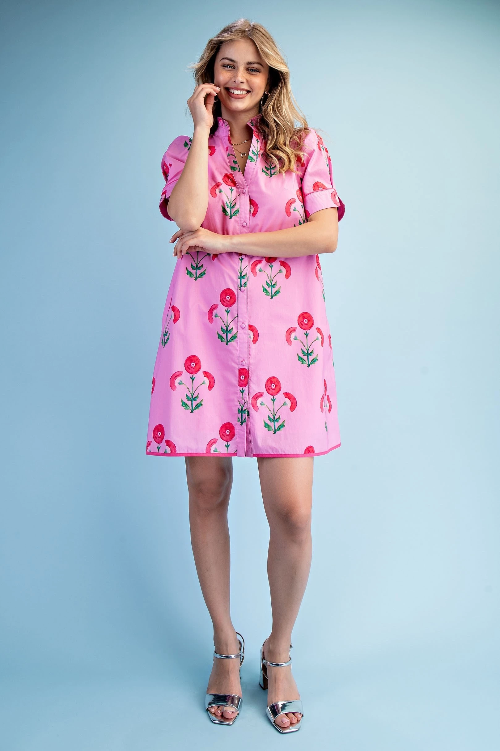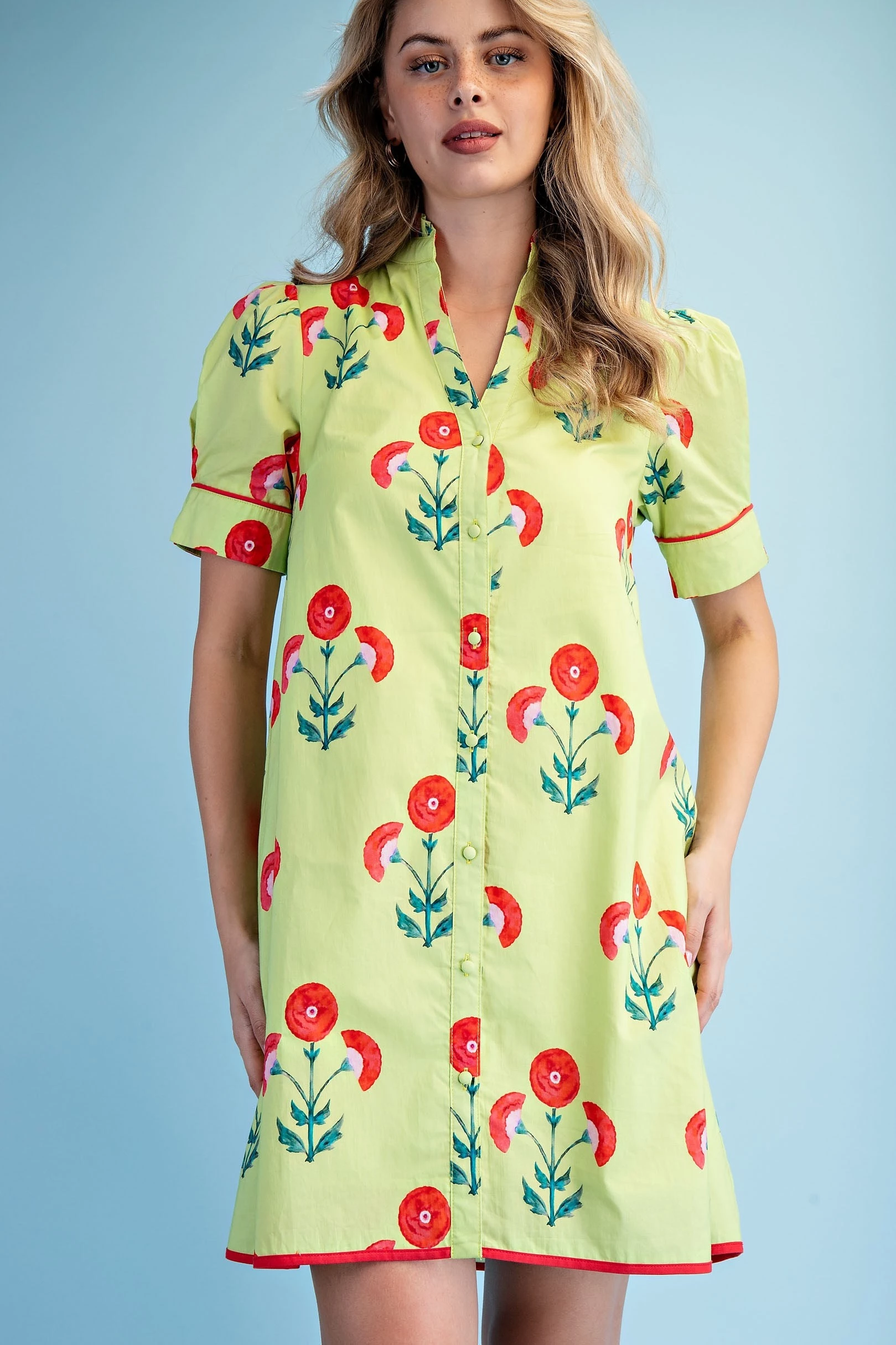 Bright Floral Button Down Dress with Pleated Short Sleeves and Piping Details. The Dress is Lined