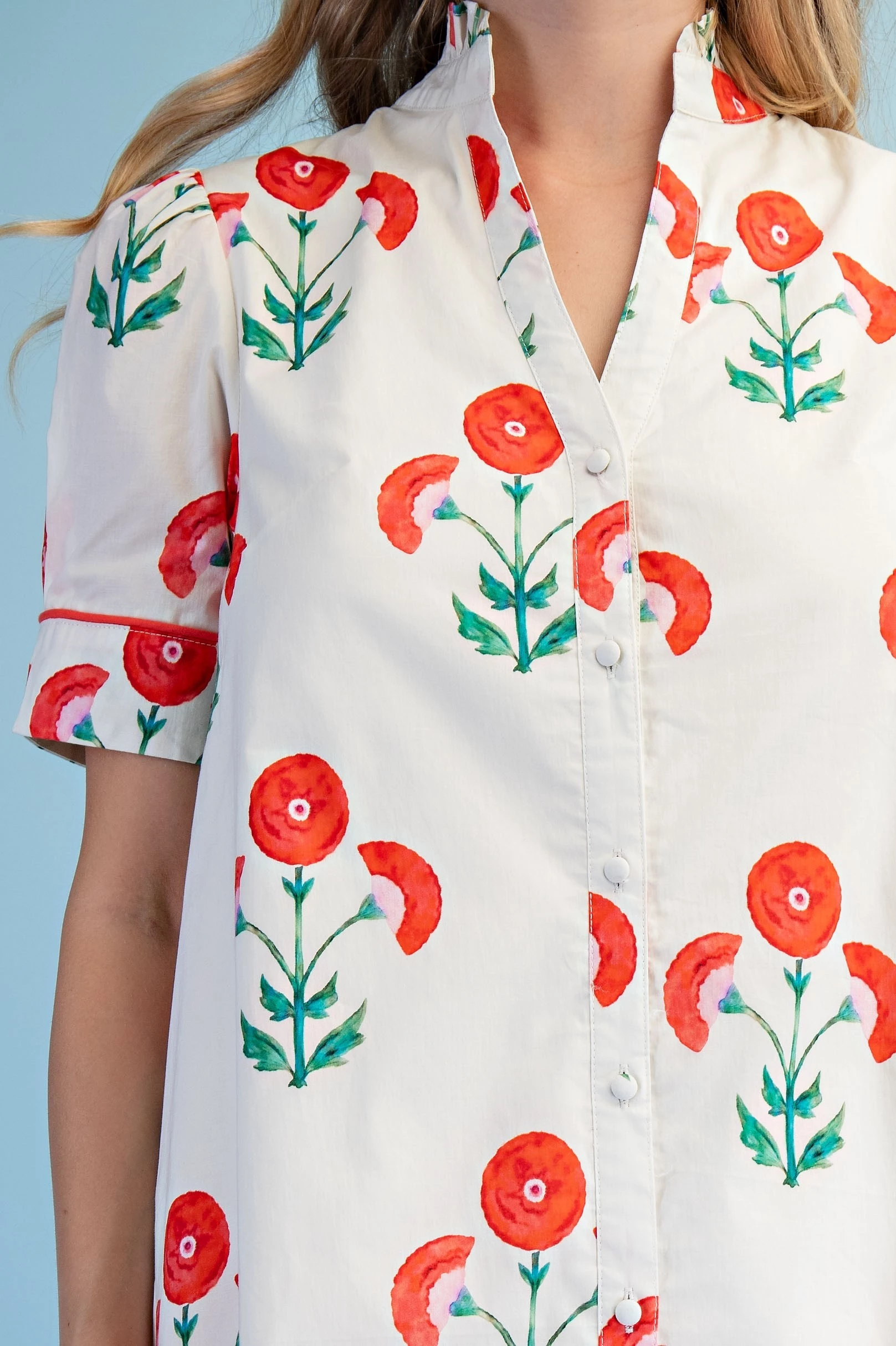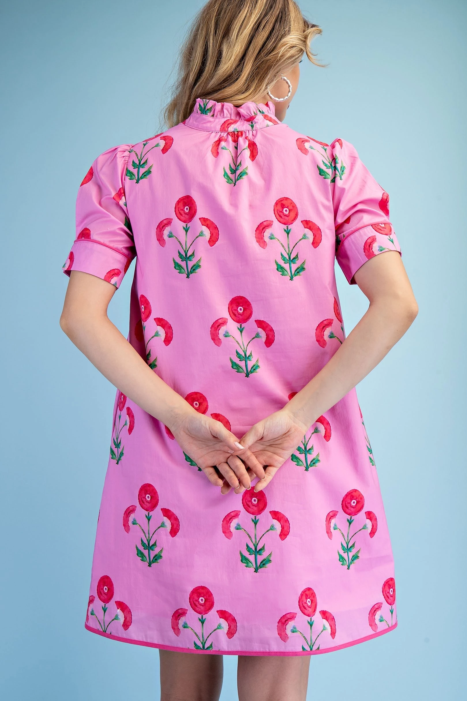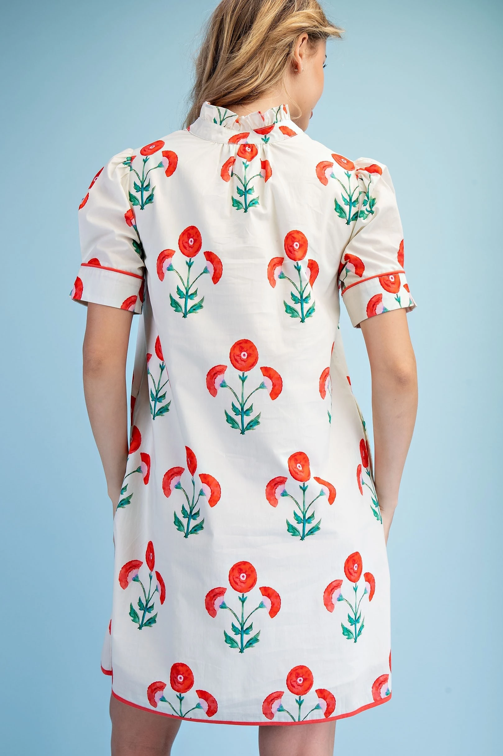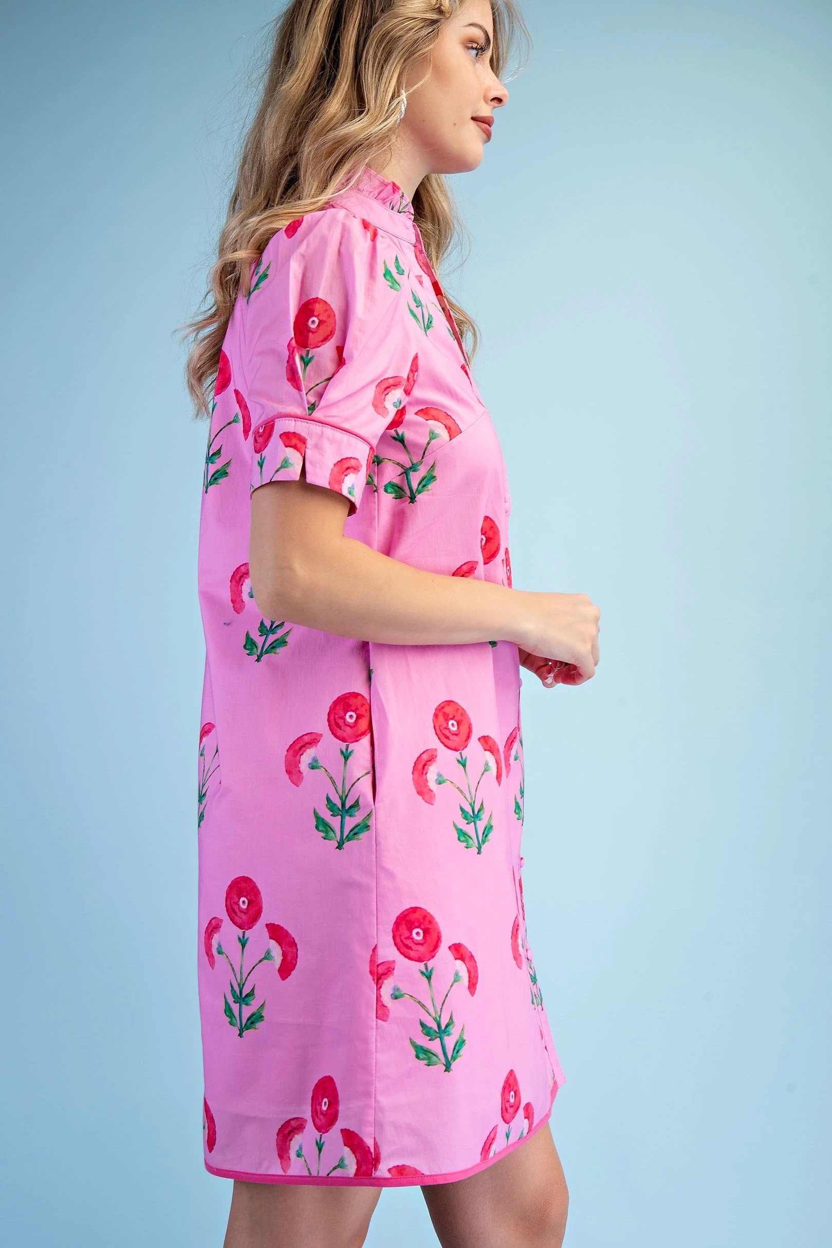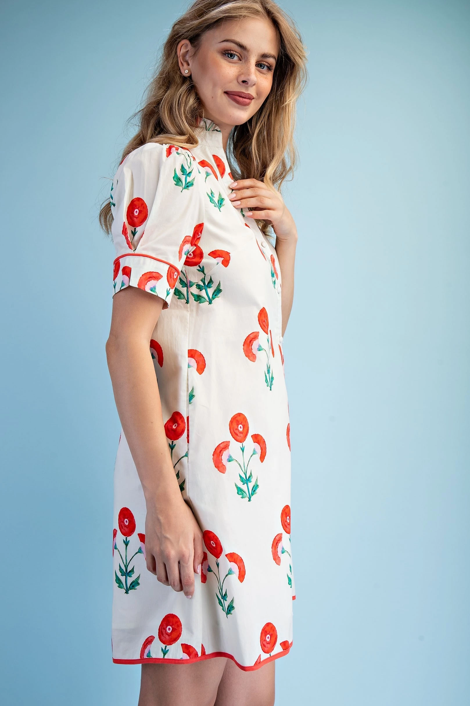 Bright Floral Button Down Dress with Pleated Short Sleeves and Piping Details. The Dress is Lined