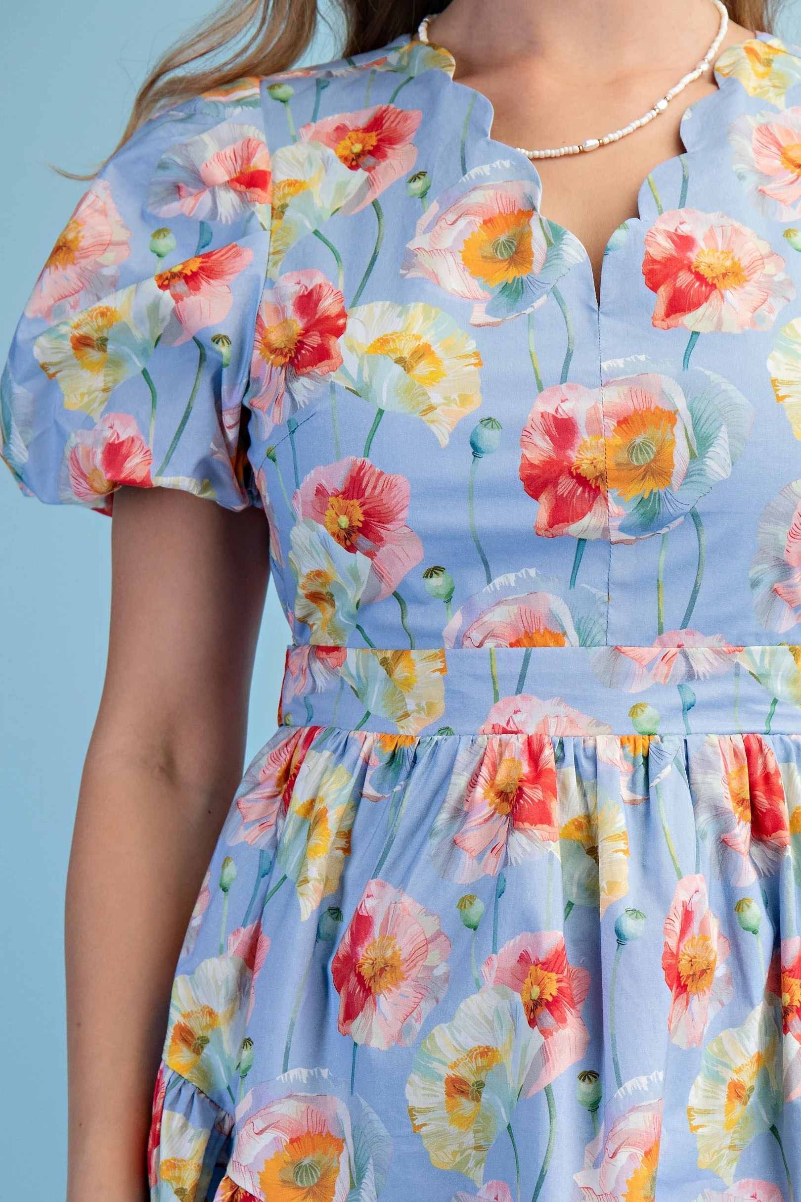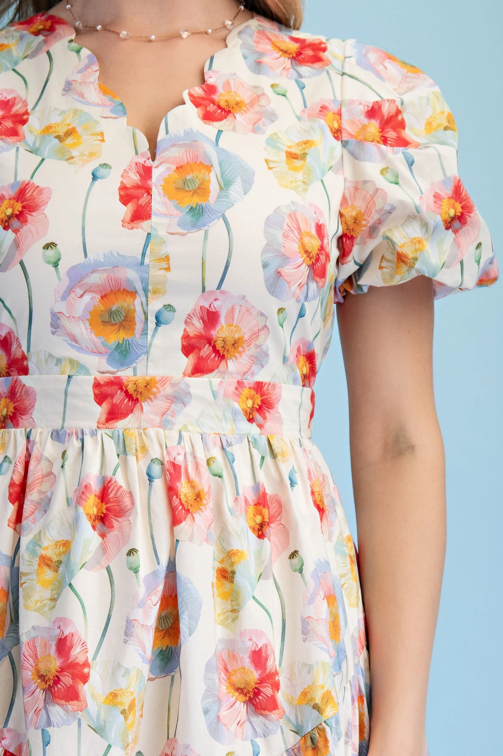 Printed Smocked Yoke Midi Dress with Short Balloon Sleeves