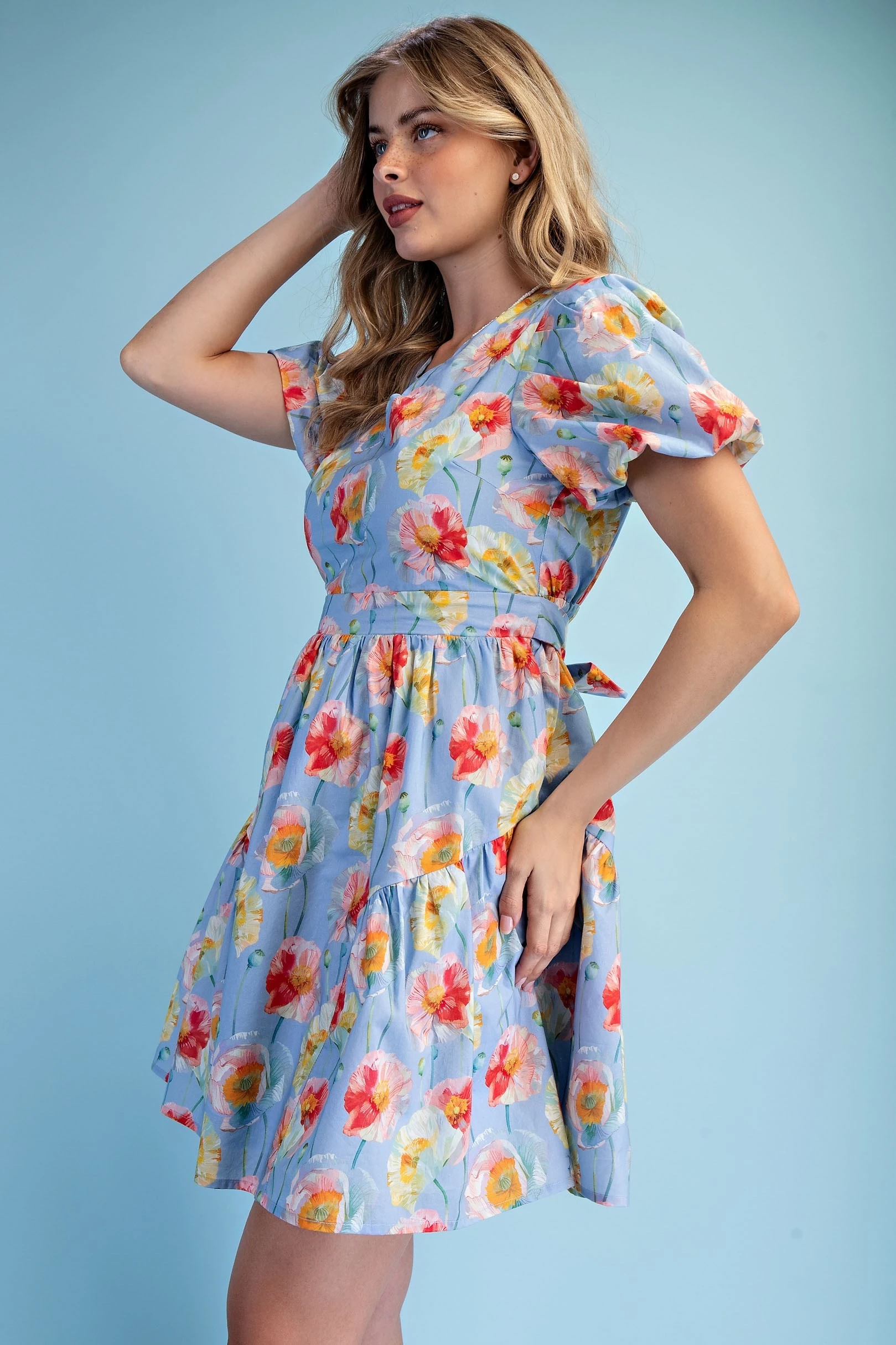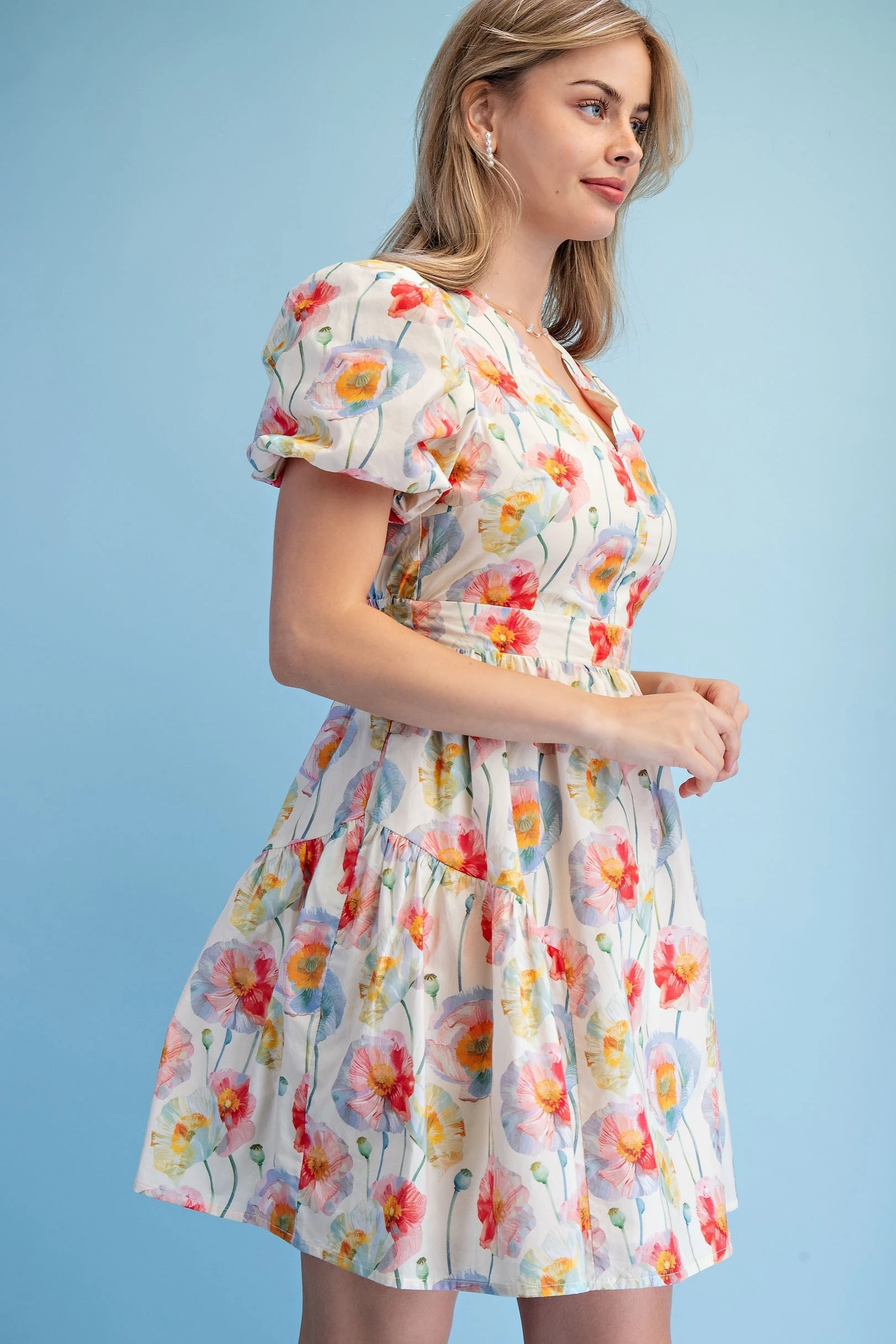 Floral Half Button Dress with a Smocked Neck and Trim Detail at Waist. The Dress is Lined