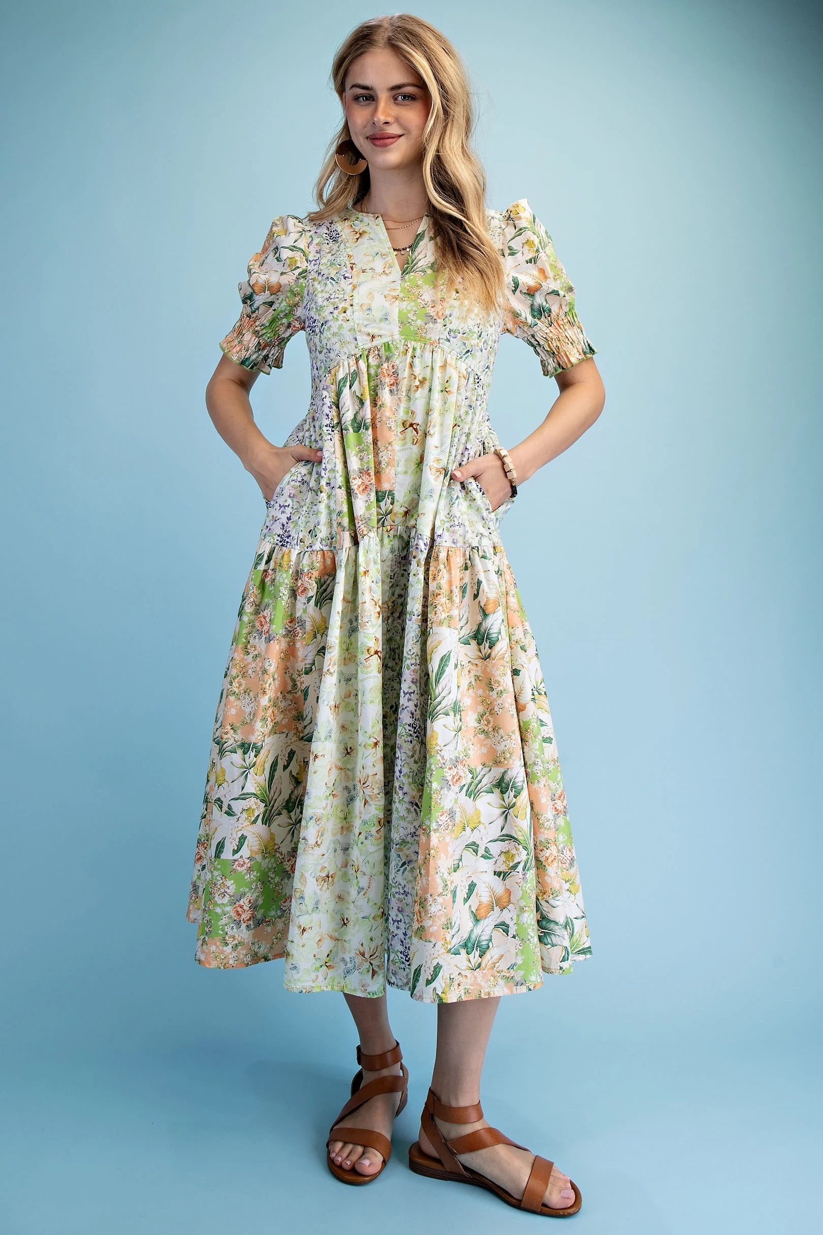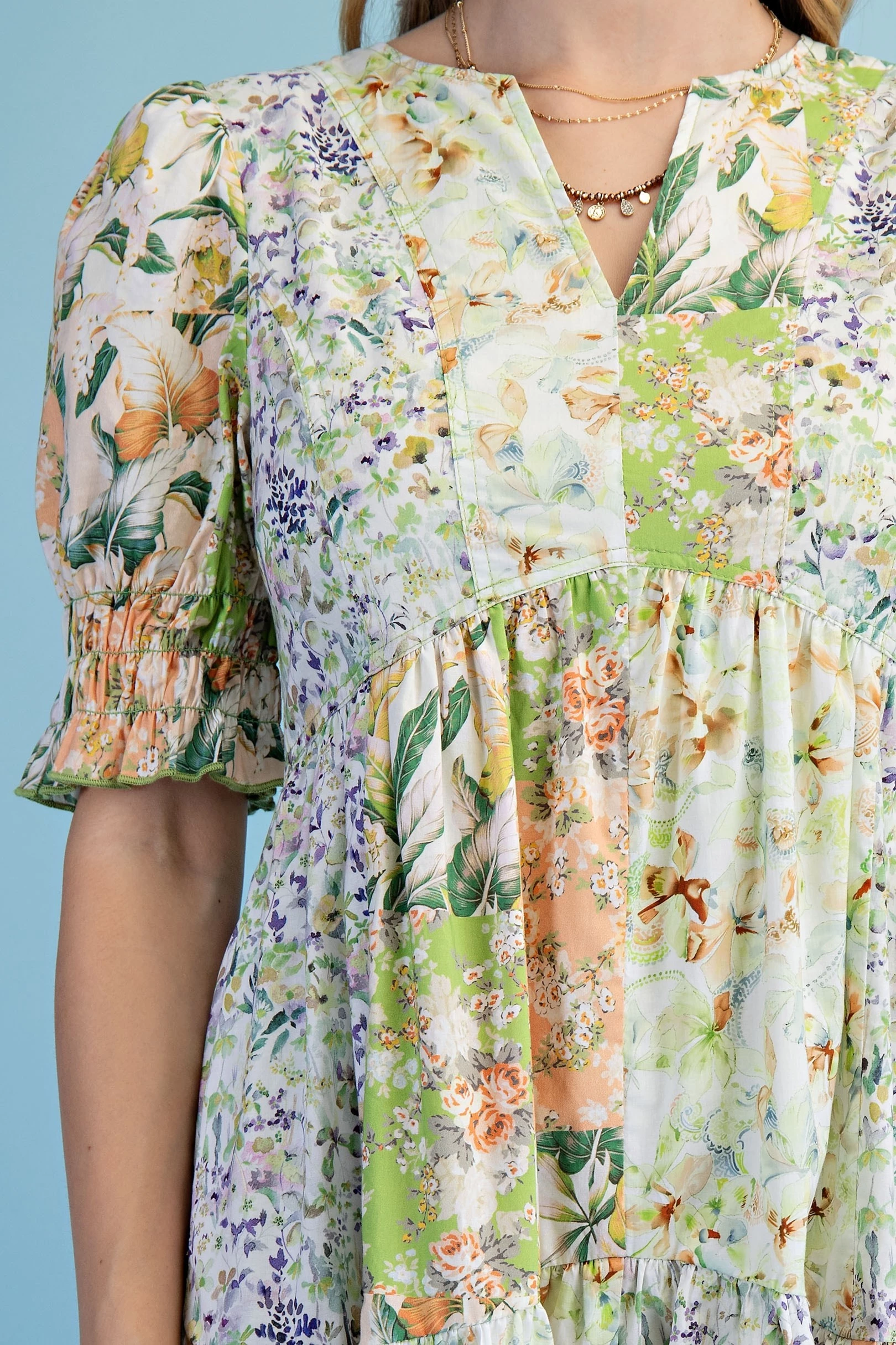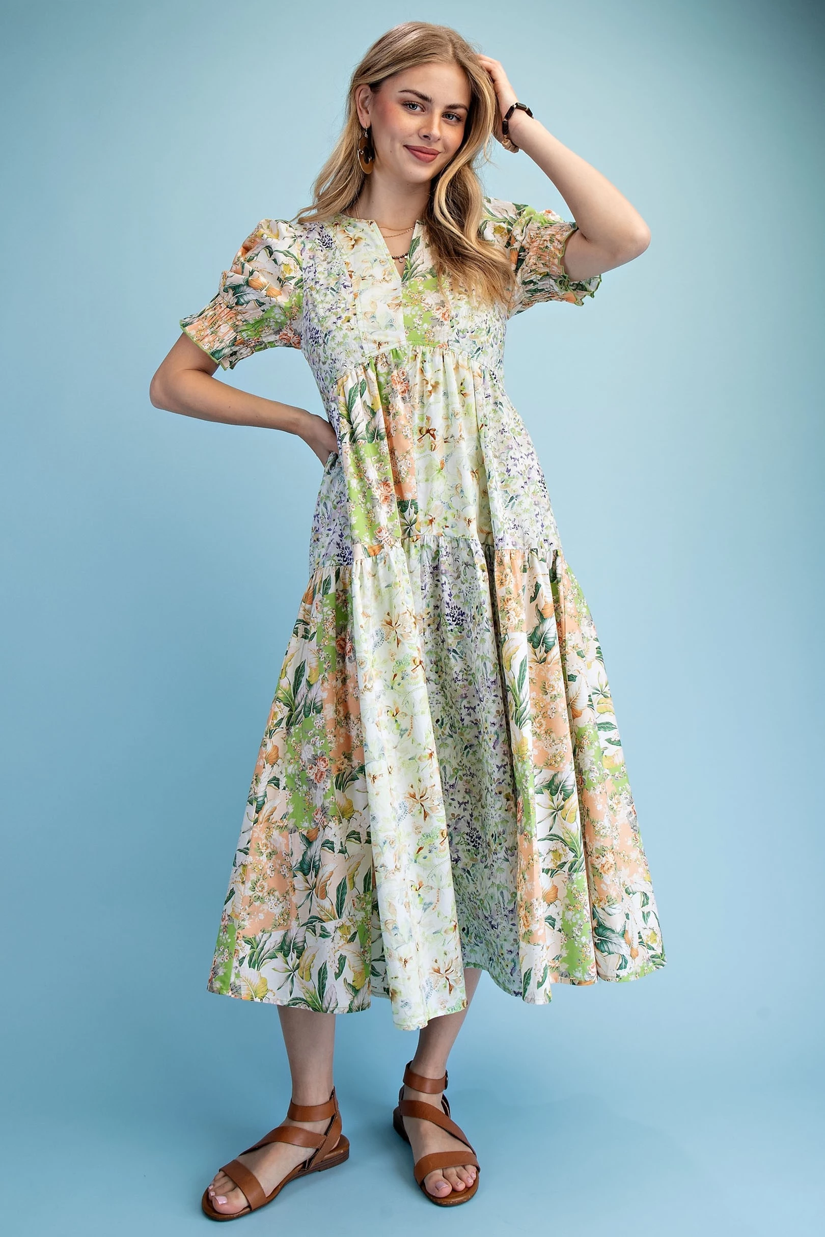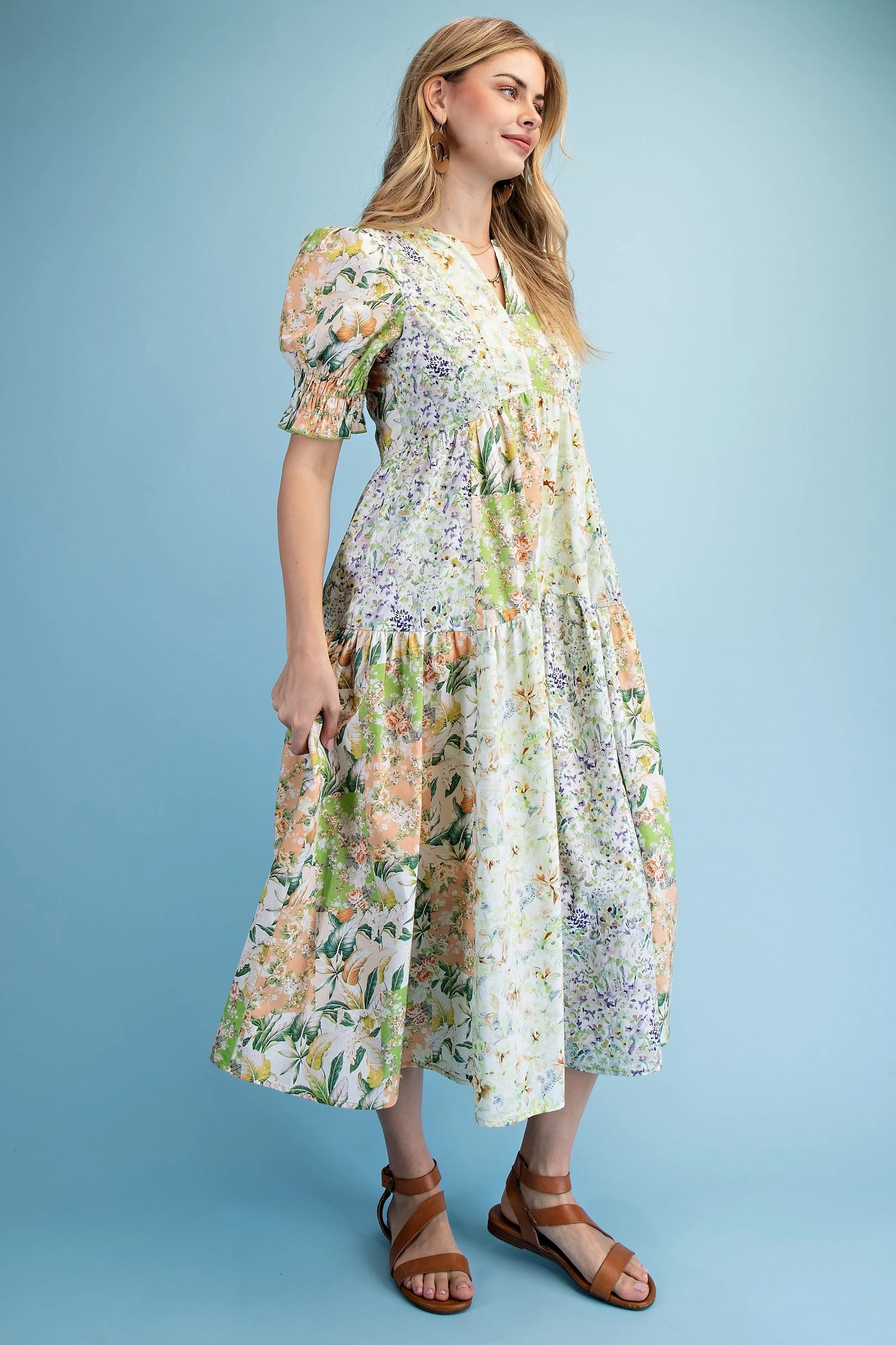Mixed Print Tiered Midi Dress with Ruffle Neck