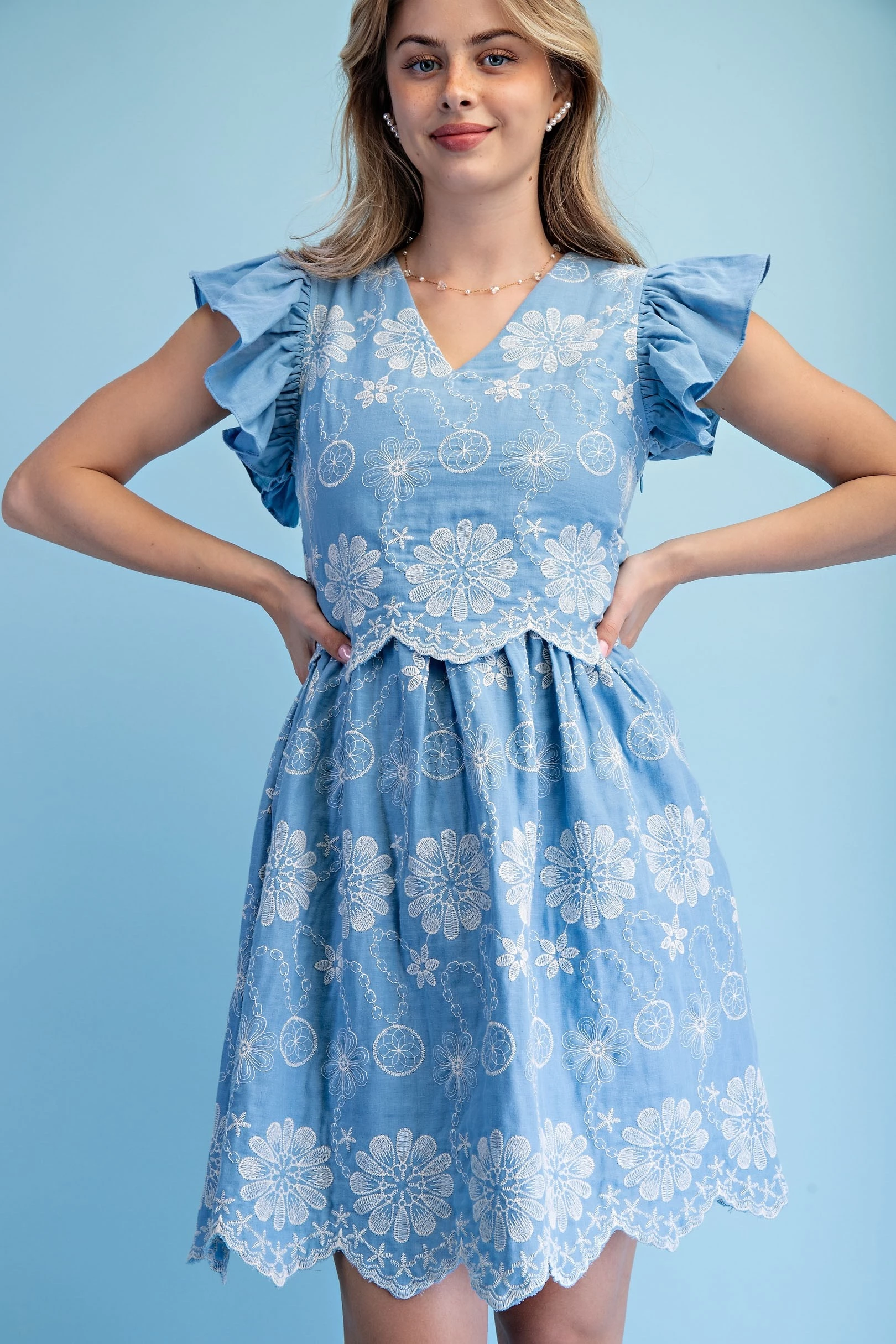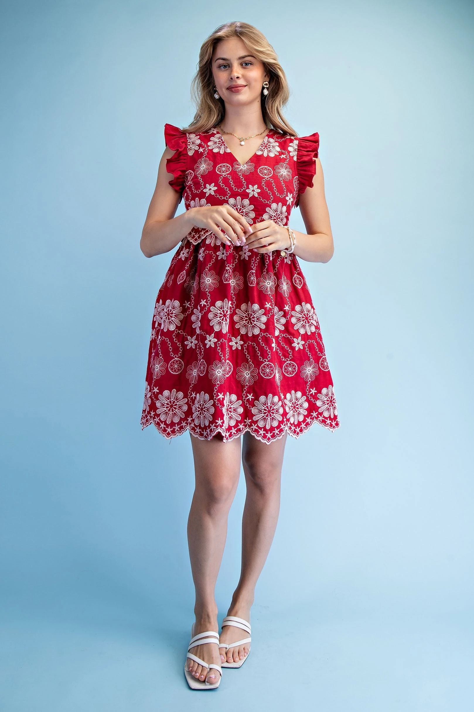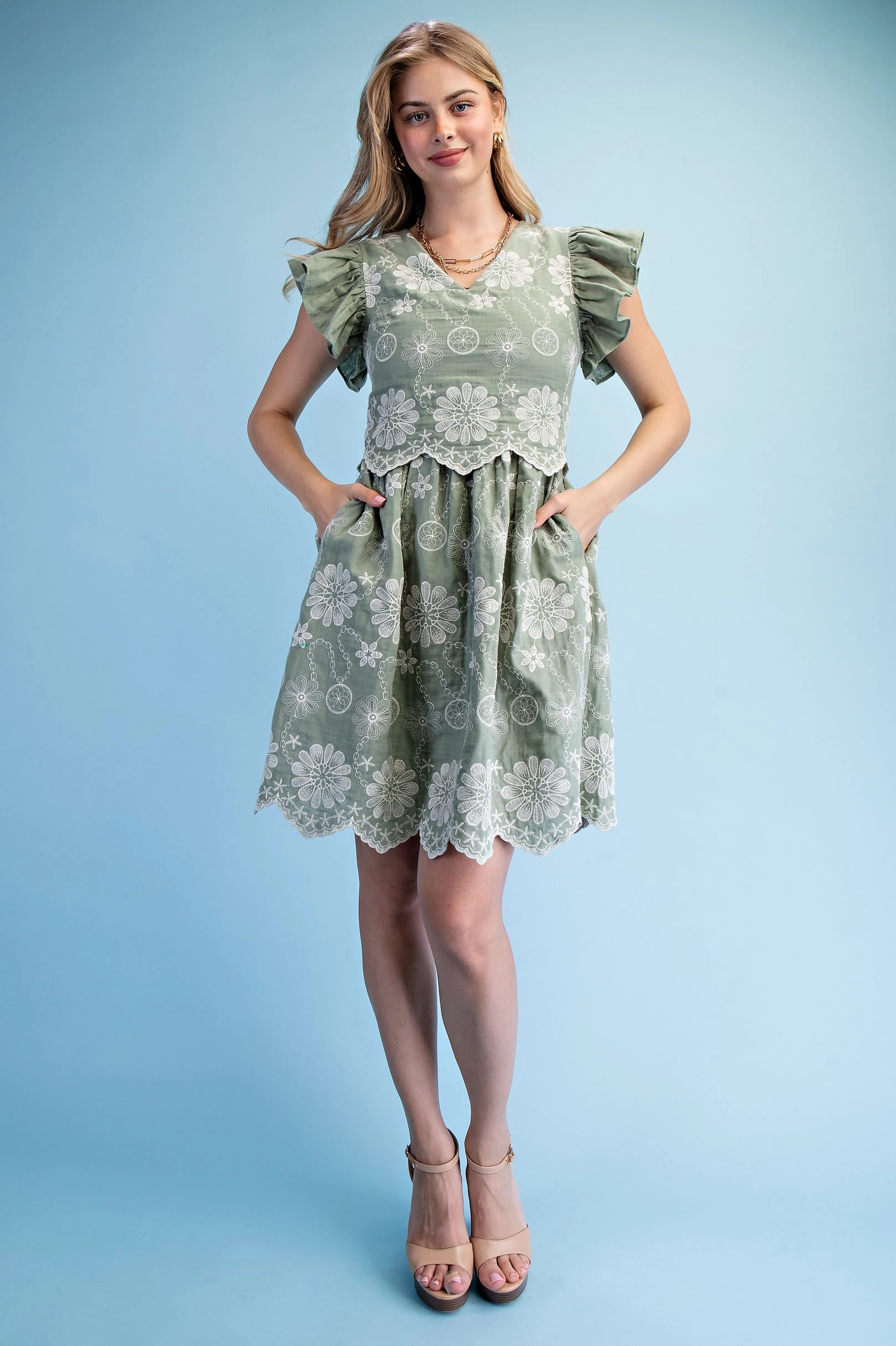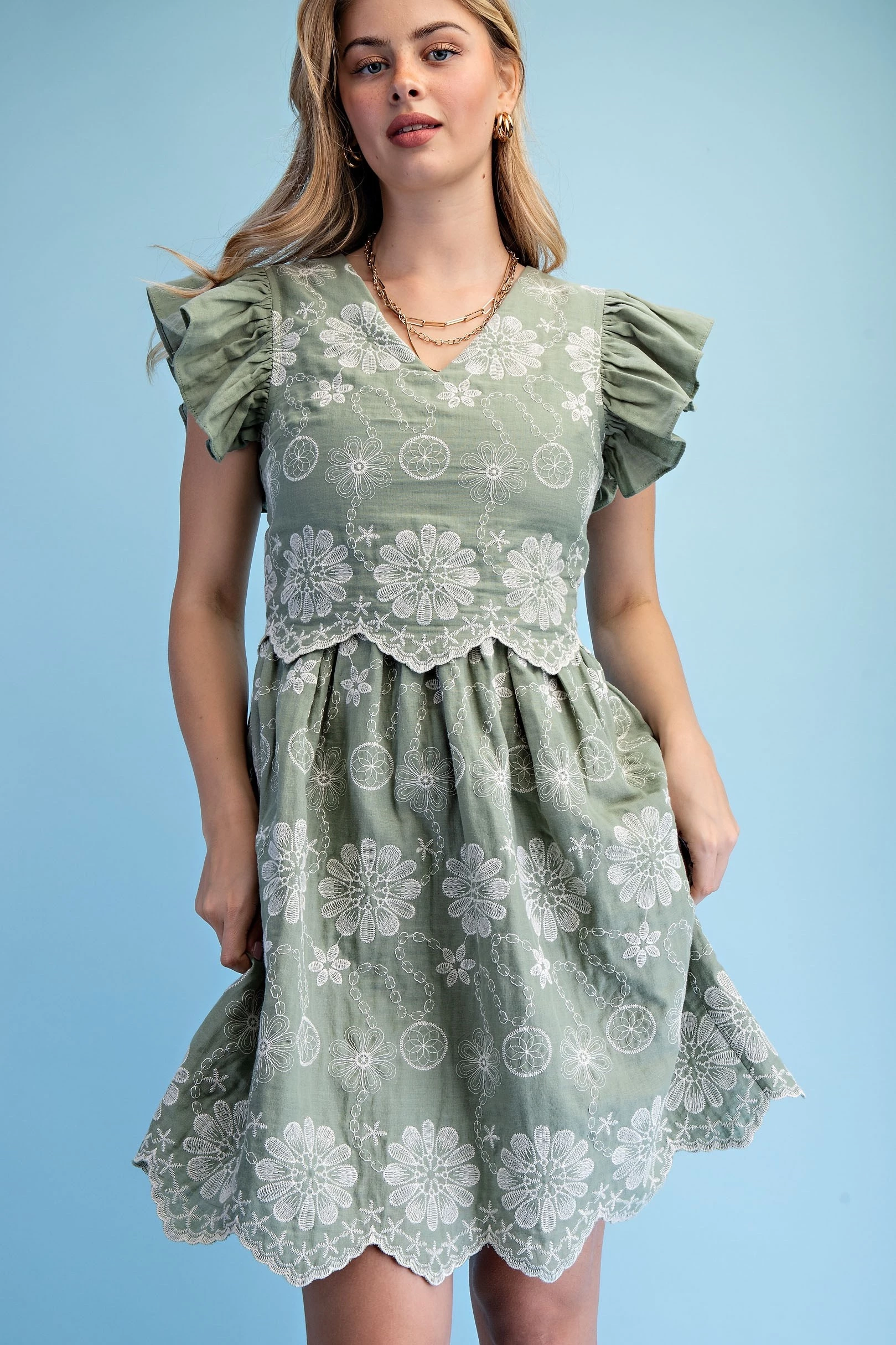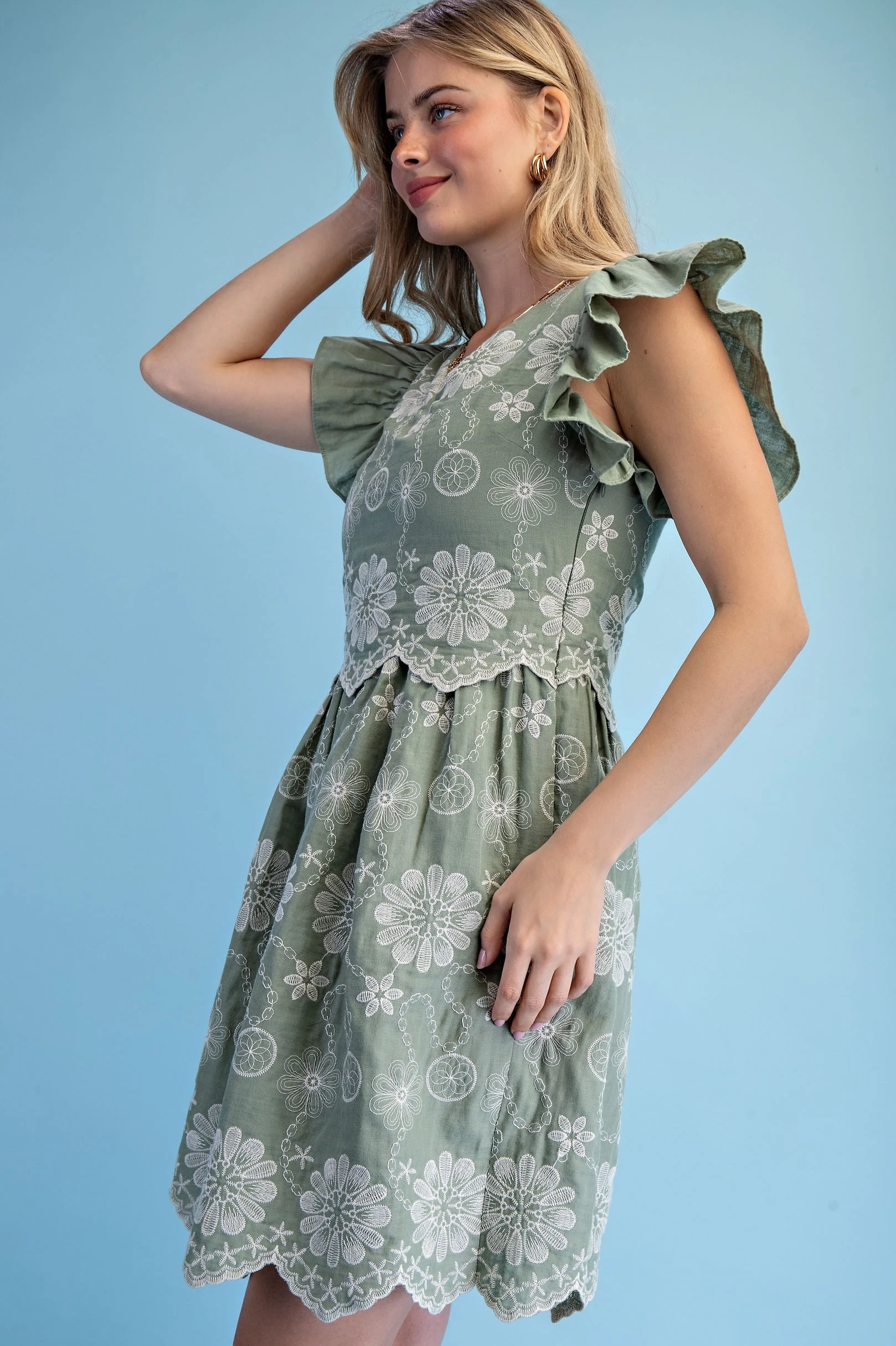 Embroidered V-Neck Dress with Ruffle Sleeves. The Dress is Lined
