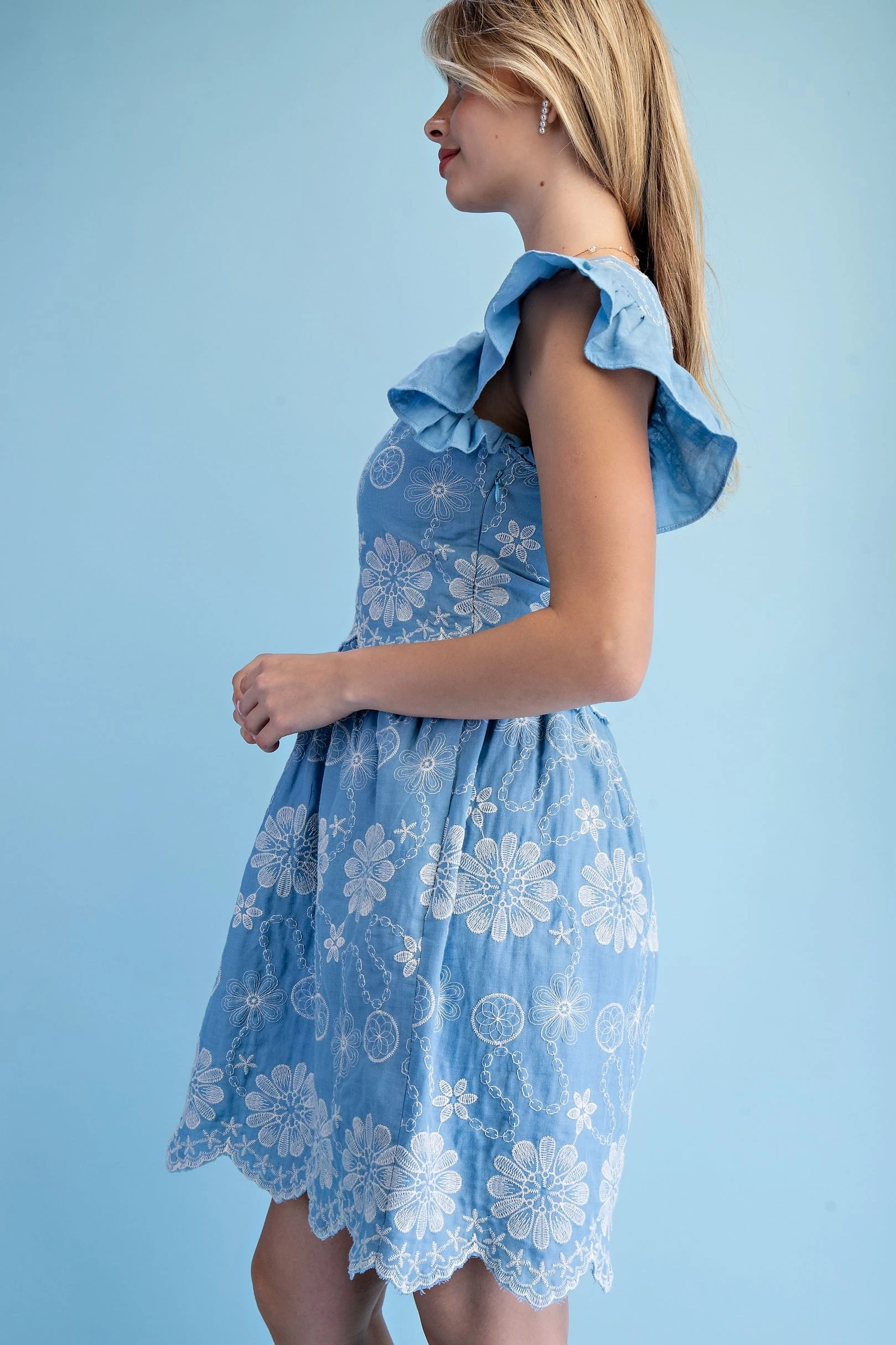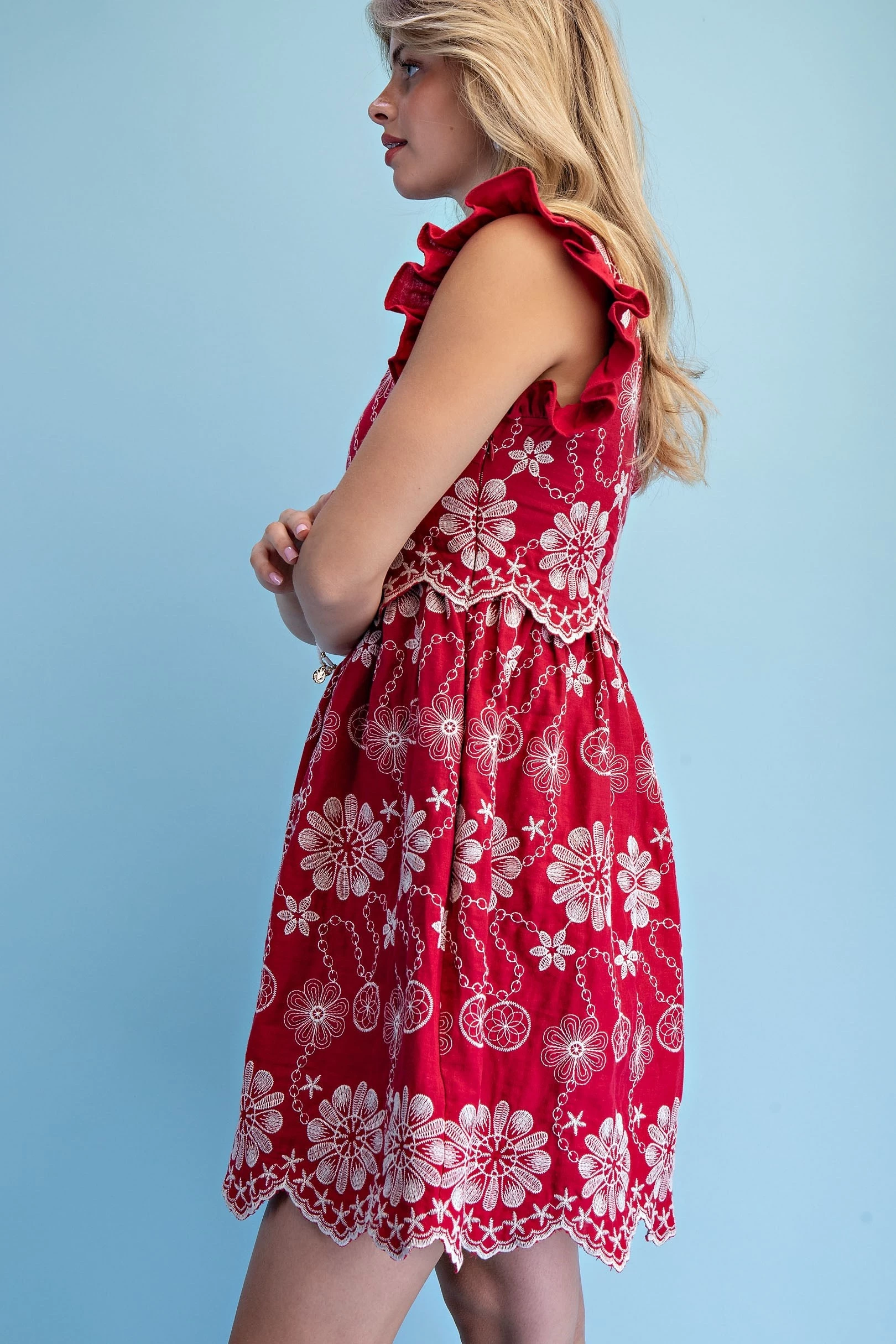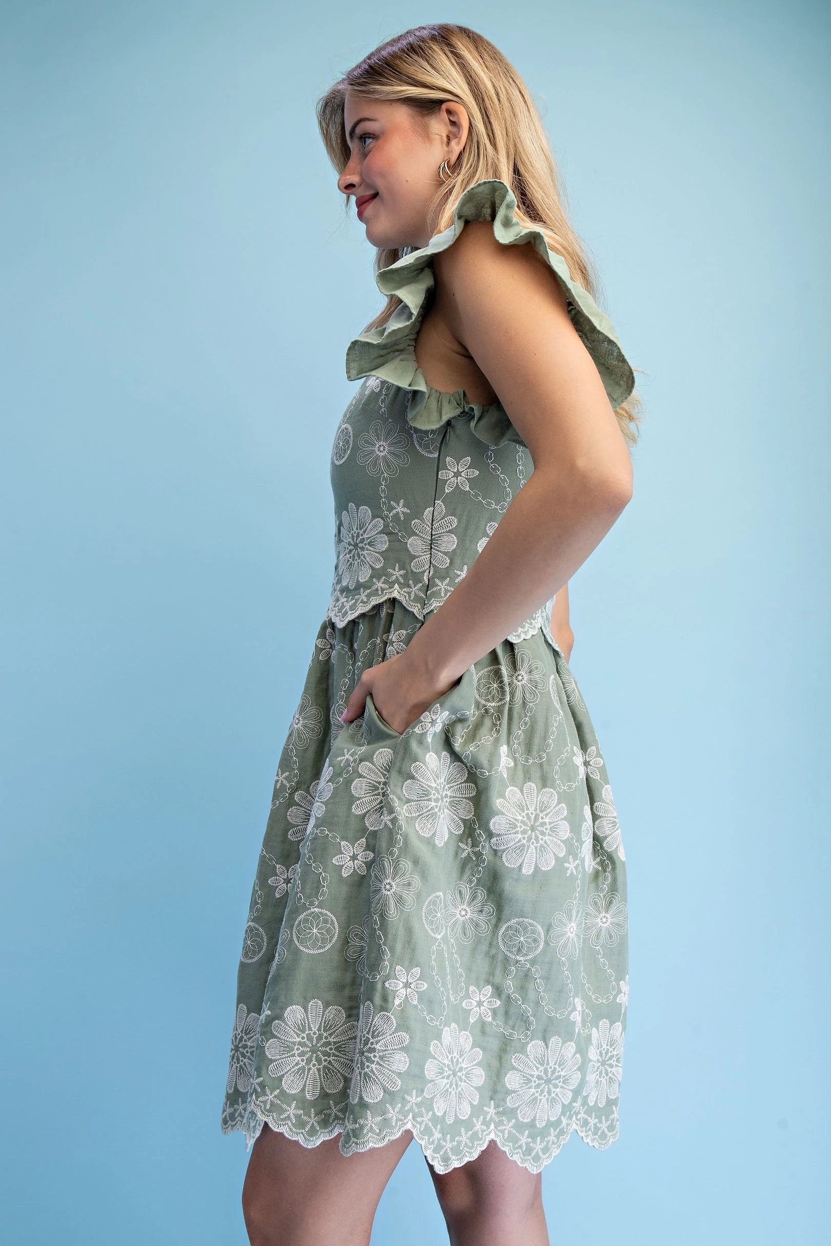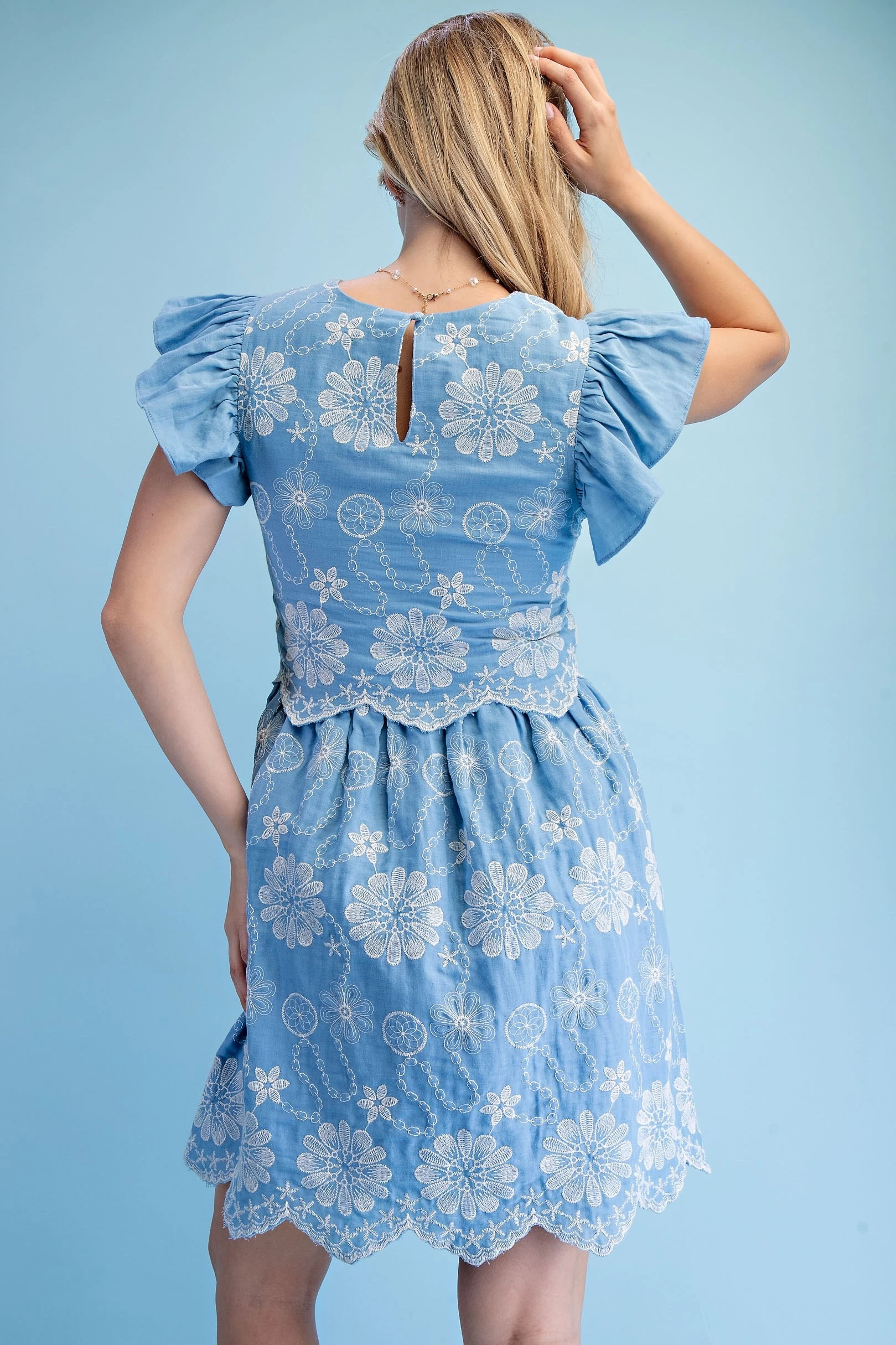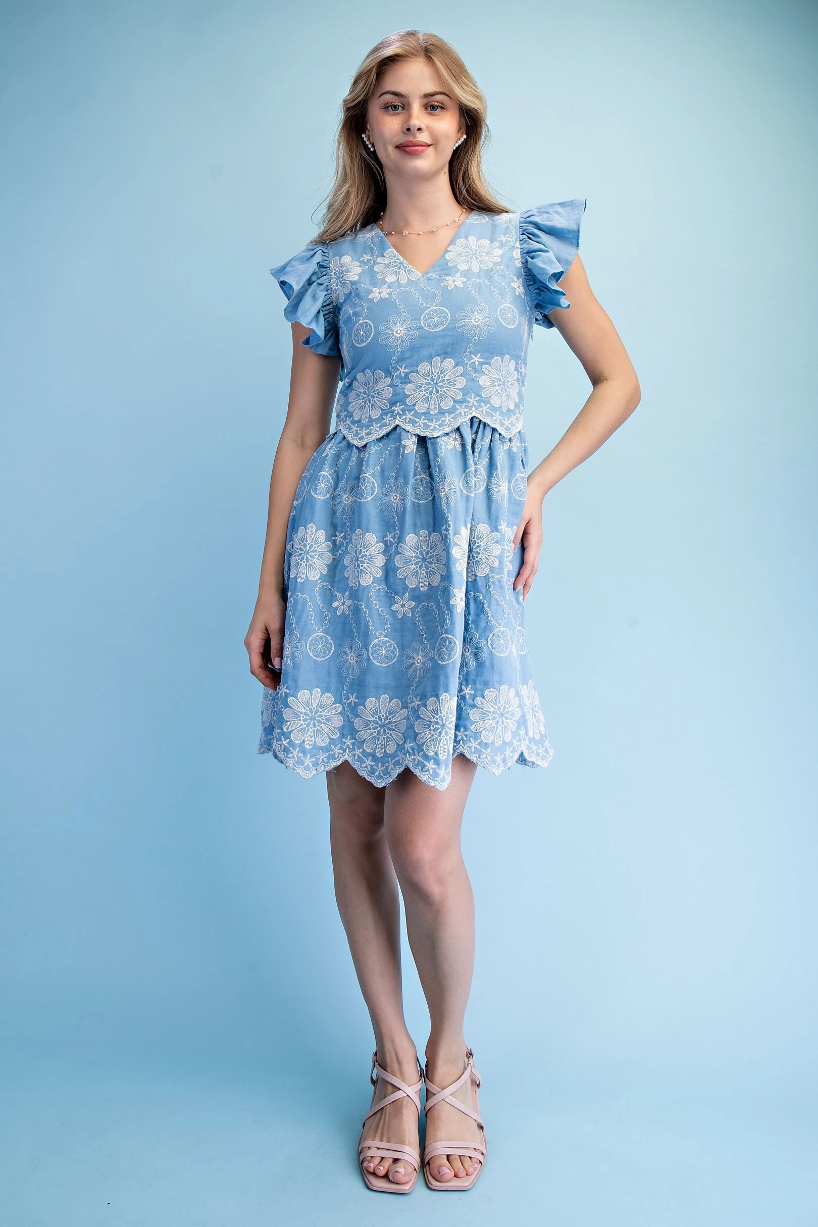 Embroidered V-Neck Dress with Ruffle Sleeves. The Dress is Lined