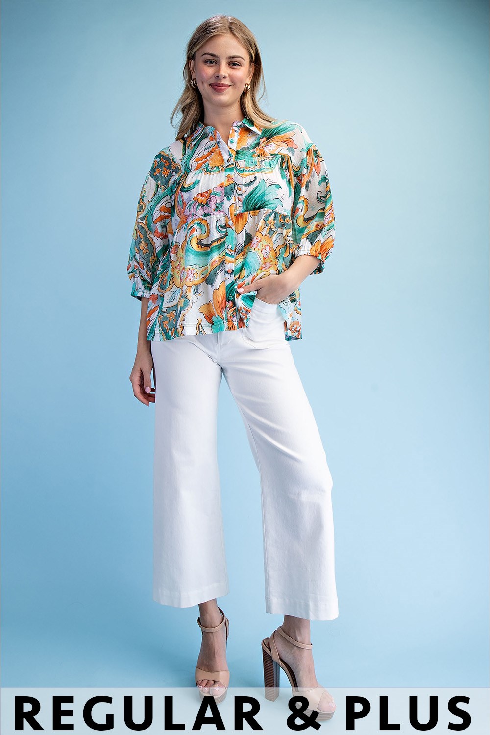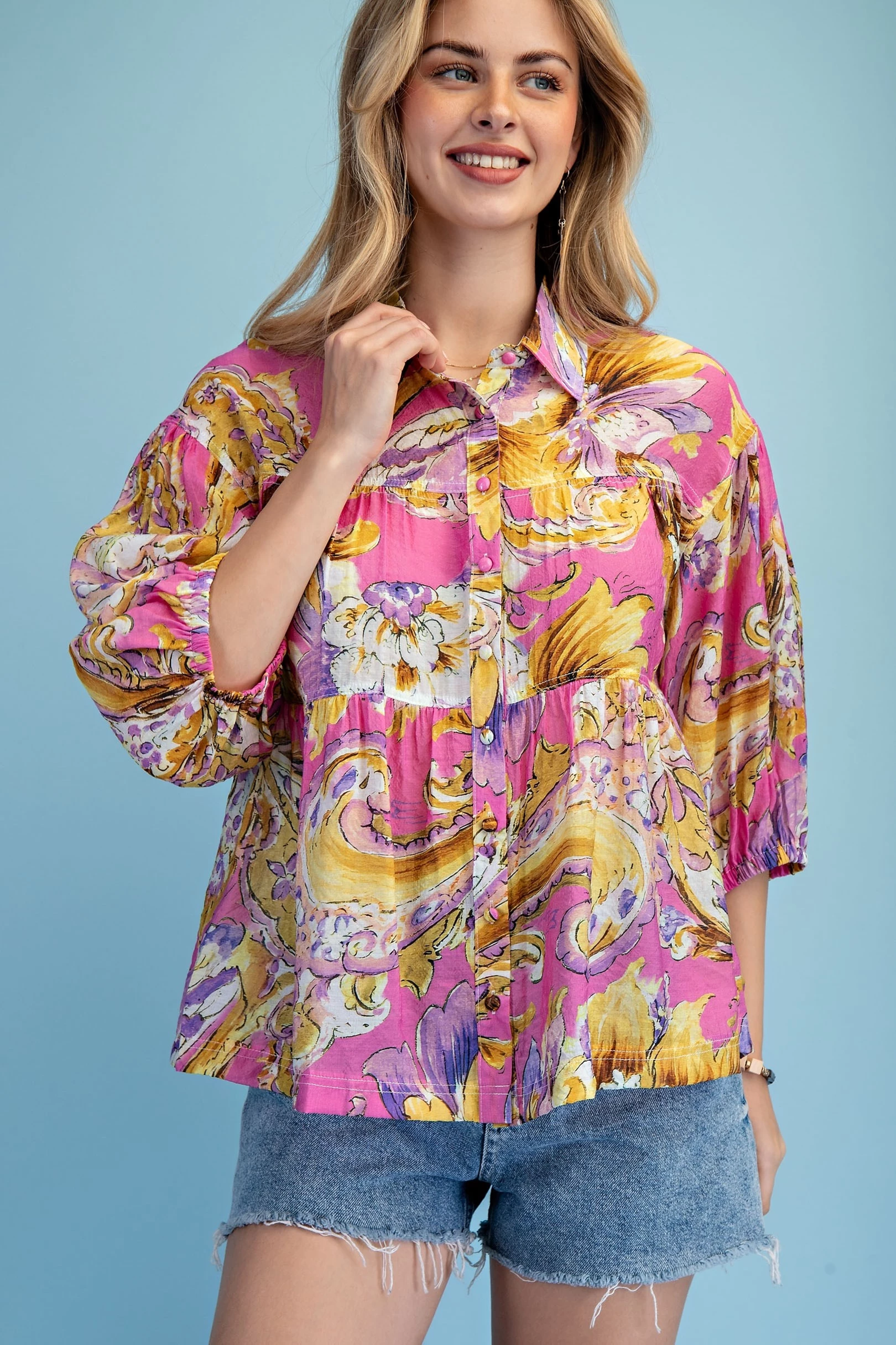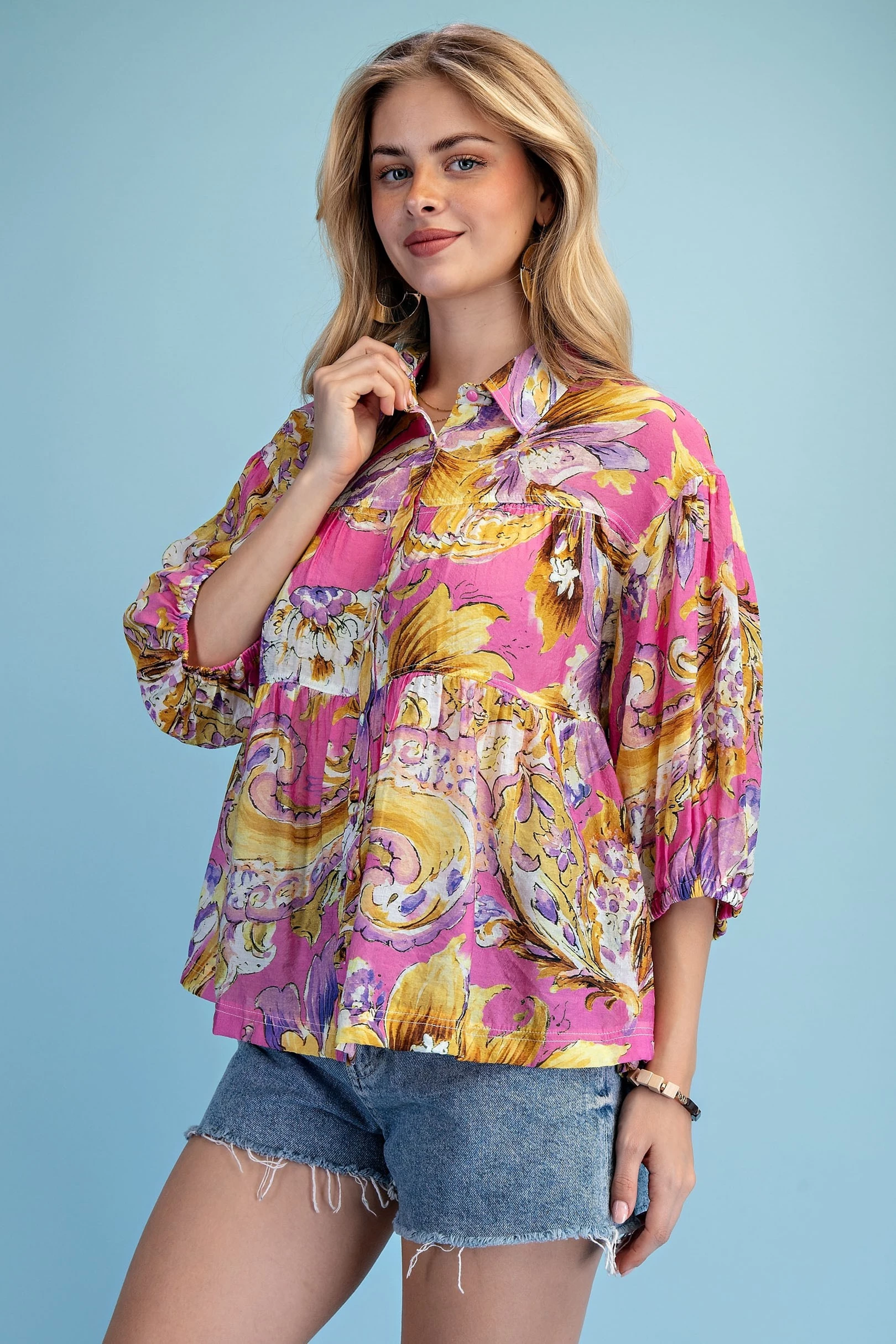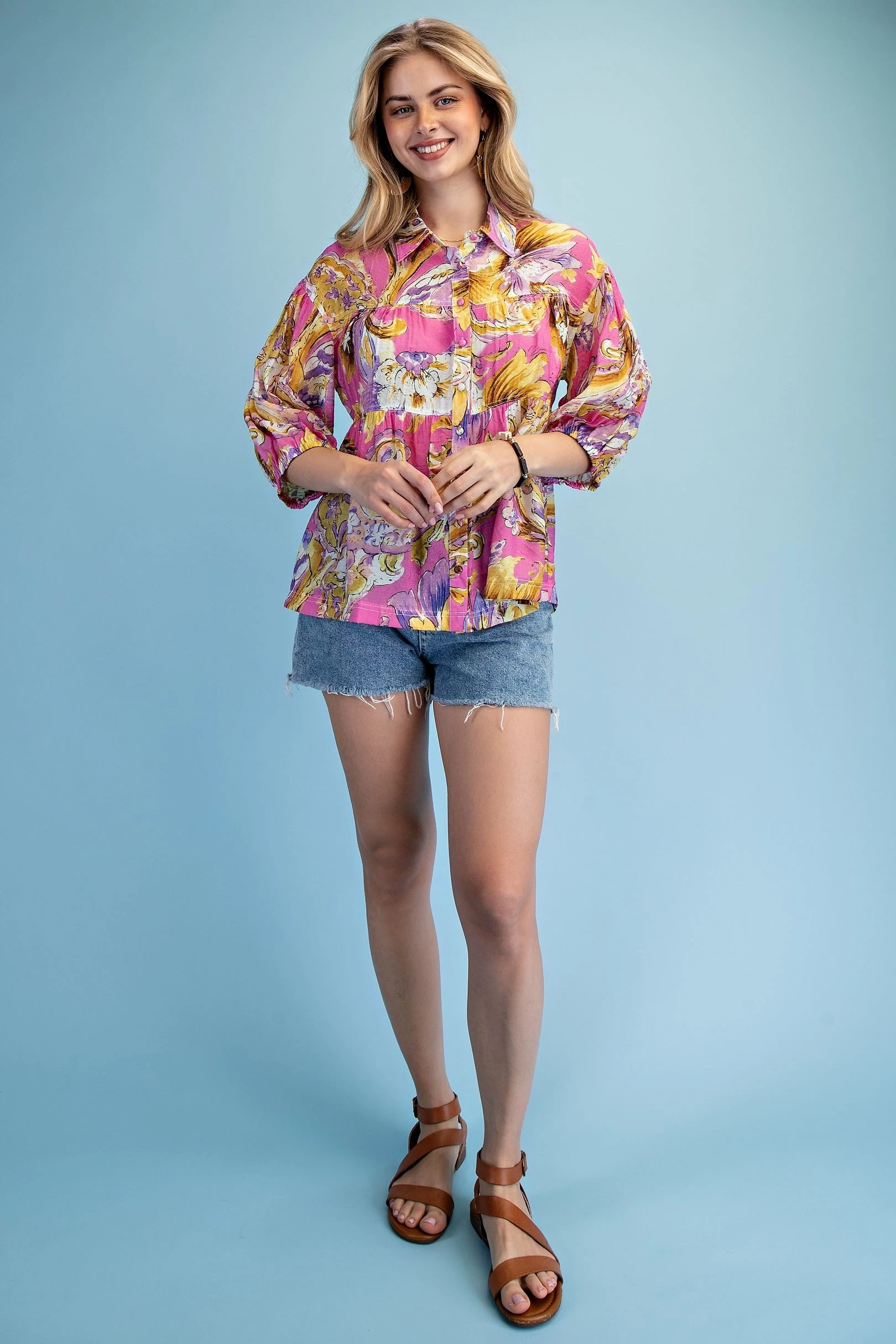 Printed Button Down Top with 3/4 Length Gathered Balloon Sleeves