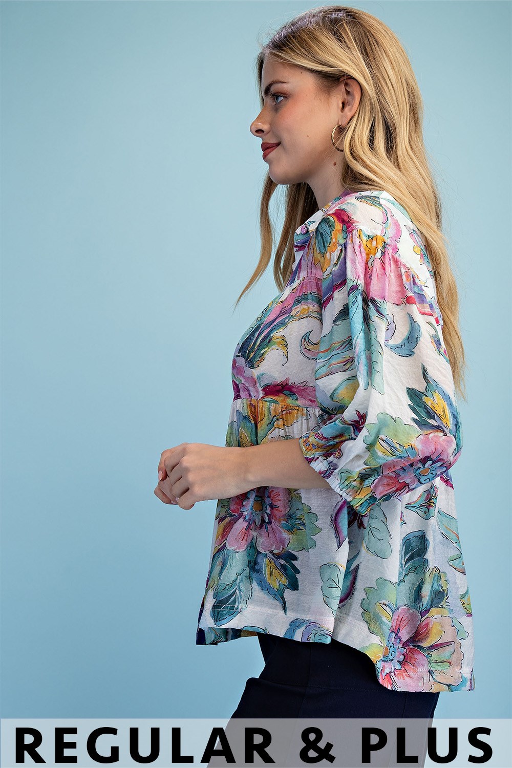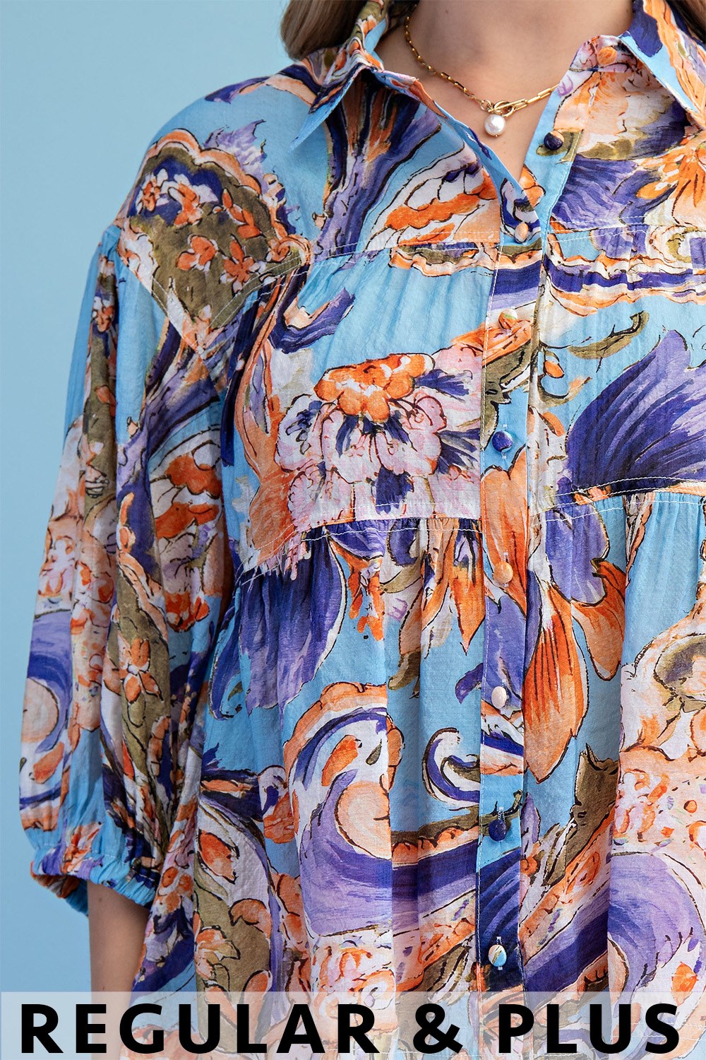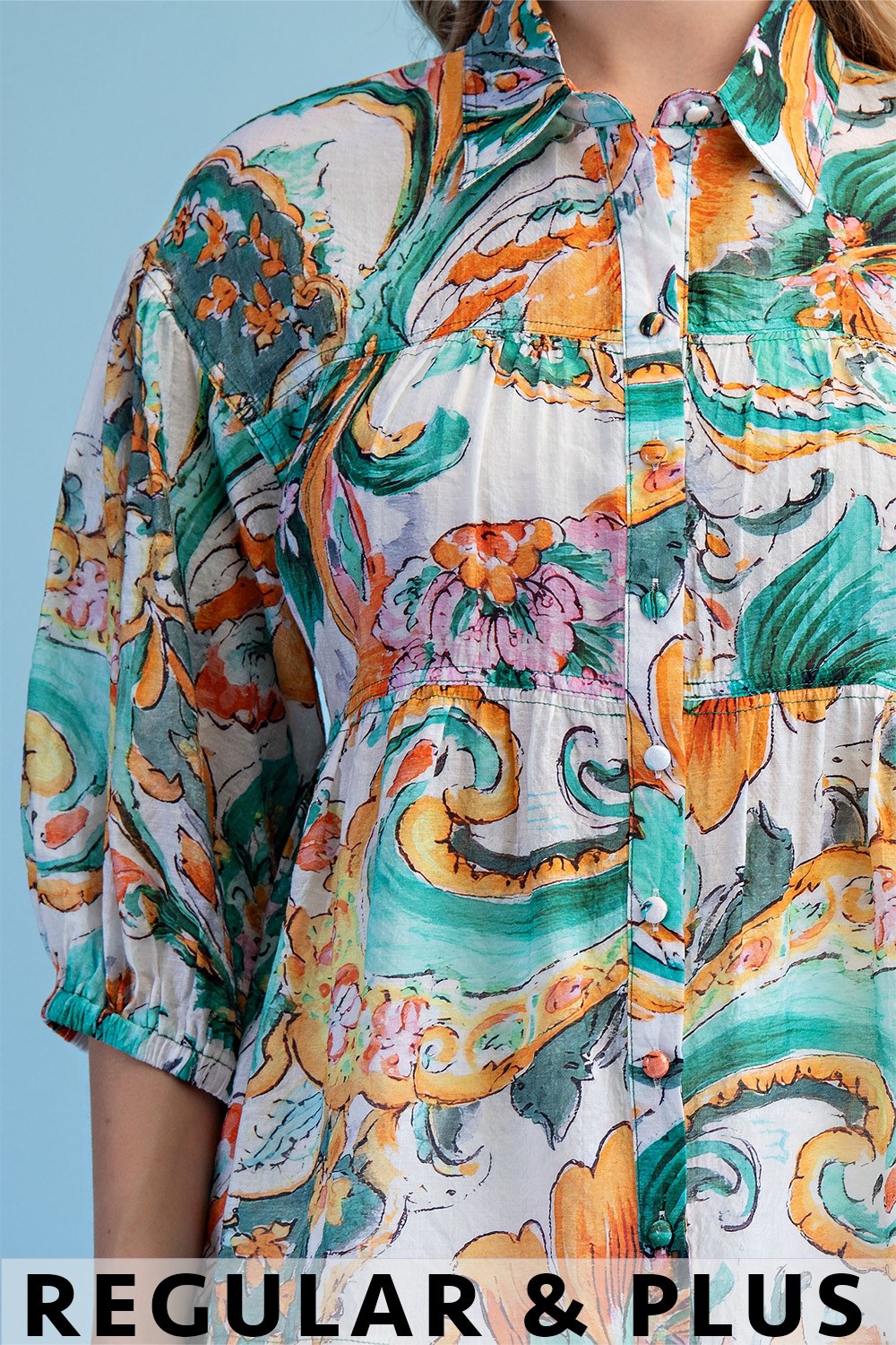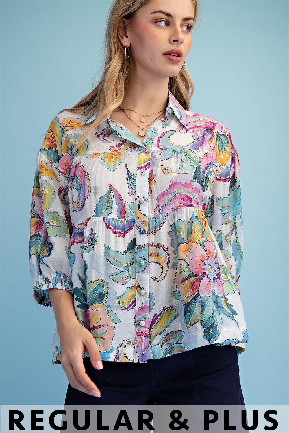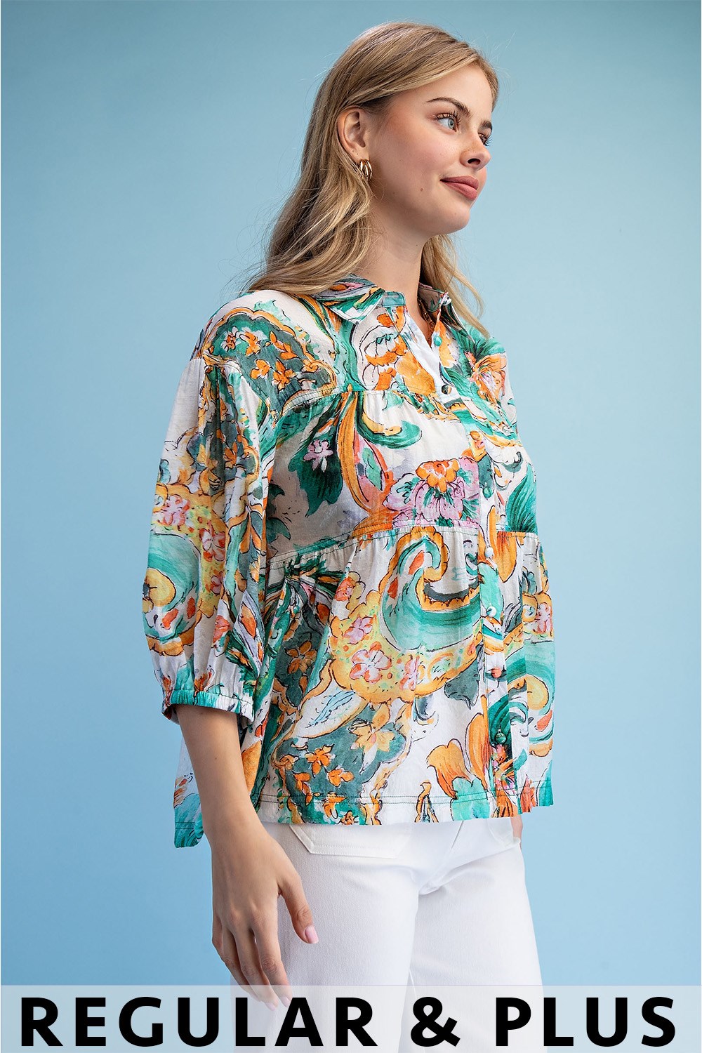 Printed Button Down Top with 3/4 Length Gathered Balloon Sleeves