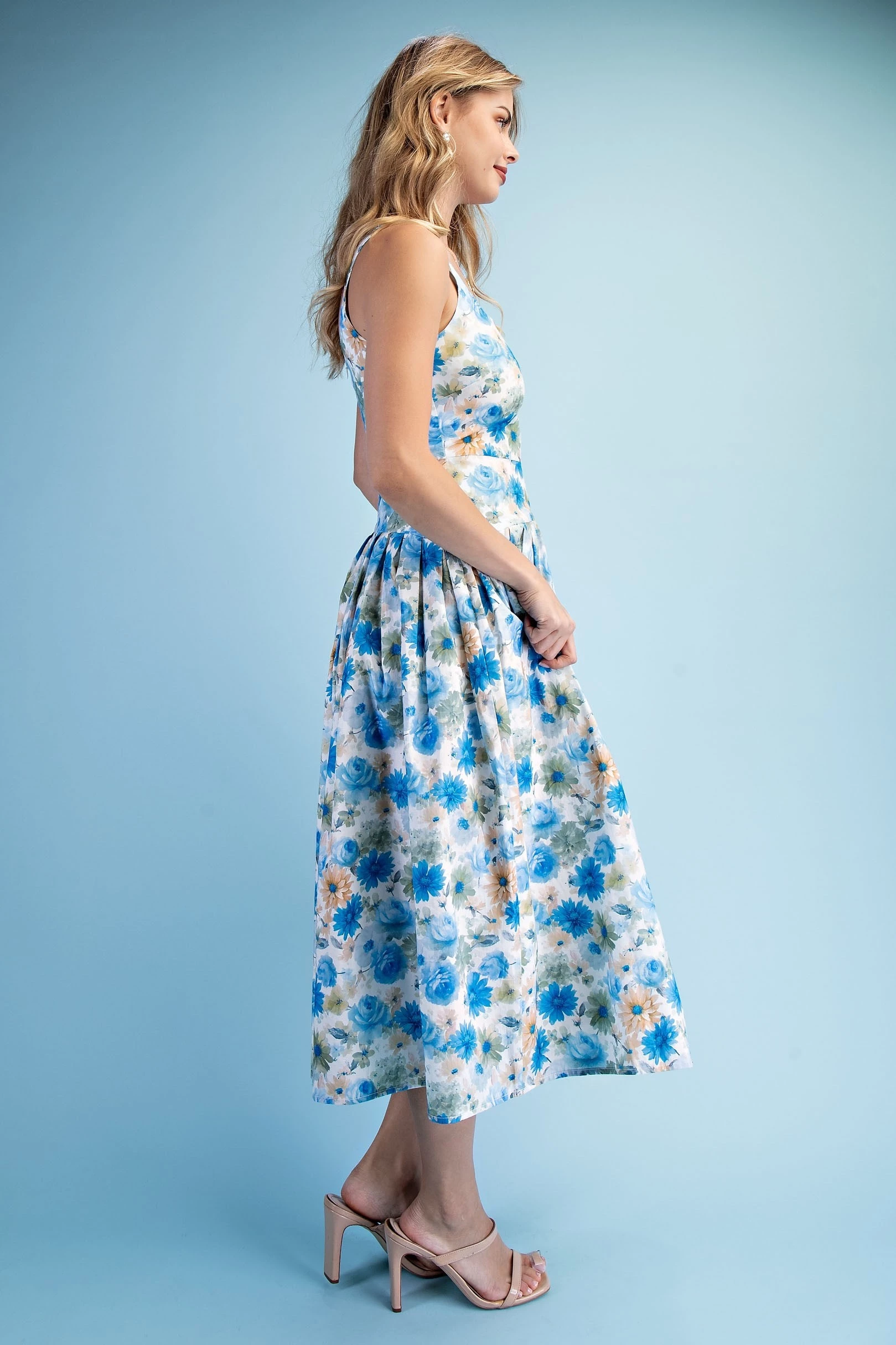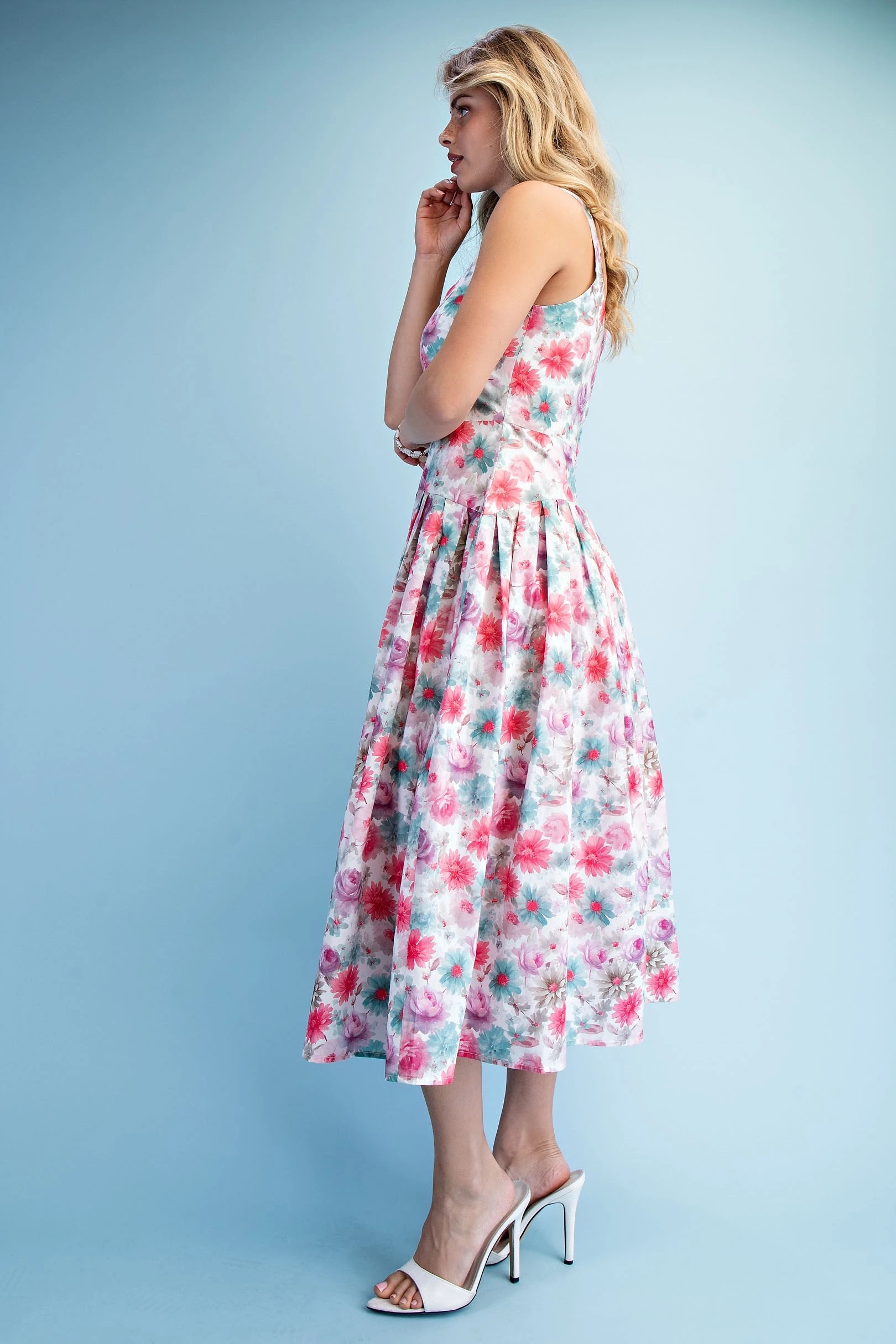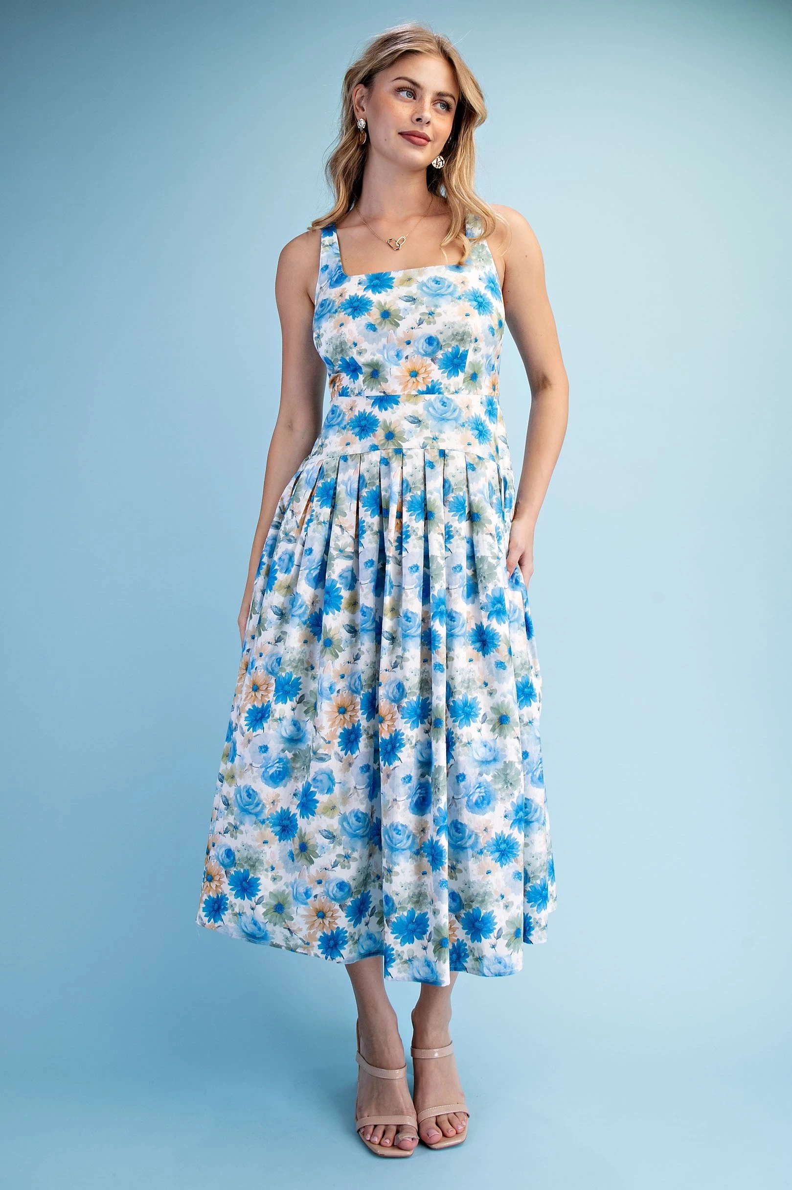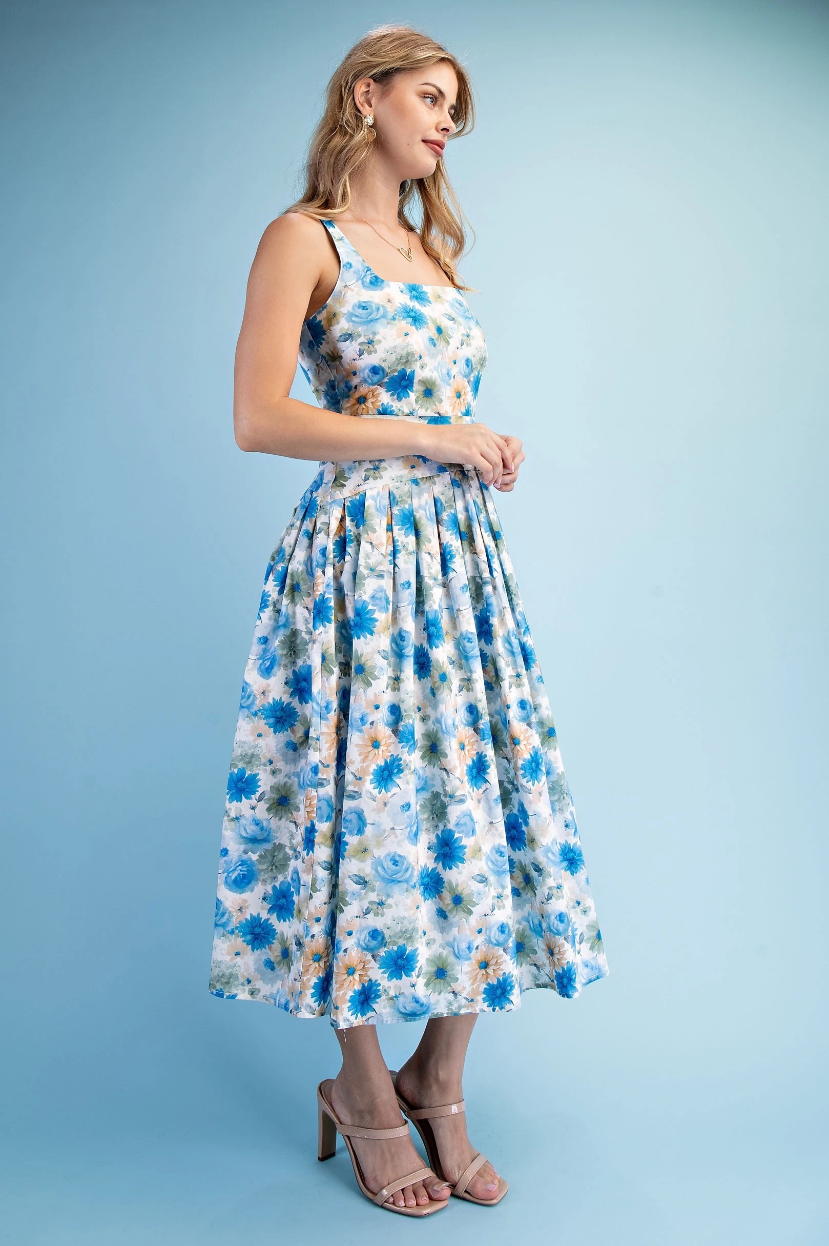 Printed Sleeveless Fit and Flare Midi Dress with a Scoop Back and Invisible Zipper Closure. The Dress is Lined