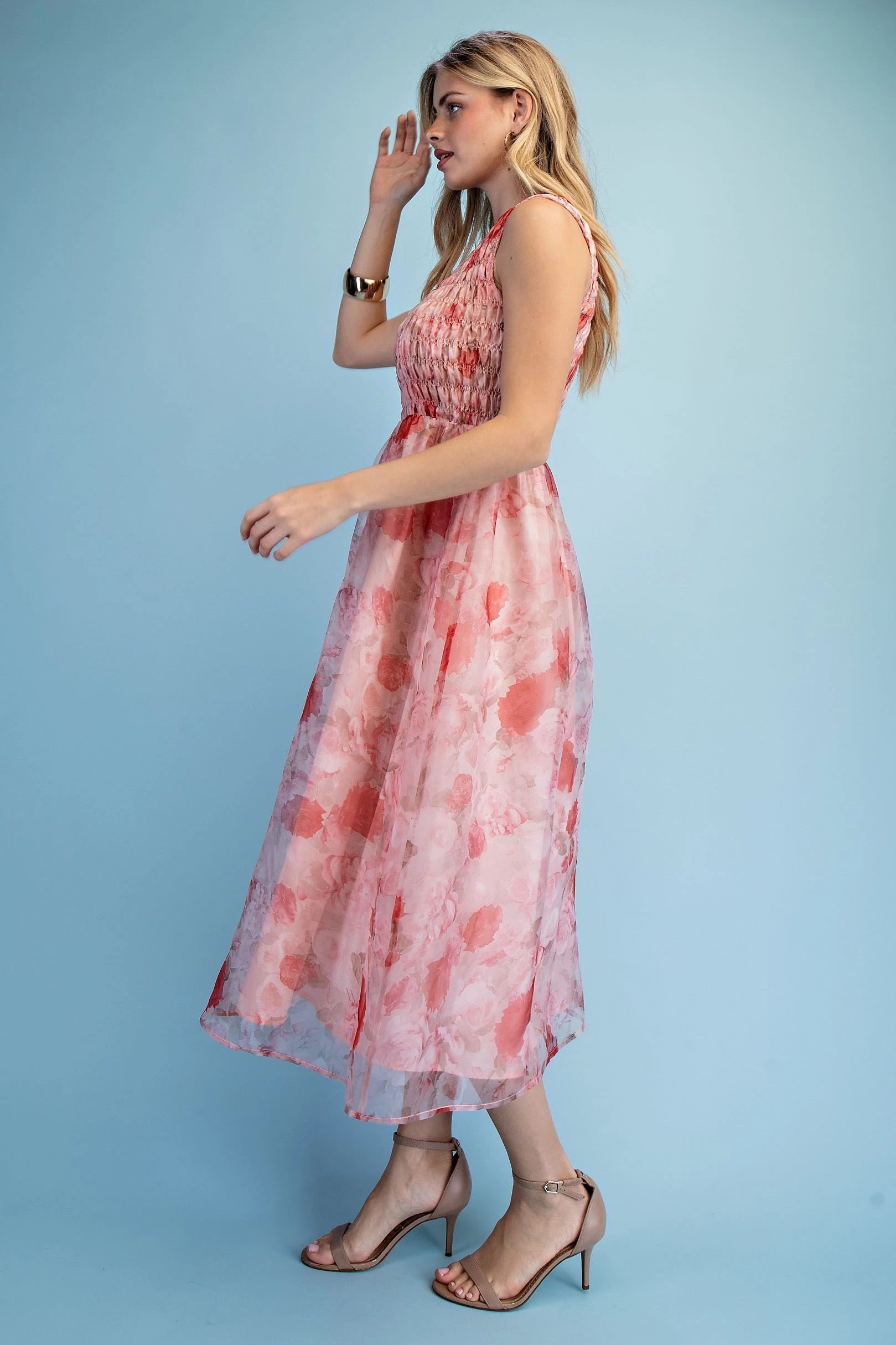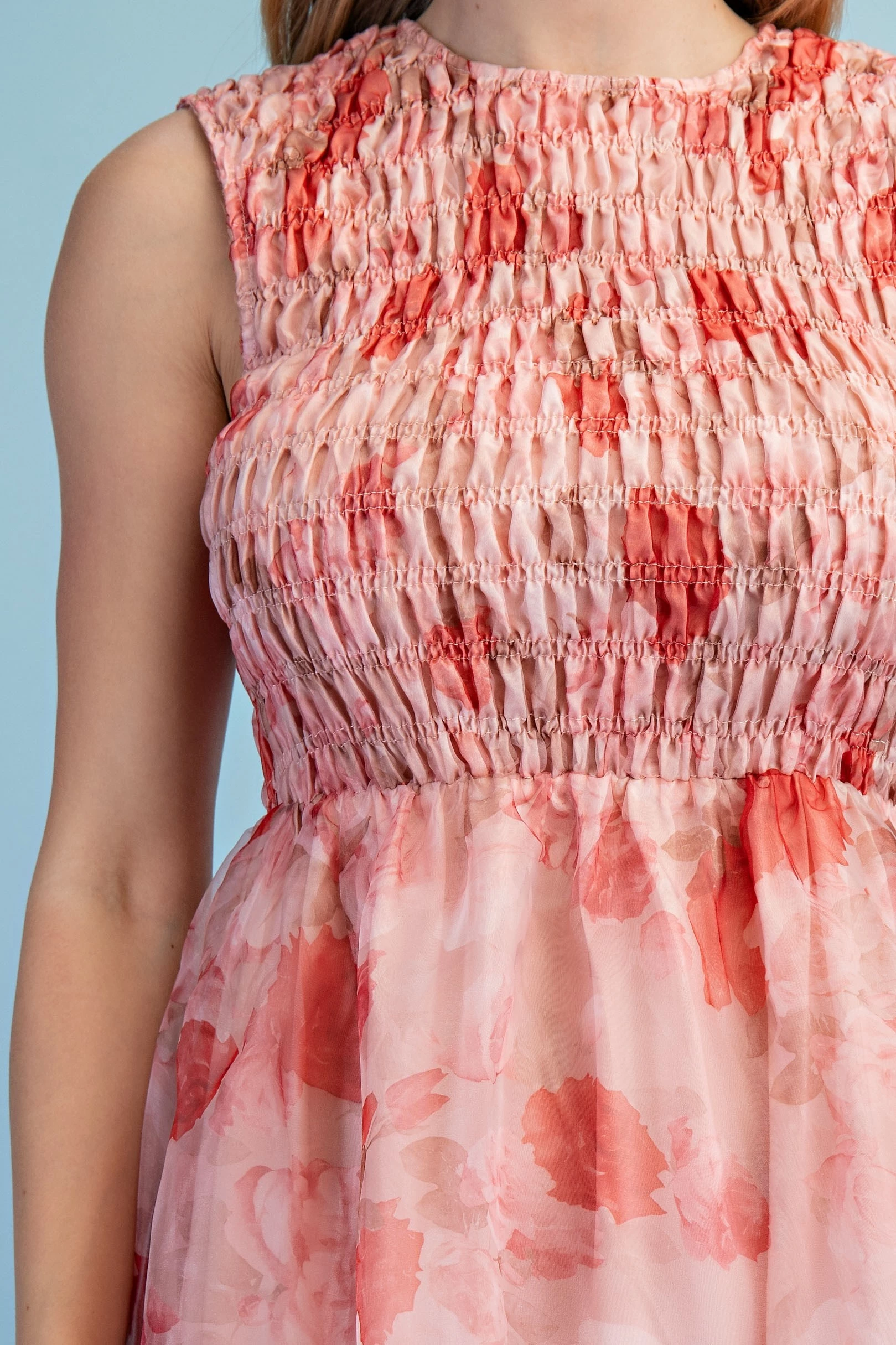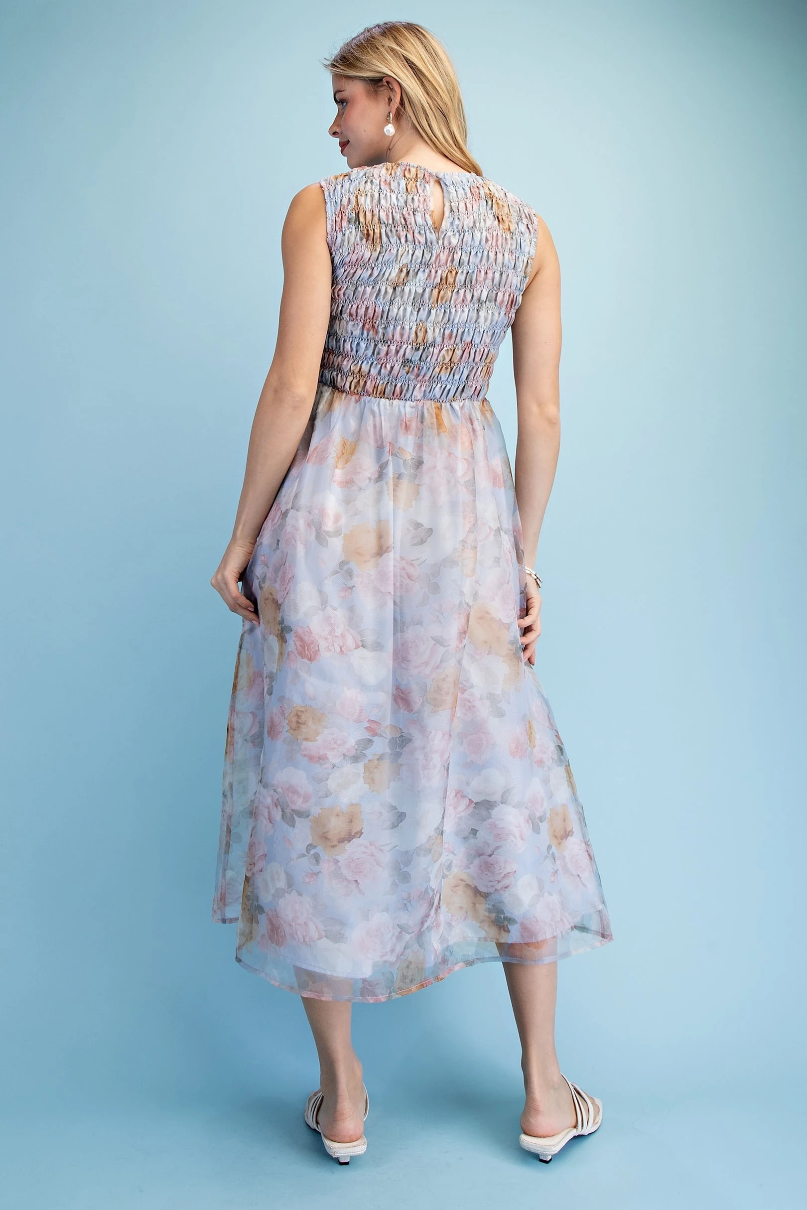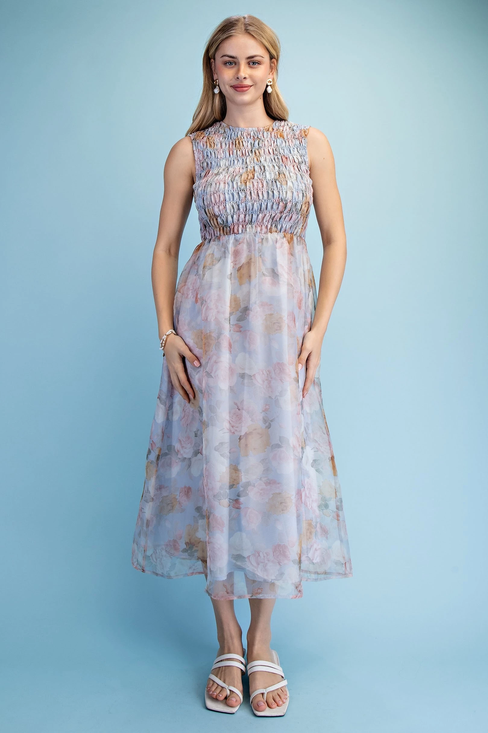 Floral Sleeveless Midi Dress with a Smocked Bodice and Overlay Style Skirt