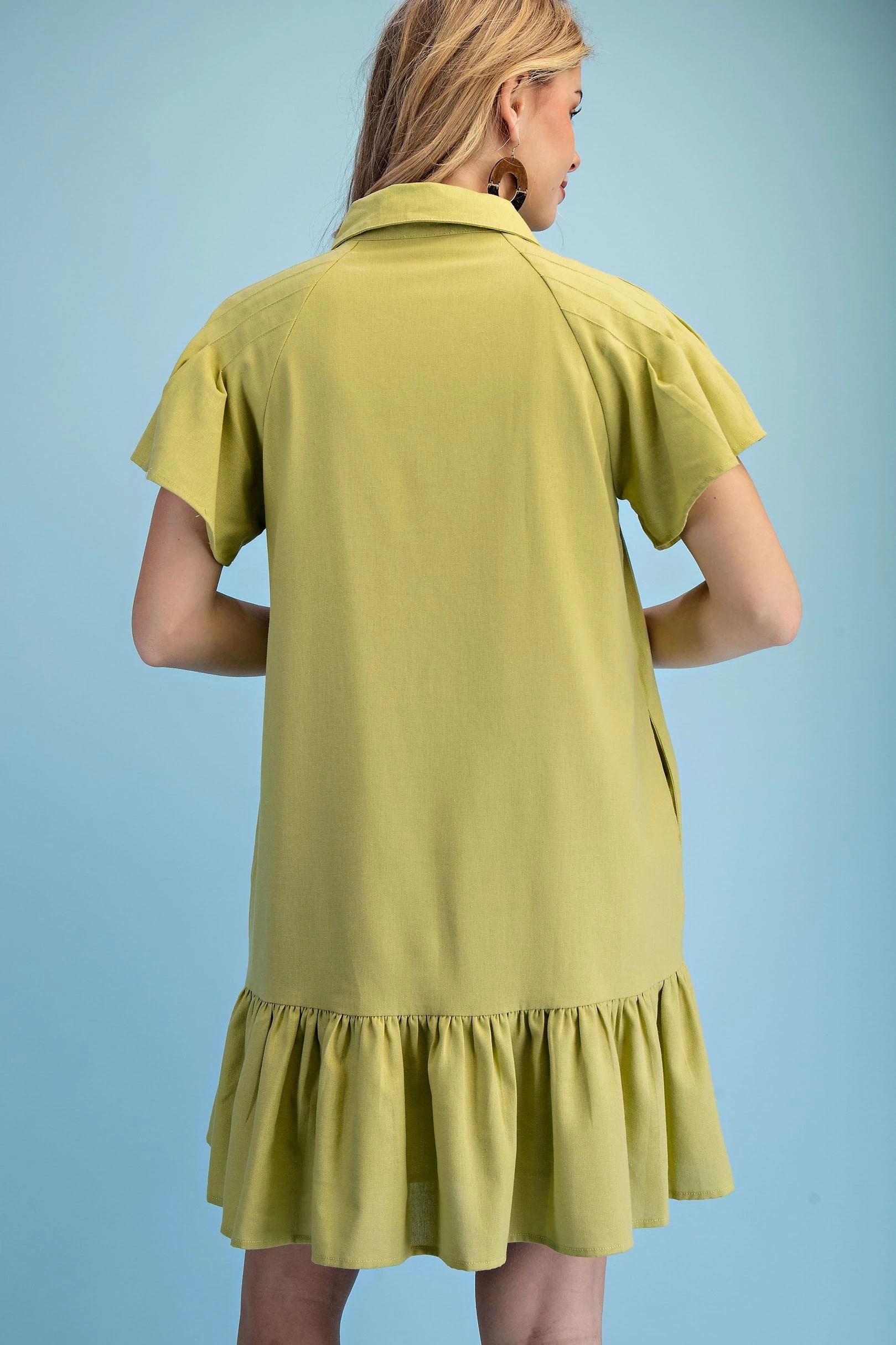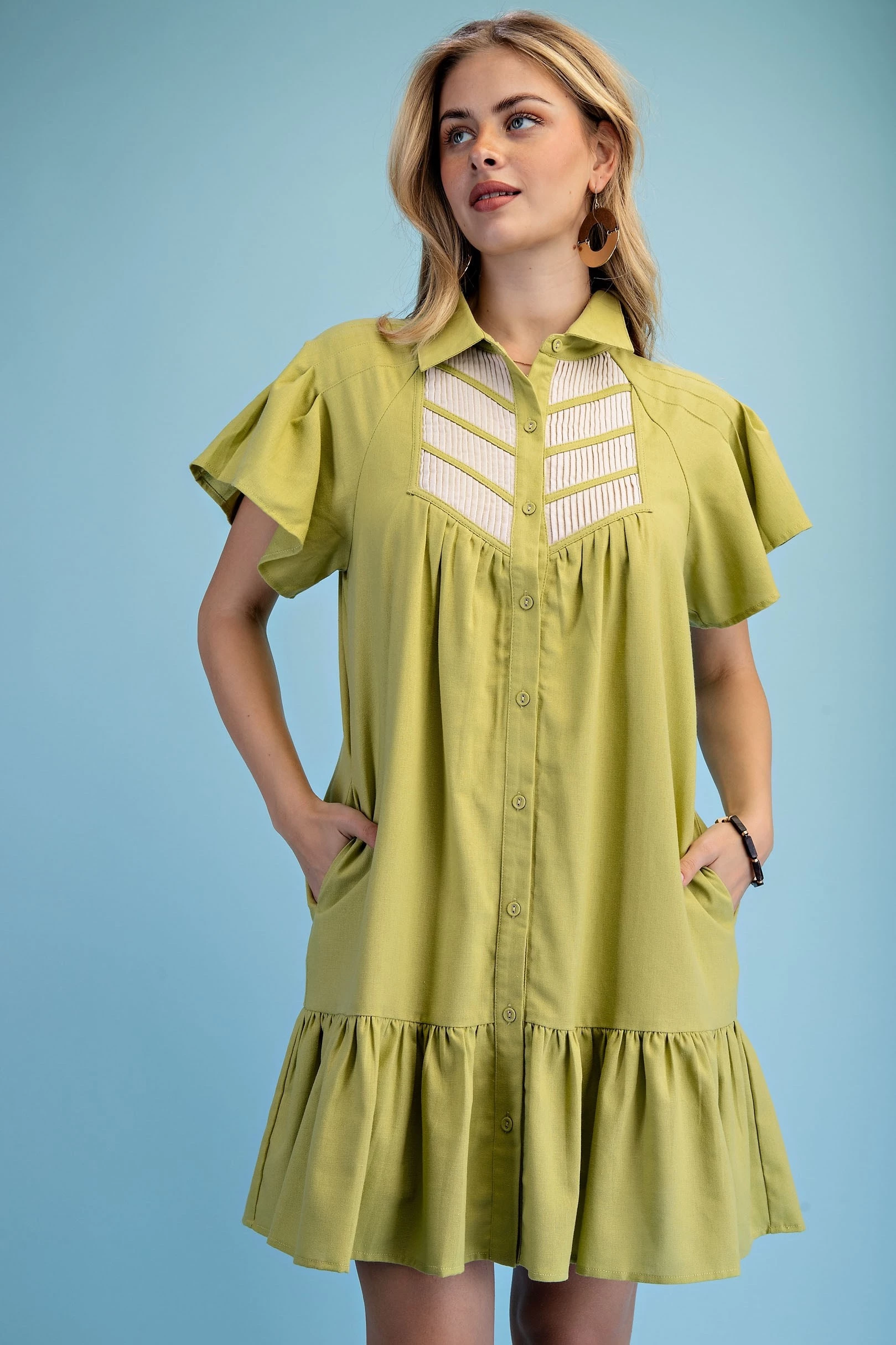 Linen Short Pin-Tucked Sleeve Shirt Dress with a Pleated Front Yoke Detail. The Dress is Lined