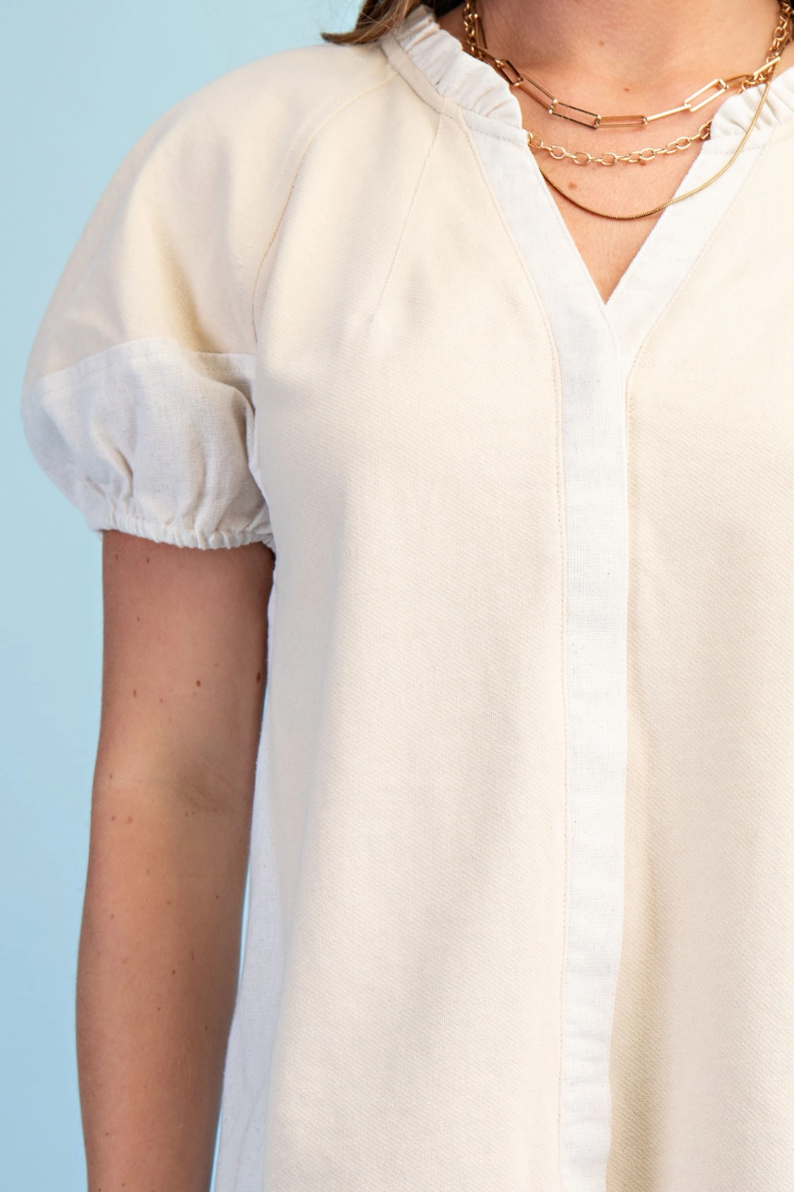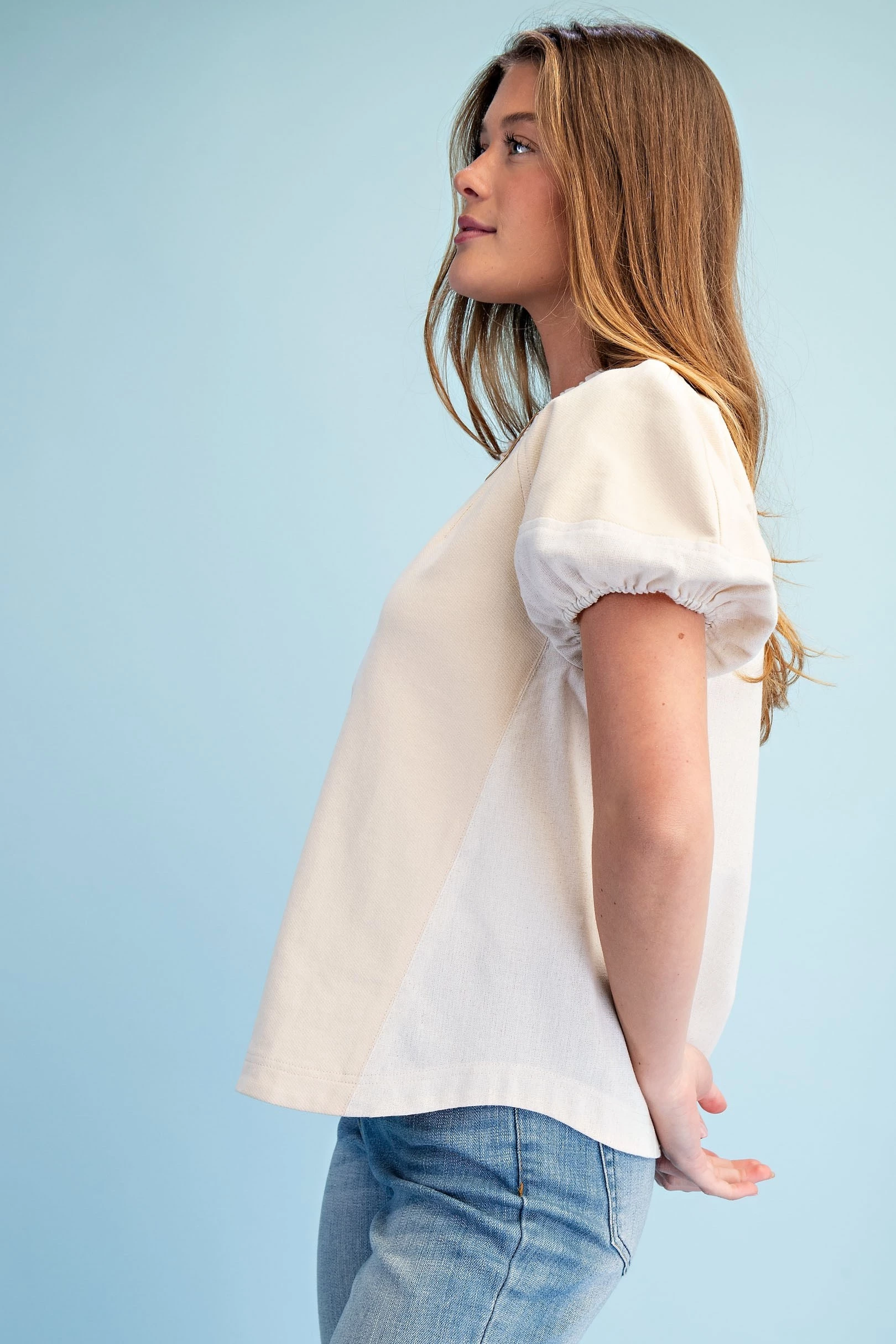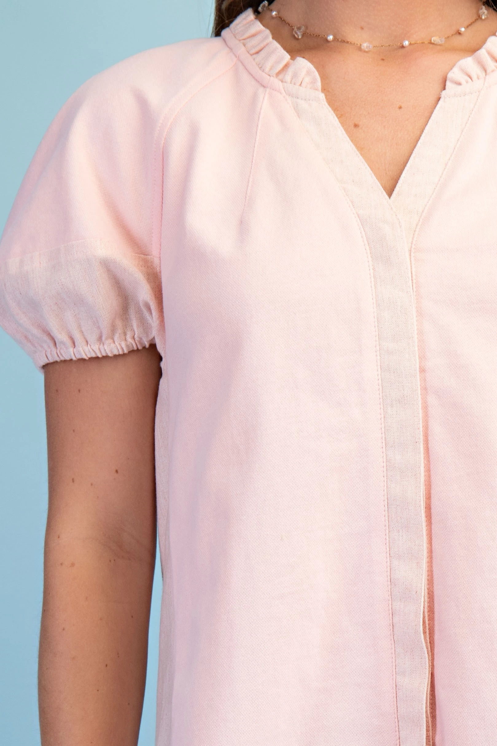 Mixed Material Covered Placket Button Down Blouse with Short Puff Sleeves and a Ruffled Collar