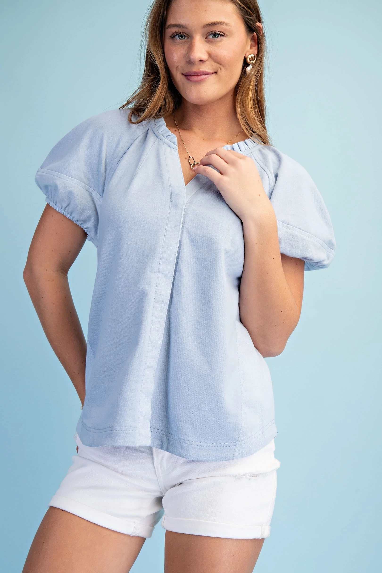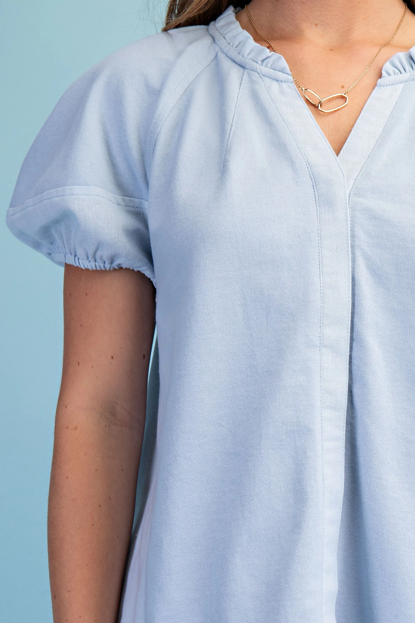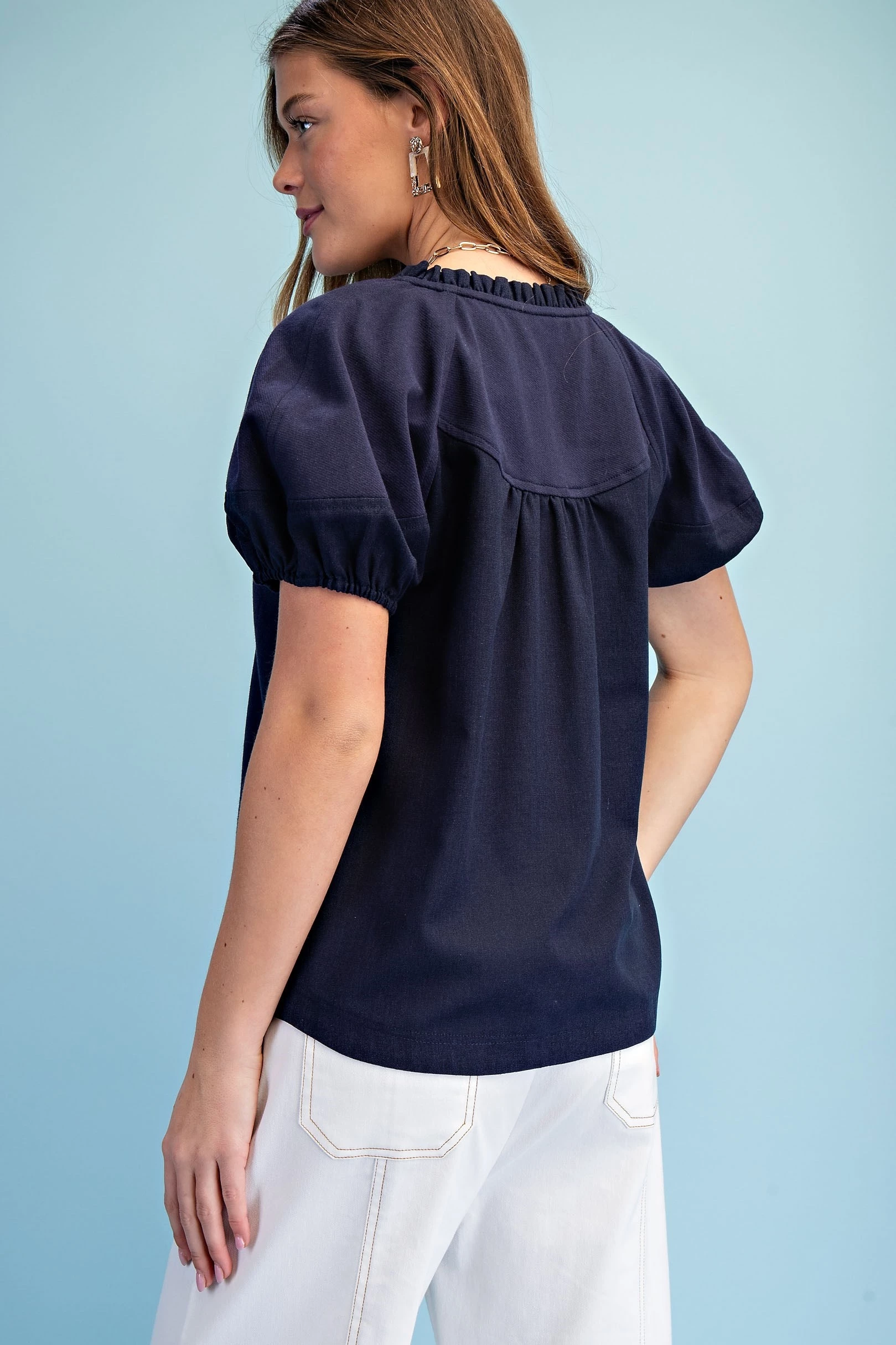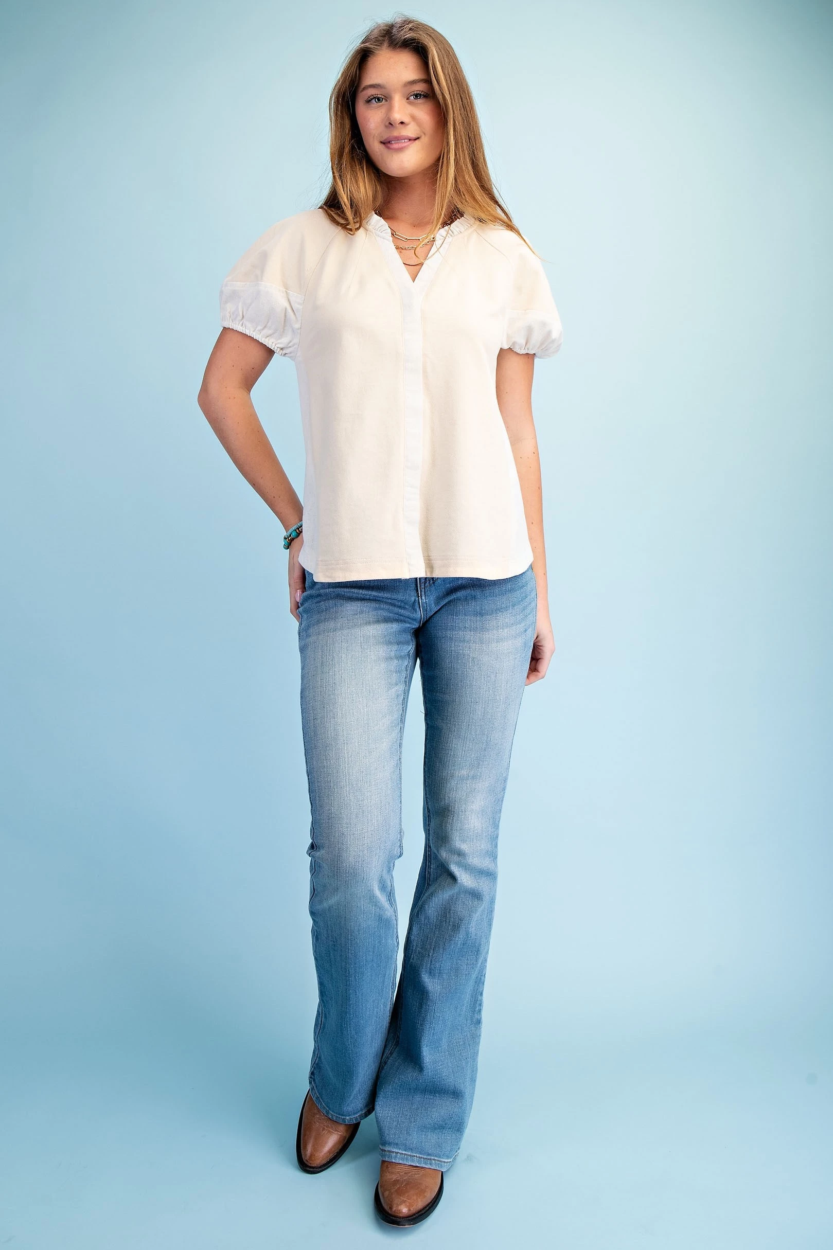Mixed Material Covered Placket Button Down Blouse with Short Puff Sleeves and a Ruffled Collar