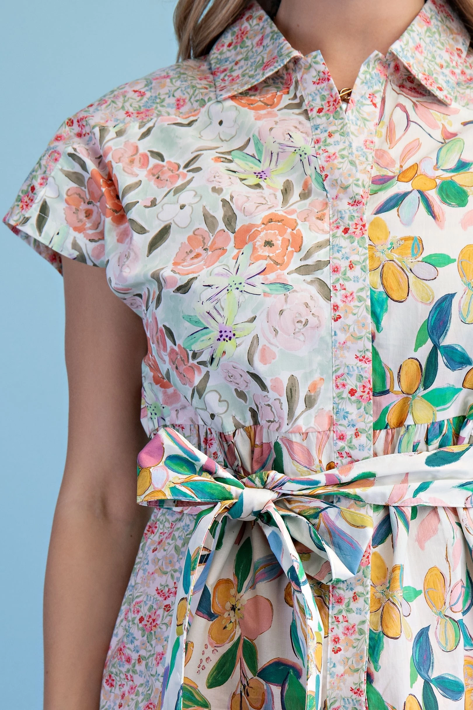 Floral Print Button Down Dress with a Covered Placket and Binding Details. The Dress is Lined