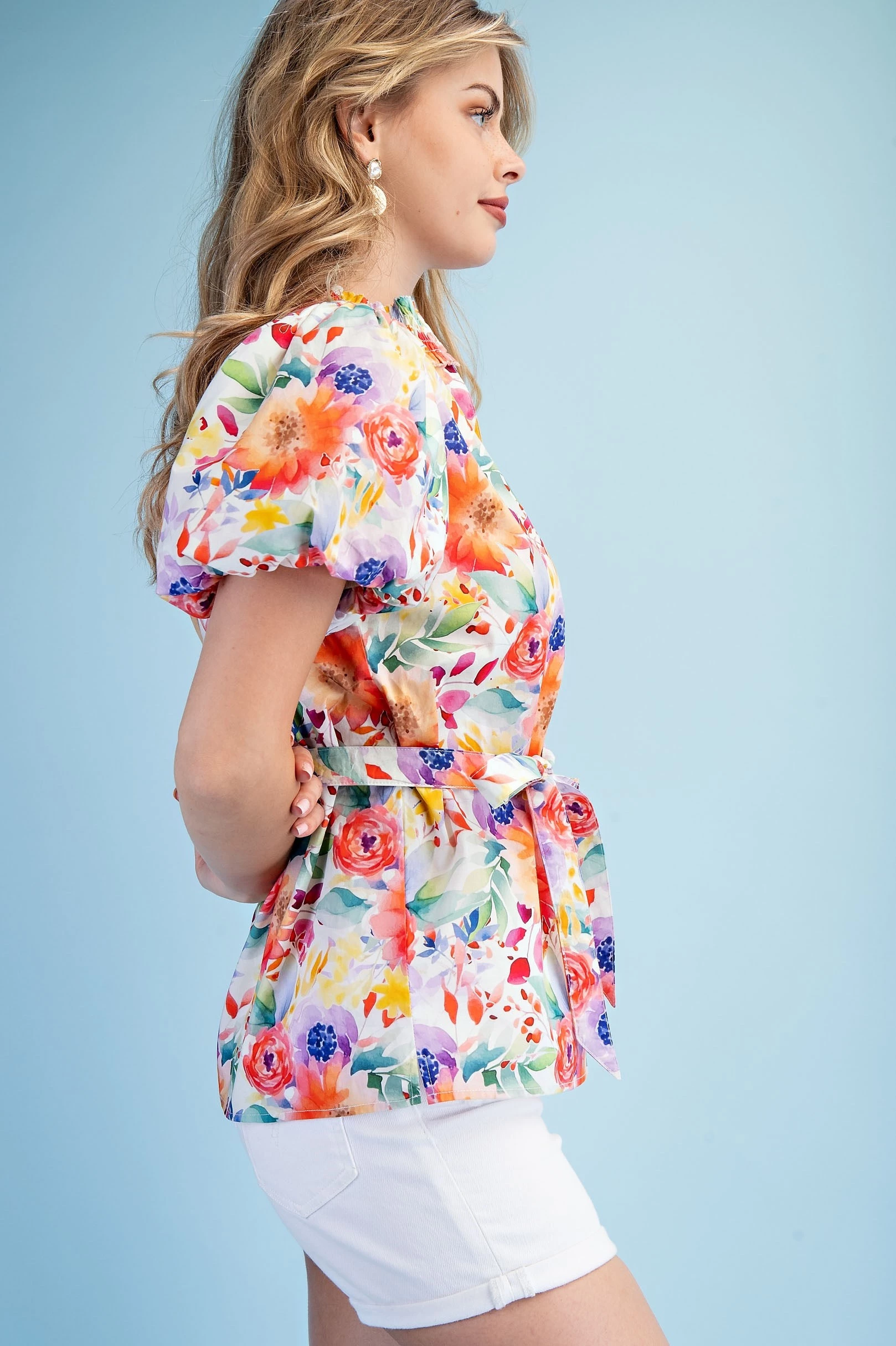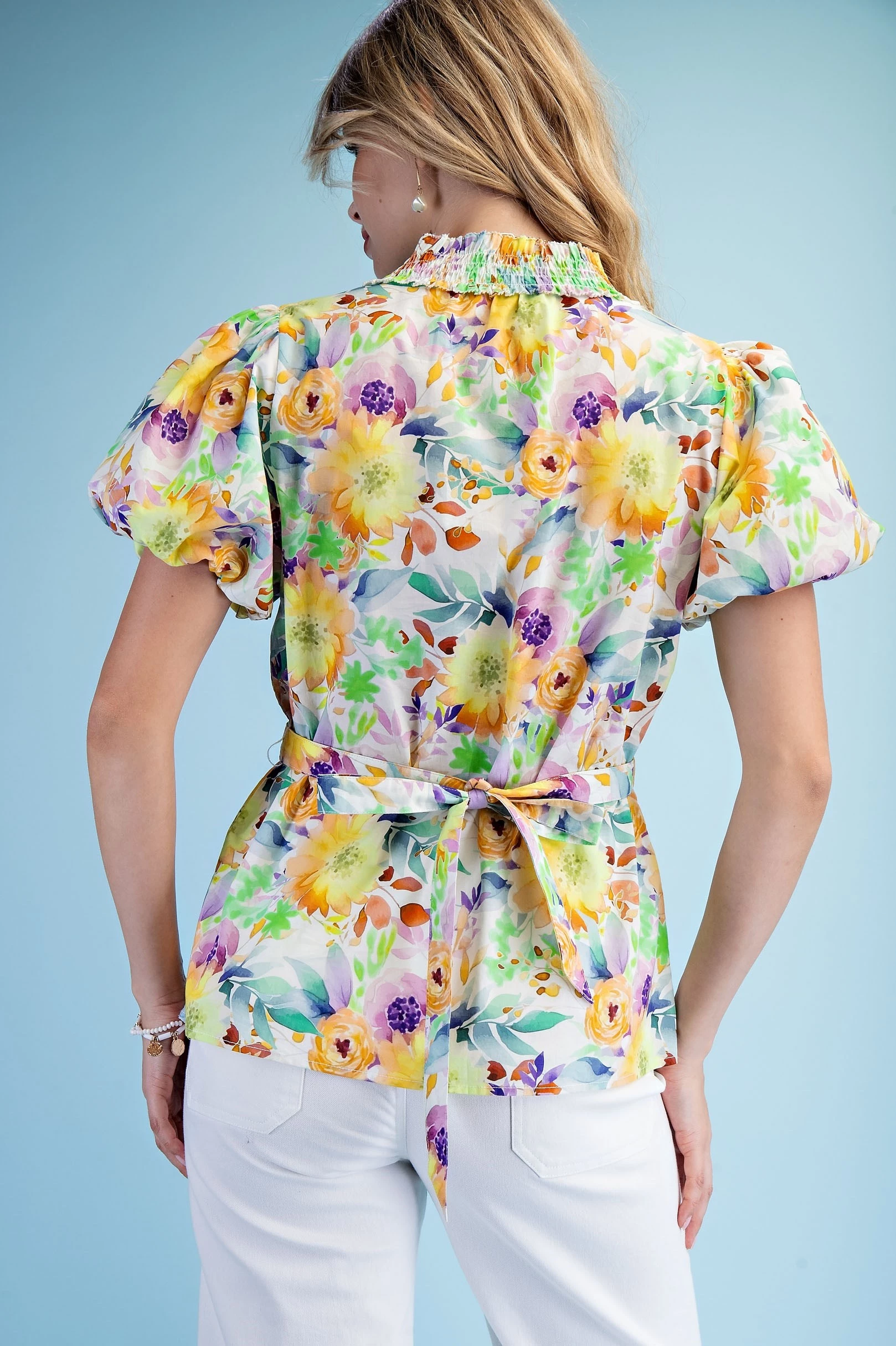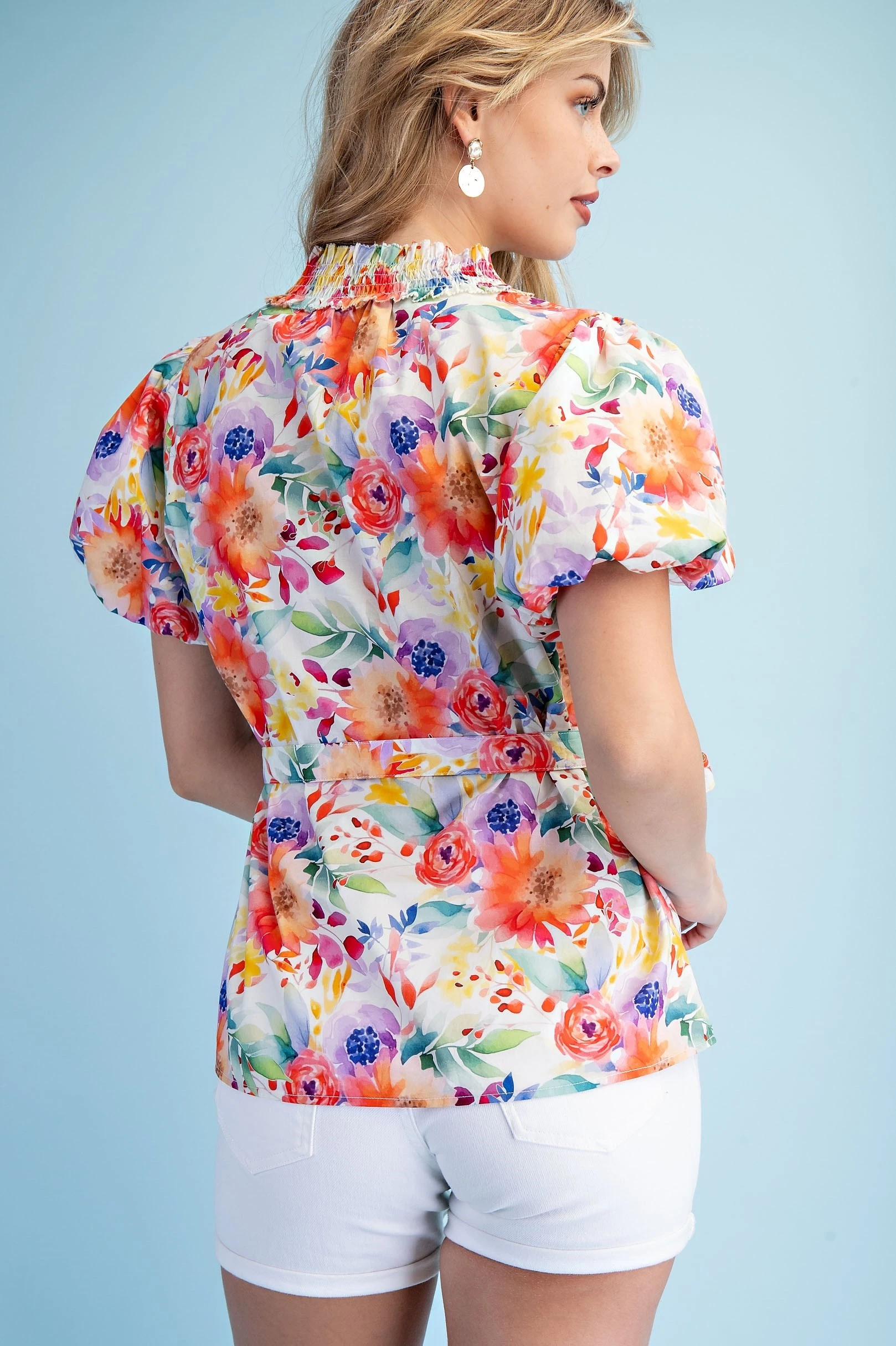 Floral Half Button Dress with a Smocked Neck and Trim Detail at Waist. The Dress is Lined