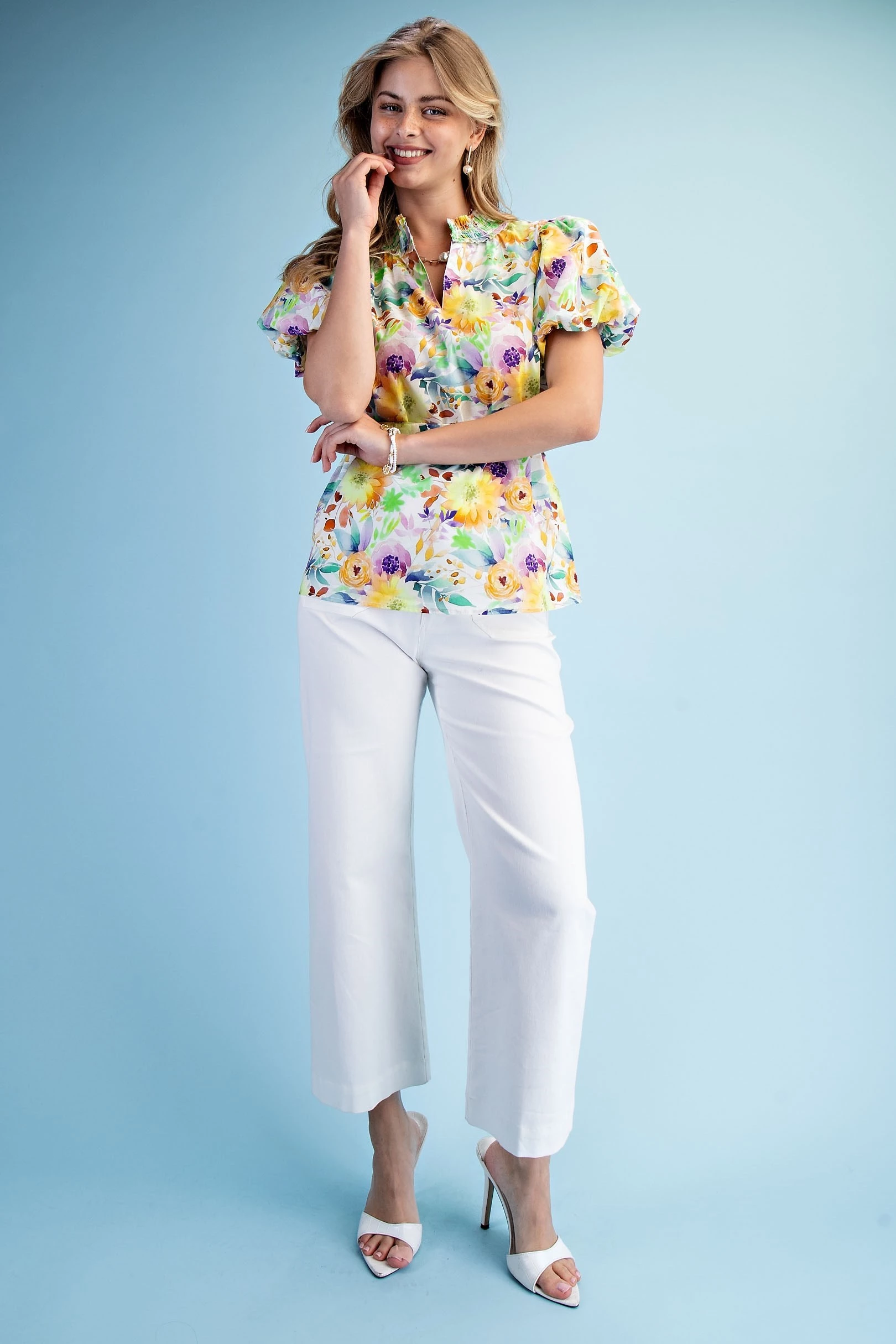 Floral 3D AppliquΓ© and Embroidered V-Neck Top with a Covered Button Placket and Elastic Banded Sleeves