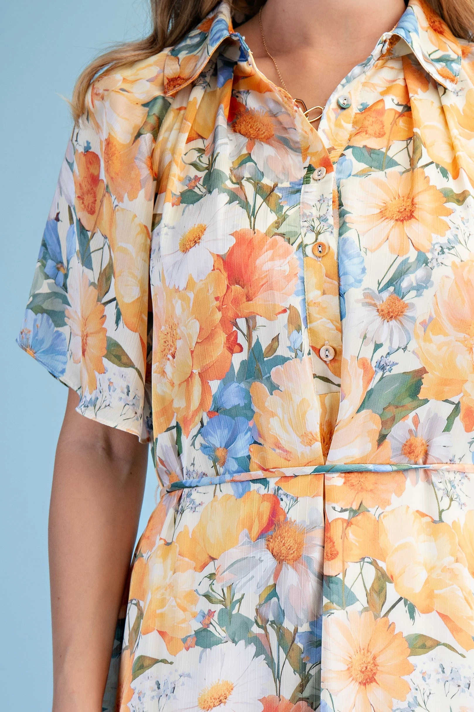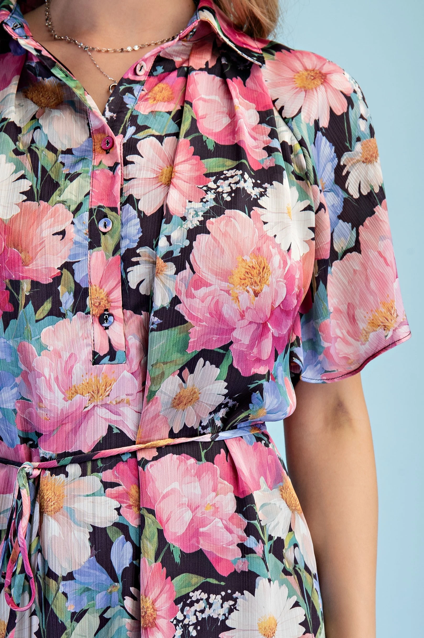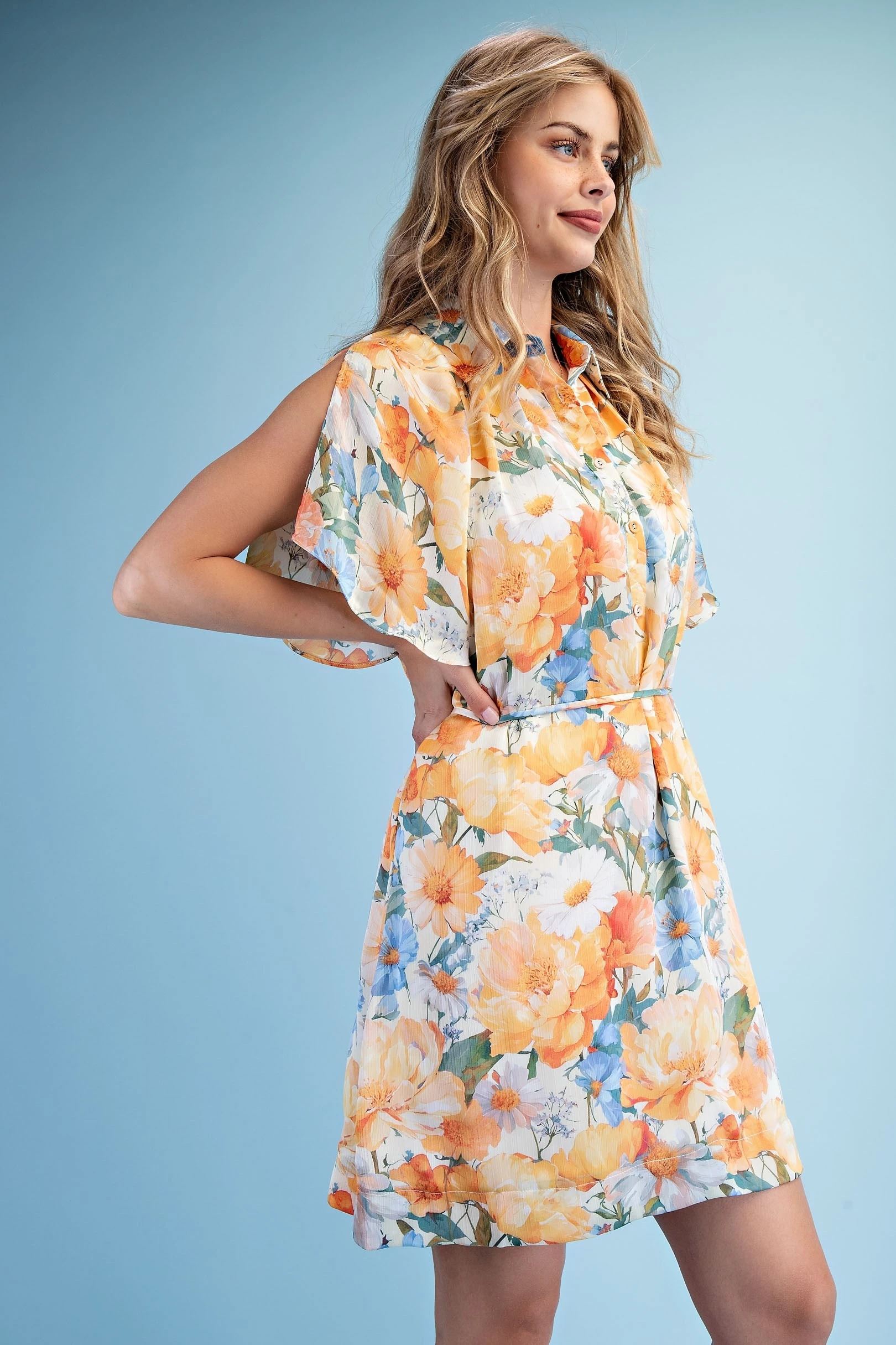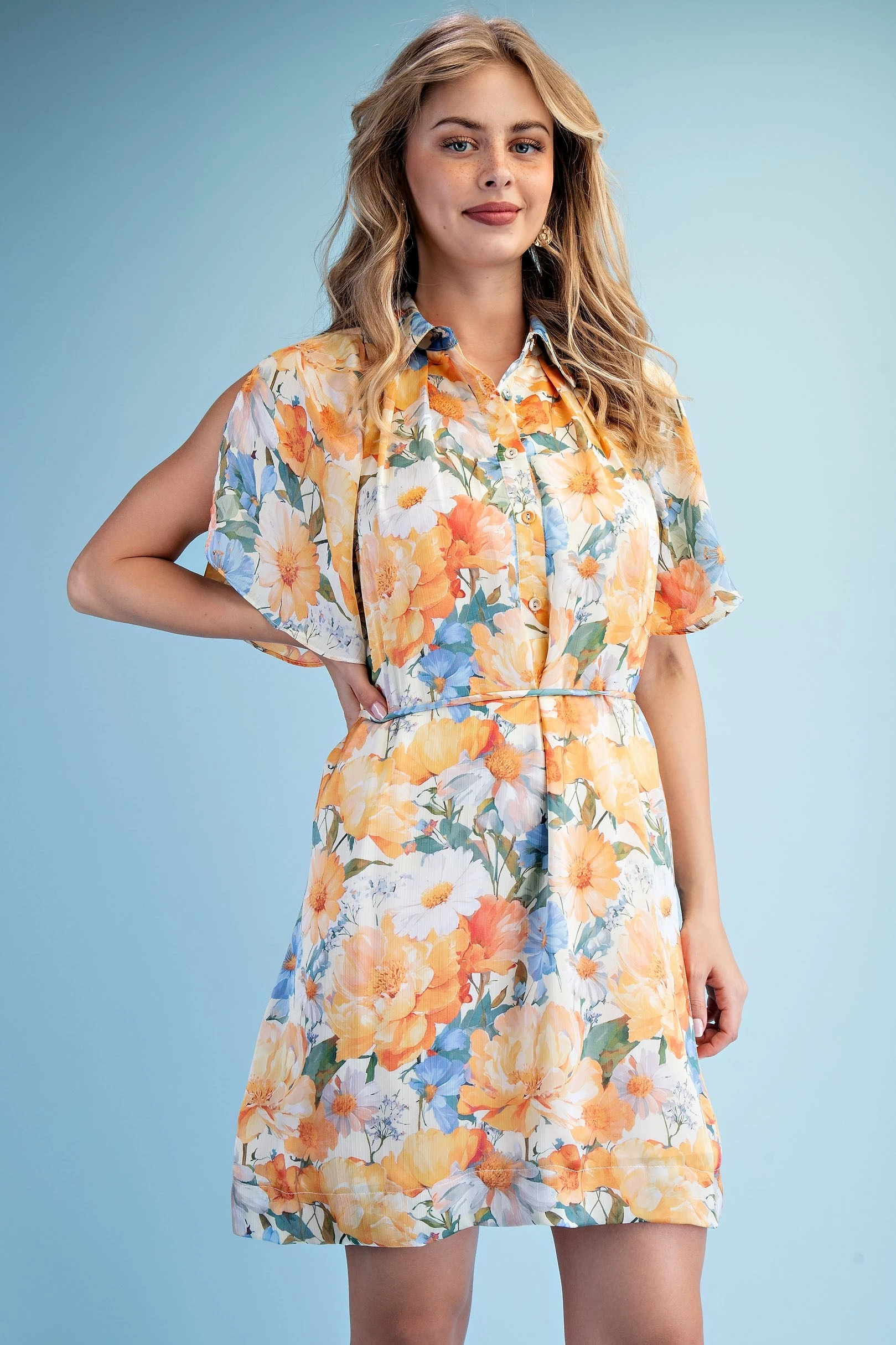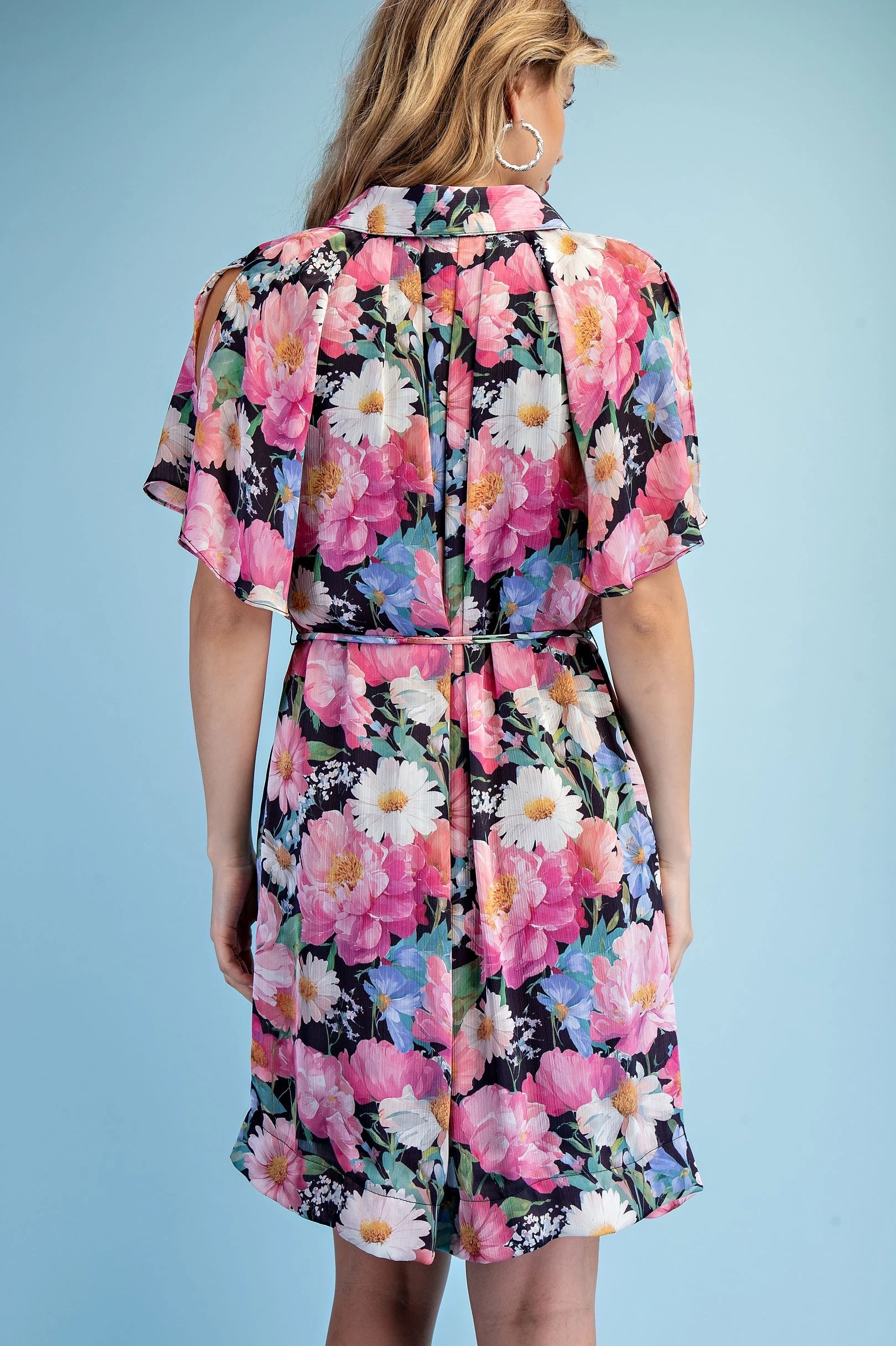 Floral Half Button Mini Shirt Dress with a Split Flutter Sleeve and Waist Tie. The Dress is Lined
