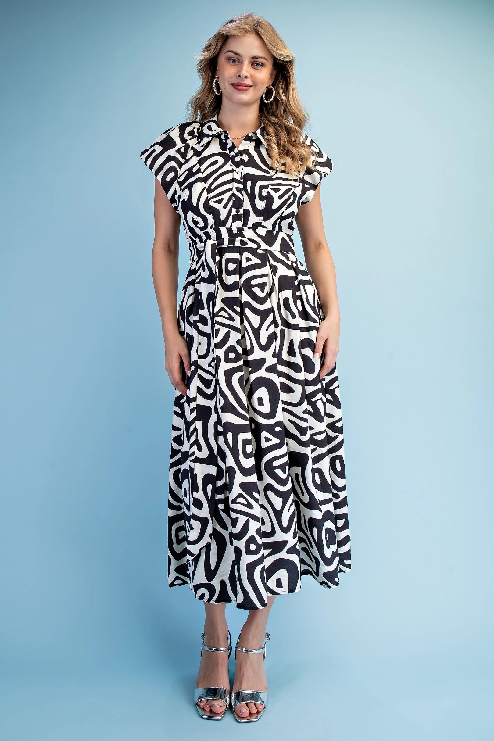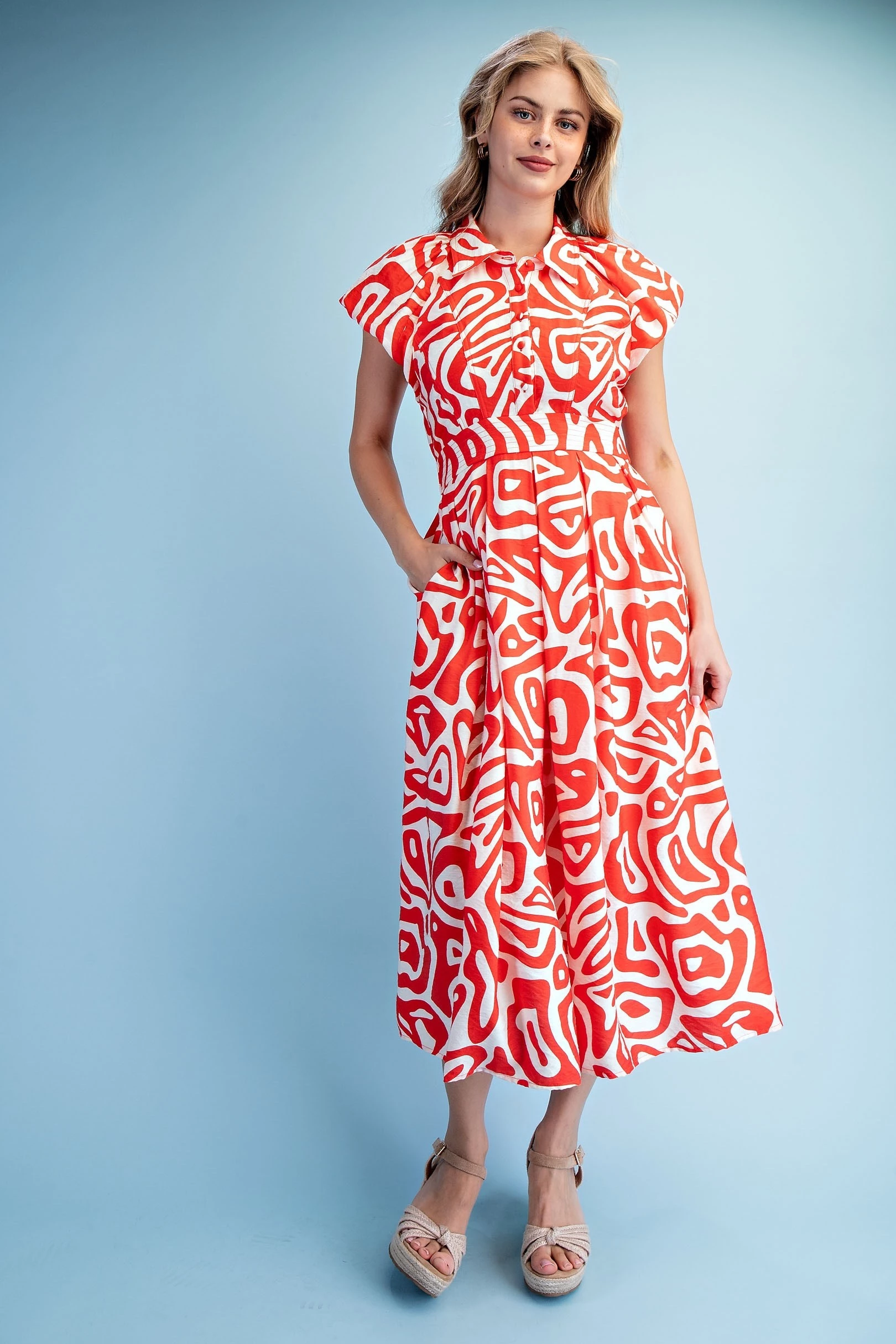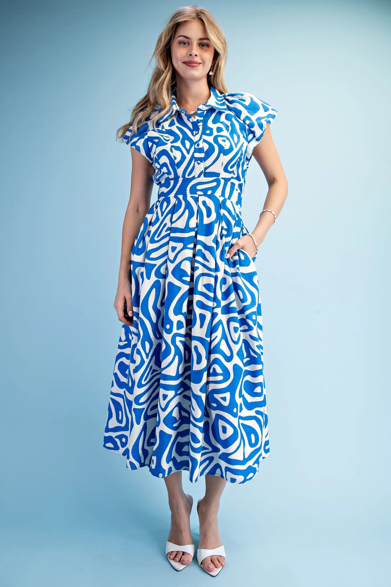 Printed Half Button Midi Shirt Dress with Trapunto Stitching and Back Elastic Waist. The Dress is Lined
